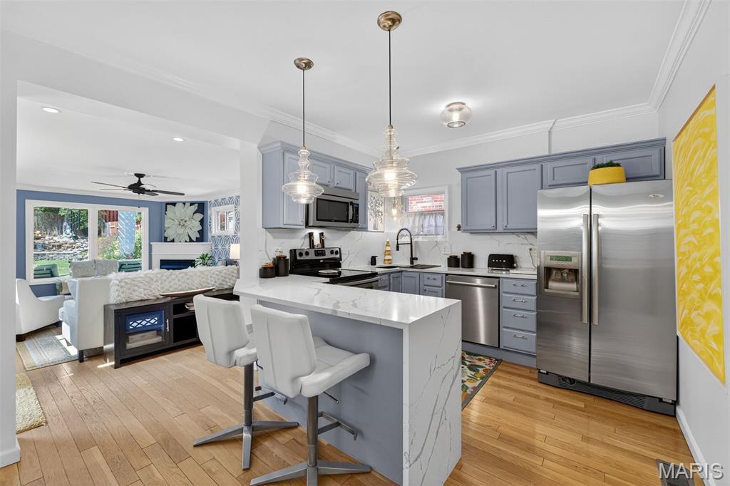 Charming brick curb appeal meets fully updated, modern living in the heart of sought-after Richmond Heights. This 3-bedroom, 2-bath home offers the perfect blend of character and contemporary style, with thoughtful upgrades throughout and truly move-in ready condition. Step inside to a bright, open layout designed for today’s lifestyle. The stunning kitchen features quartz countertops, a waterfall island with seating, stainless steel appliances, custom cabinetry, and designer lighting — creating a natural gathering space for everyday living or effortless entertaining. The kitchen flows seamlessly into the main living area, offering an open, airy feel filled with natural light. Three true bedrooms provide flexibility for family, guests, or a home office, while two full bathrooms add convenience rarely found in homes of this era. Updated finishes, neutral tones, and hardwood flooring throughout create a cohesive, polished look. Outdoor living is just as impressive. The beautifully landscaped yard and private pergola-covered patio extend your living space outdoors — ideal for morning coffee, weekend gatherings, or quiet evenings under the trees. The charming front elevation, mature landscaping, and tree-lined street enhance the welcoming neighborhood feel. Located just minutes from shopping, dining, parks, and major commuter routes, this home offers exceptional convenience to Clayton, Forest Park, and leading medical and university campuses including Washington University in St. Louis and Barnes-Jewish Hospital. Whether you are a first-time buyer, a growing household, or looking to right-size without sacrificing style, this home delivers the perfect combination of location, layout, and lifestyle. Move-in ready. Updated. Centrally located. A rare opportunity in Richmond Heights.