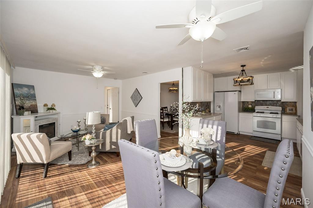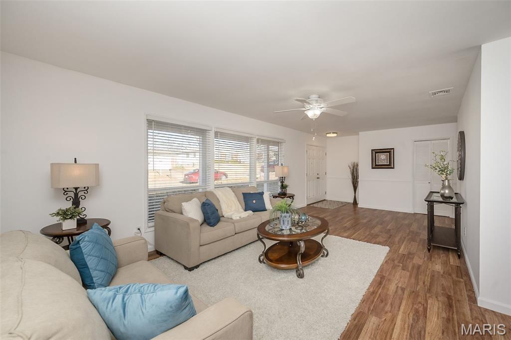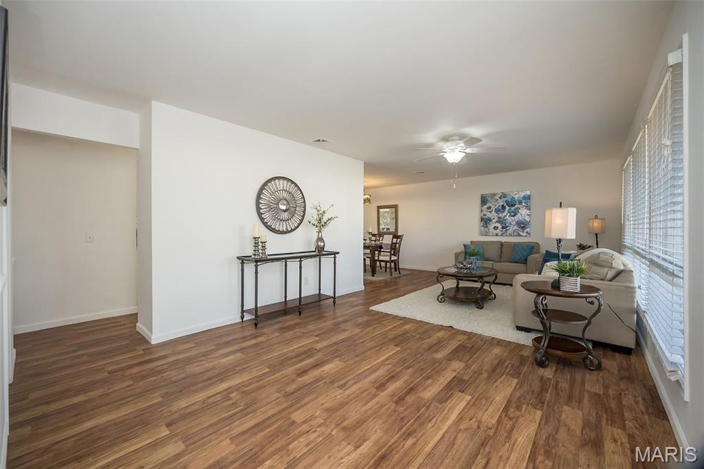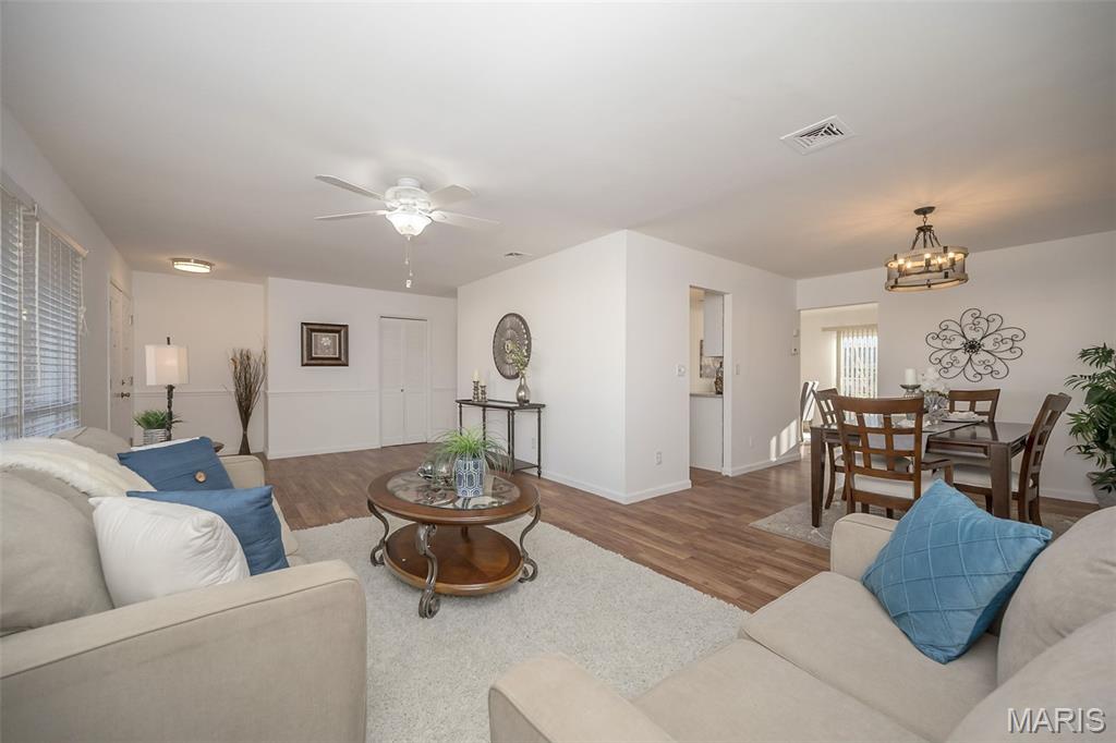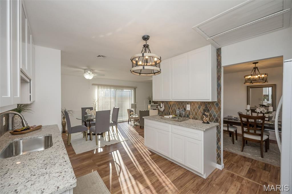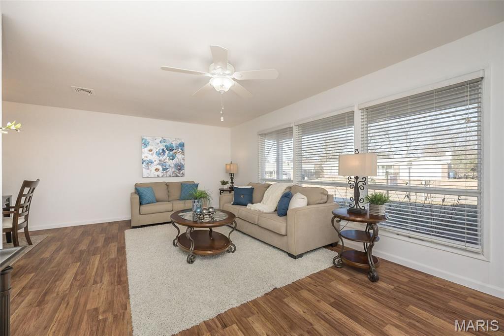 Ignore Days on Market as we are just now ready for showings after 21 days of being ACTIVE but not allowing showings yet. Showings will finally begin Friday Jan 9! And it's worth the wait!! We have a brand new roof and new siding to show off besides all the other wonderful NEWER features like flooring, kitchen cabinets and HVAC. Step into easy, comfortable living in this inviting no-steps ranch. The heart of the home is the bright, newer white kitchen with a striking real SLATE backsplash, opening directly into a warm and welcoming breakfast area/ family room with plenty of natural light —perfect for everyday living or casual gatherings. From here, step out to the patio and fenced yard for simple outdoor enjoyment. Luxury vinyl flooring ties together the main living areas, while all 3 bedrooms offer the softness of NEW plush carpet. A formal living room and separate dining room provide options for hosting, relaxing, or creating spaces that fit your routines. The primary suite includes an updated FULL bath with floor-to-ceiling glass block window and shower. The closet space is plentiful in this home and the bedrooms are generous. Besides the laundry room, there is a big storage room off the garage that will hold your holiday decor. The owner took pride in the landscaping in front & back yards. All of this sits in a neighborhood known for easy walks and a friendly, comfortable feel—an ideal setting for someone looking to downsize without giving up the living spaces that matter. Nothing to do here but move in, unpack and RE-LAX!! Amenities like the South County YMCA, Mercy South Medical Center, a Veterinary Hospital, Panera, Walgreens, Grocery stores, Vetta Sports Complex not to mention easy-peazy access to Highway 21, Highway 55, Highway 270/255. Everything you could need is less than 2 miles away.