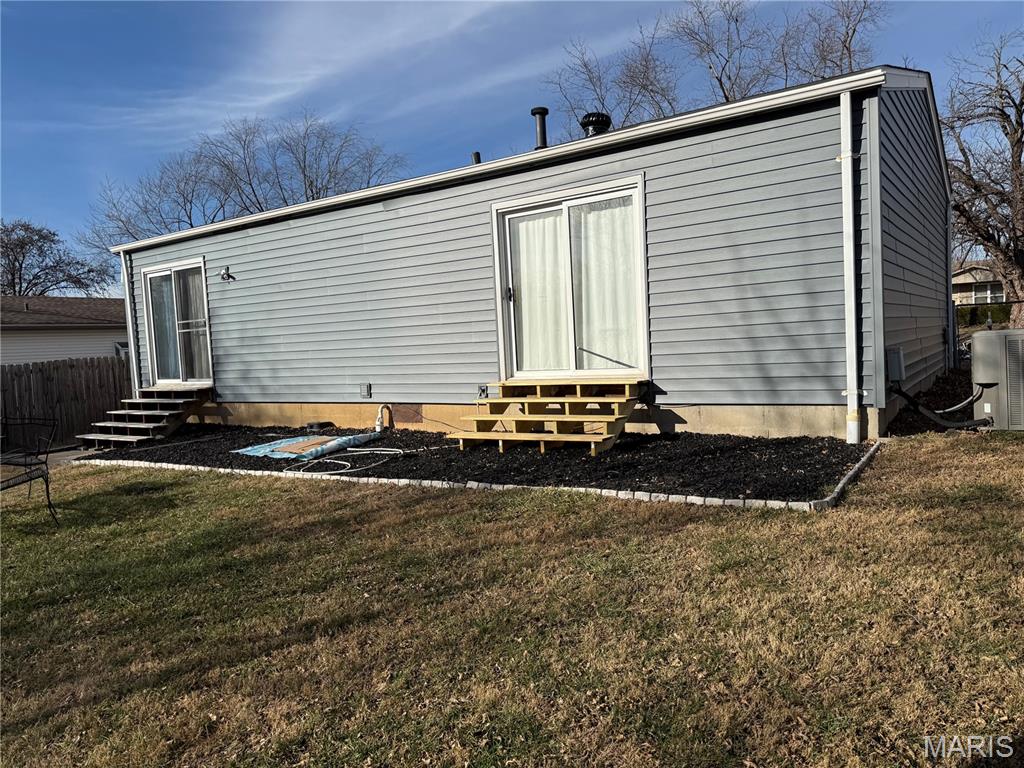 MOVE-IN READY & FULL OF UPDATES! This charming 3-bedroom, 1.5-bath home features a newer roof and vinyl siding for peace of mind. Step inside to a cozy vaulted family room, kitchen, and dining area filled with natural light from a large front window—perfect for everyday living or entertaining. The spacious kitchen offers abundant counter space, wood-grain laminate flooring, and a stylish tile backsplash, while the adjacent dining room includes a ceiling fan and sliding door that leads to the fully fenced backyard with a 12x10 utility shed for extra storage (which also has newer siding 1-26) The primary bedroom features its own sliding glass door—ideal for future patio access or even a hot tub retreat. The unfinished basement provides ample storage and endless potential for finishing, plus a convenient laundry area. Located just off Hwy K, you’ll enjoy quick access to Hwy 40/64, I-70, and the Page/364 Extension making commuting and daily errands a breeze.
