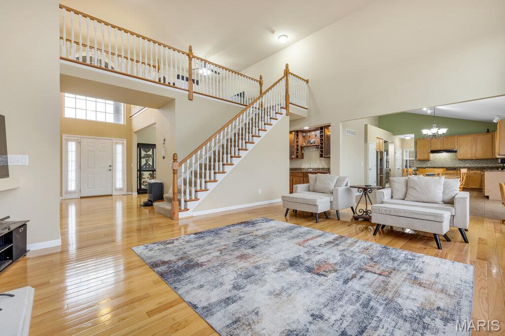 Exquisite Four-bedroom, 5.5-bath luxury residence nestled in the highly coveted Bainbridge subdivision. Offering approximately 4,625 square feet of impeccably Finished Living Space, this exceptional home blends refined elegance with thoughtful design at every turn. At the heart of the home is a Chef-Inspired Gourmet Kitchen showcasing 42-inch Custom Cabinetry, Granite Countertops, premium Stainless-Steel Appliances, a Double Oven, an Expansive Center Island, and a Built-in Planning Desk—designed to accommodate both intimate gatherings and grand entertaining. A Composite Deck seamlessly extends the Living Space Outdoors, enhanced with an Extended Poured Concrete Patio below the Deck. This gem features a New Roof and a Three-Car Garage, providing both peace of mind and convenience. The Main Level is highlighted by Rich Hardwood Flooring, a Formal Living Room, and an Elegant Separate Dining Room & Wine Bar ideal for hosting. The Dramatic Two-Story Great Room features Floor-to-Ceiling Windows that flood the space with Natural Light and a Striking Wood-Burning Fireplace, creating a warm yet sophisticated atmosphere. The Main-Floor Primary Suite serves as a Private Retreat, complete with a Spa-Inspired Bath featuring Double Vanities, a Soaking Tub, a Separate Shower, and Two Generous Walk-in Closets. Upstairs, a beautifully appointed Sitting Area anchors Three Additional Spacious Bedrooms, Three Full Baths, ensuring comfort and privacy for family and guests alike. The Fully Finished Lower Level elevates entertaining to the next level with Multiple Flex Spaces, including a Recreation Room, Sleeping Area, Family Room, & Media Room. In addition, the Lower Level is complemented by a Full Bath, Custom Wet Bar, & Kegerator—perfect for hosting unforgettable evenings. This remarkable home offers Timeless Architecture, Luxurious Finishes, and Exceptional Functionality—all set within one of the area’s most prestigious communities. A MUST SEE!