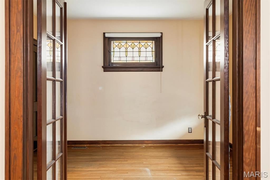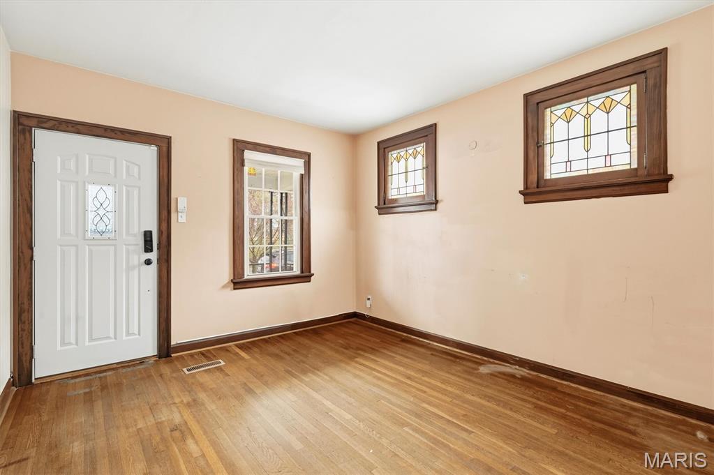 Charming 1.5-story home offering 3 bedrooms, 1 full bath, and 1,300+ sq ft of living space with outstanding potential for a third bedroom and second bath. Timeless character is preserved throughout with original hardwood floors and millwork, solid wood doors with vintage hardware, and beautiful stained-glass windows. The inviting covered front porch opens to a spacious living room and a main-floor primary bedroom featuring French-door entry and an extended closet. The expansive eat-in kitchen boasts 48" custom cabinetry with pull-out drawers, a movable center island, double sink, and a classic built-in hutch. NEW Kitchen appliances include dishwasher and Garbage Disposal but cant forget the refrigerator, smooth-top electric range/oven, and built-in microwave. The kitchen flows into the family room and walks out to a bright sunroom. The full updated bath is finished with marble flooring, sconce lighting, and a tub/shower surround. Upstairs you’ll find a generous bonus room suitable for a third bedroom or office, plus plumbing access for a future second bath. Enjoy outdoor living in the large backyard with patio and off-street parking.The HVAC was replaced 10/24. This home blends historic charm with functional living spaces and future upside don’t miss the opportunity to make it your own.