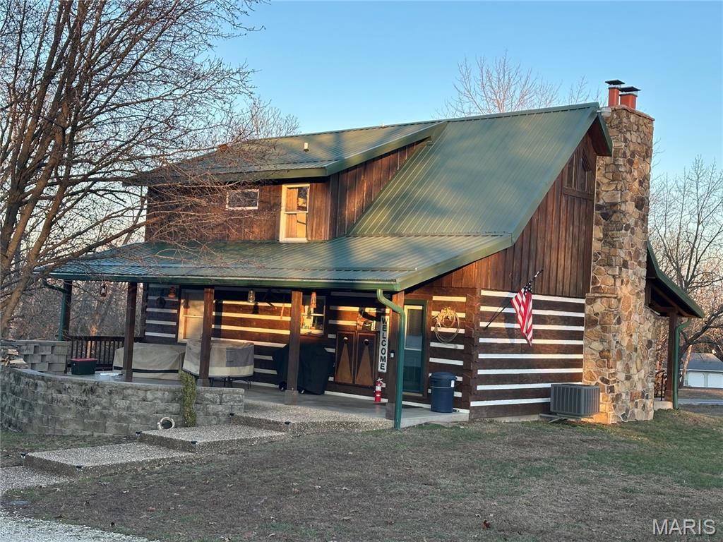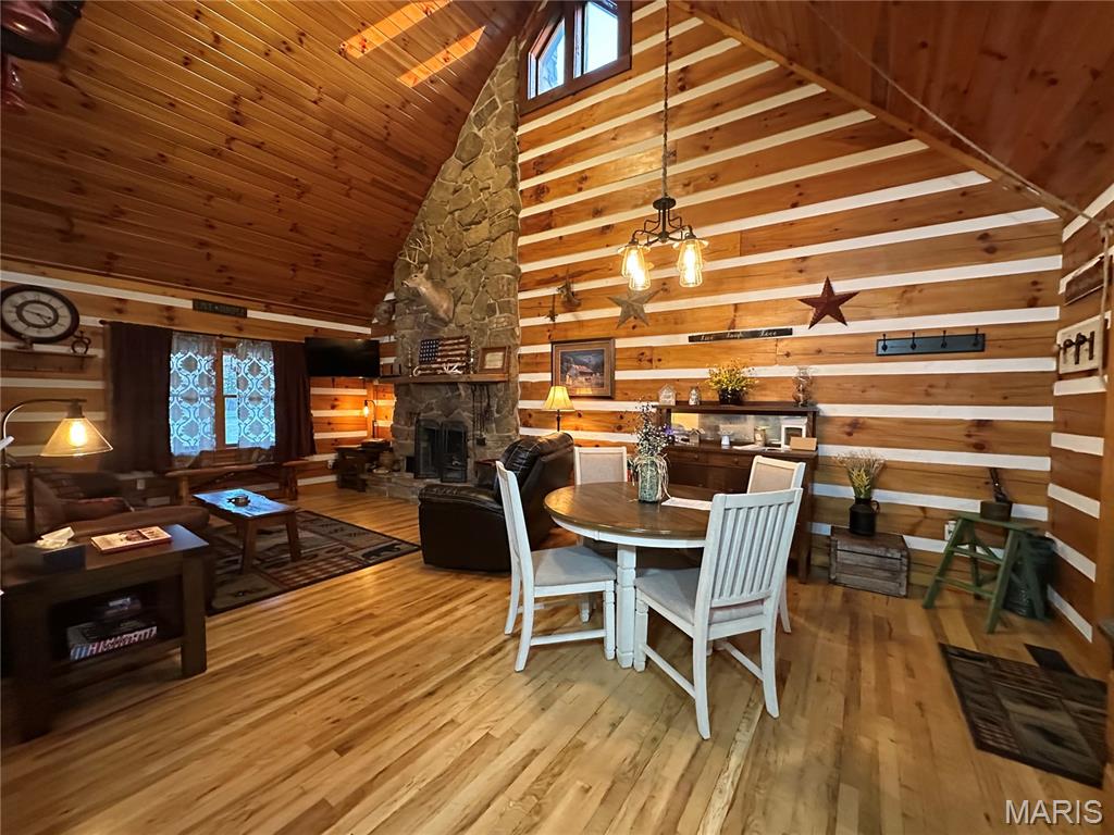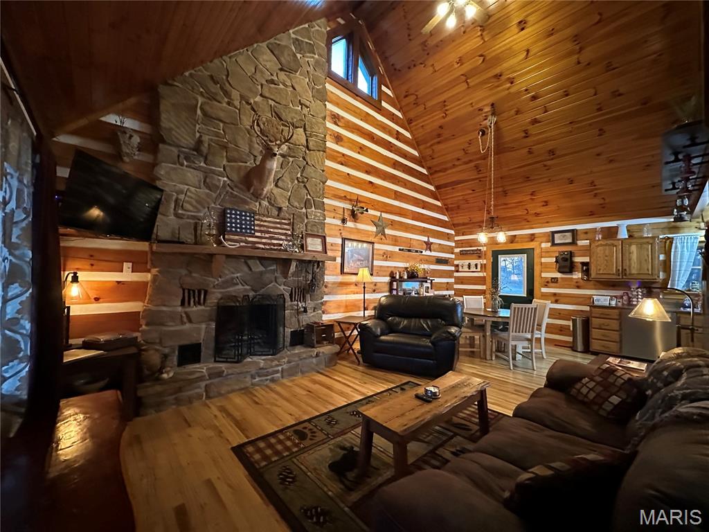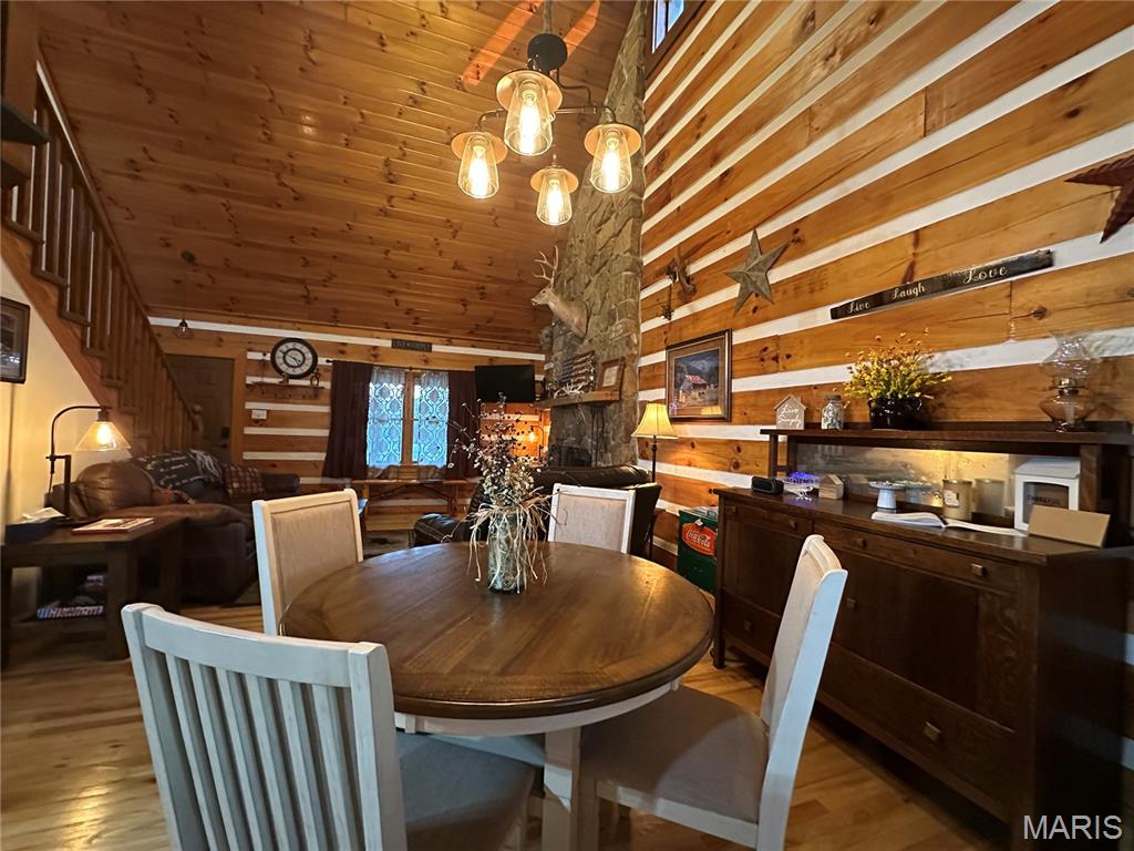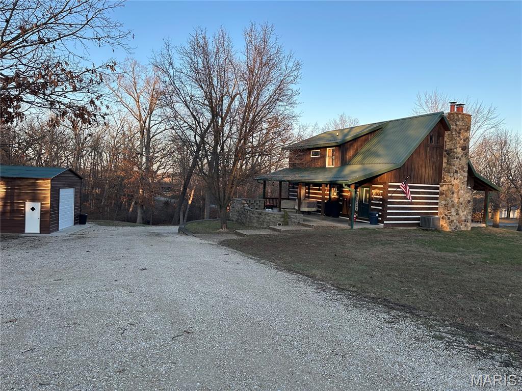 Meticulously cared for 1½-Story Log Home on 5.90 Picturesque Acres, currently operating as a successful Airbnb and offered Fully Furnished. This stunning cabin features 12" x 9" exterior hand-hewn tongue-and-groove logs with framed interior walls. The Great Room showcases an amazing two-story stone wood burning fireplace, soaring vaulted ceilings lined with beautiful 6" tongue-and-groove wood planks, and gorgeous wood flooring throughout. The primary suite offers a spacious bath with heated tile floors and a walk-in closet. The kitchen features newer appliances and flows seamlessly into the living space—perfect for entertaining. Additional highlights include custom baths, a high-efficiency heat pump, solid pine 6-panel doors, and exceptional craftsmanship throughout. The finished lower level includes a second kitchen, family room, recreation area, half bath, and a den/office space, offering flexible living or guest accommodations and walks out to a covered patio w/hot tub and counter bar, great for entertaining. Enjoy the outdoors from the covered front and back porches, surrounded by gorgeous landscaping. The property also features an aggregate patio and walkway—ideal for relaxing or hosting guests. Outbuildings abound, including a 50' x 30' shop with living quarters, a barn with hay loft, chicken coop, metal storage building with concrete floor, carport with RV hook-up, and a stocked pond. Horse lovers and animal enthusiasts will appreciate the space and versatility this property provides. Whether you’re looking for a private retreat, hobby farm, or an income-producing short-term rental, this exceptional property offers it all—just minutes from town conveniences.