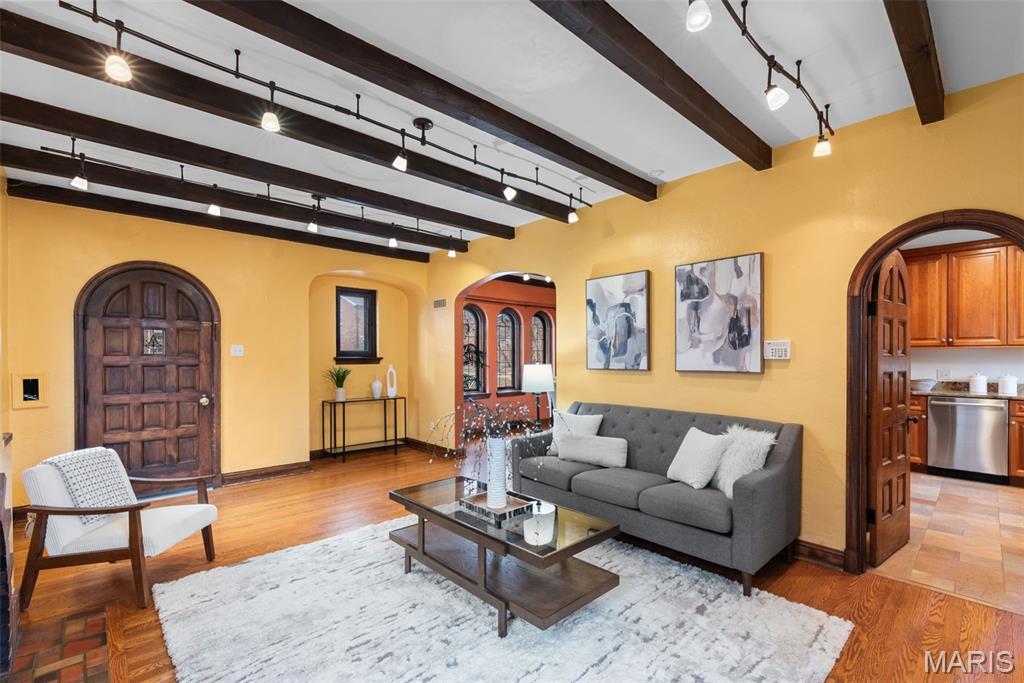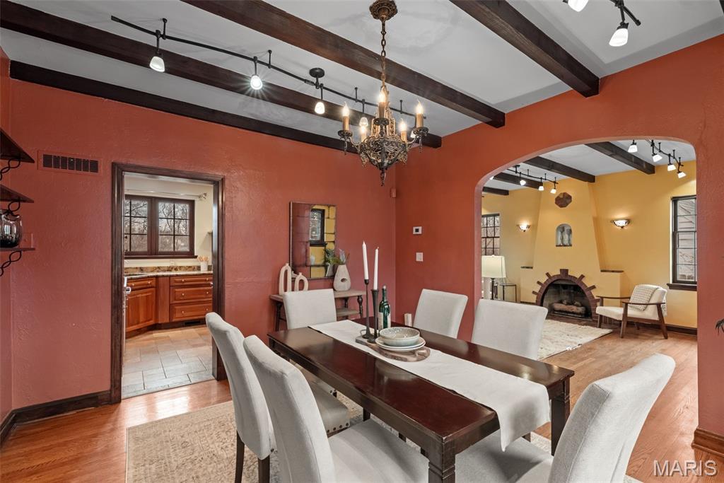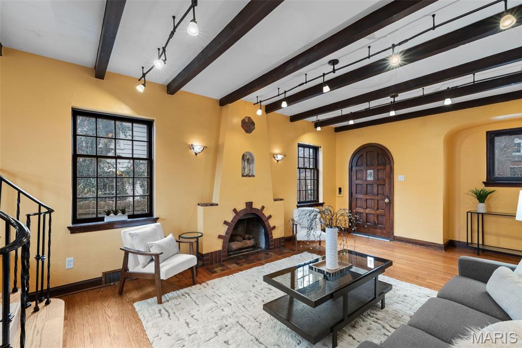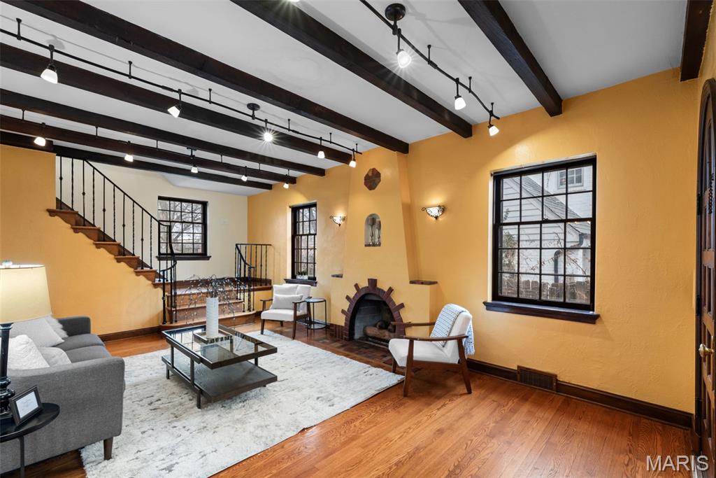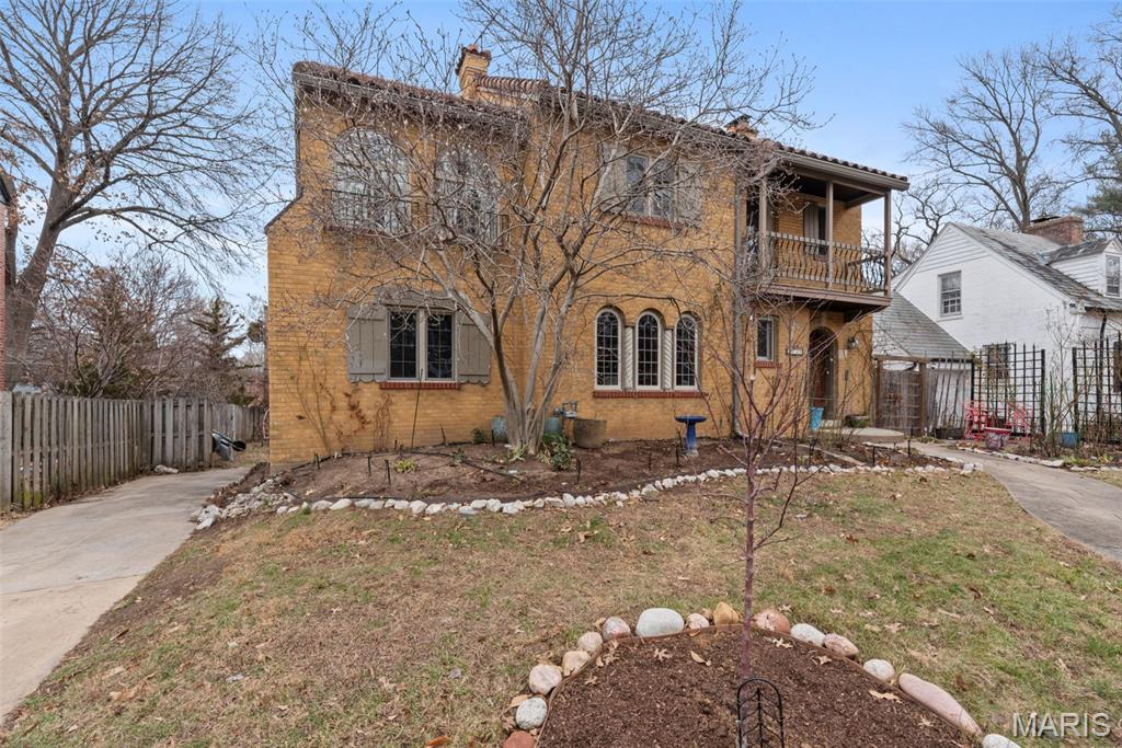 Quintessential University City home with modern updates throughout for today's living. As you approach from the driveway, you won't miss the mature perennial flower gardens encompassing the lush landscaping, including brick-friendly climbing roses! This 3 bedroom, 2.5 bathroom, all brick 2-story oozes character and charm from every room. Enter through the original 10-panel curved front door into the living room highlighted by dramatic wood beams, arched fireplace and doorways, and rear staircase with wrought iron railing. The dining room showcases a chandelier original to the house. The kitchen has been updated with custom cabinets, granite countertops, gas range with hood and R/O water filtration. Private main floor den/library with brand new carpeting, a full bath and laundry makes for a perfect WFH office. Upstairs are 3 generously sized bedrooms, with custom ELFA closet systems, and a connecting sunroom offering a playroom for kids, or a place to relax and escape into a book. Full hall bathtub was reglazed prior to listing. Partially finished basement provides a carpeted recreation room with a gas fireplace, updated lighting and cabinetry. Newer HVAC was installed in 2019. Out back is a privacy fenced yard, spacious deck and raised-bed gardens for herbs and vegetables. This gorgeous home is located on a highly desirable neighborhood surrounded by well kept historic homes and won't be available for long. Open House Sunday 1/25 1-3pm.