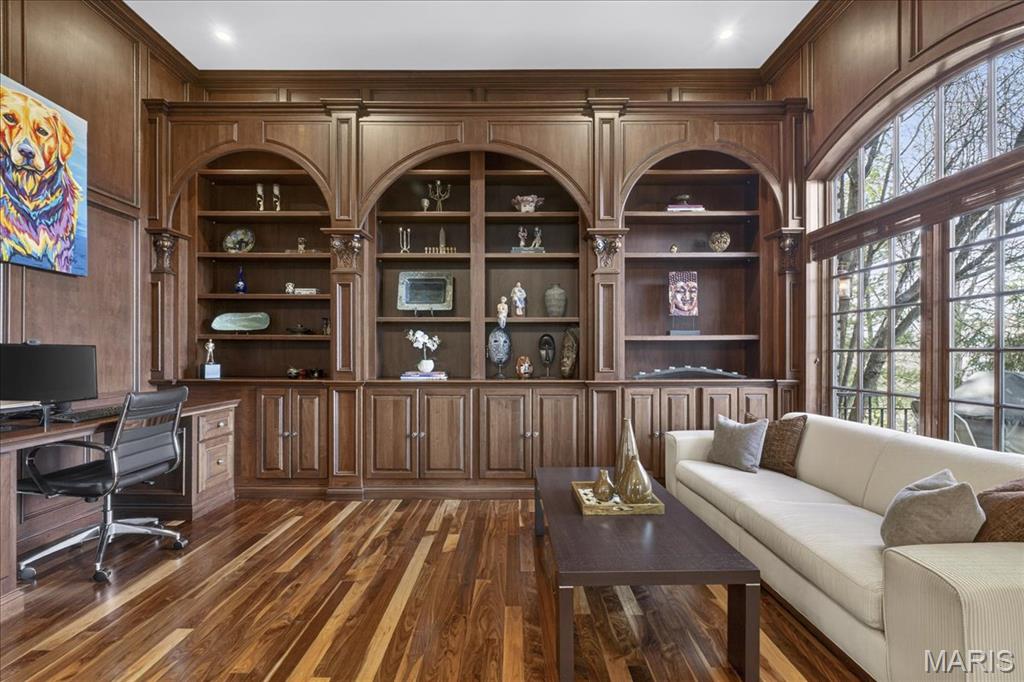 Luxury villa living at its finest in this stunning 1.5-story residence, thoughtfully designed with exceptional craftsmanship and upscale finishes throughout. Enter to find rich walnut hardwood floors spanning the main-level common areas and a light-filled formal dining room framed by expansive windows. The kitchen is truly spectacular, featuring granite countertops, custom cabinetry, a generous center island, and top-of-the-line appliances, including double ovens, two dishwashers, a gas cooktop, and a built-in refrigerator. An adjoining breakfast room and a private butler’s pantry provide both everyday comfort and effortless entertaining. The impressive great room showcases soaring 12-foot ceilings, a gas fireplace flanked by custom built-in bookcases, and sliding doors that open to the screened-in porch and deck with gas grill hook-up. The space flows seamlessly into a private office adorned with custom built-ins and exquisite millwork. The main-level primary suite offers a peaceful retreat with a tray ceiling, large bay window, and a luxurious en-suite bath complete with dual vanities, a soaking tub, walk-in shower, and a spacious walk-in closet with custom organizers. A laundry room and stylish powder room complete the main level. Upstairs, you’ll find a versatile loft space, two generously sized bedrooms, each with an en-suite full bath. The walk-out lower level is equally impressive, featuring a spacious family room with a gas fireplace, walk-behind wet bar, and sliding doors leading to a glass-encased patio. Additional lower-level highlights include a media room with built-in speakers, an exercise area, wine cellar, a bedroom, and a full bath. Additional features include 8-foot solid wood doors throughout, 8-room custom sound system, a custom-finished two-car garage, three-zoned HVAC, and the privacy of a gated community. Enjoy the perfect blend of luxury, comfort, and convenience with low-maintenance villa living.