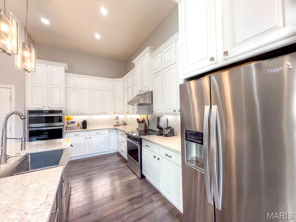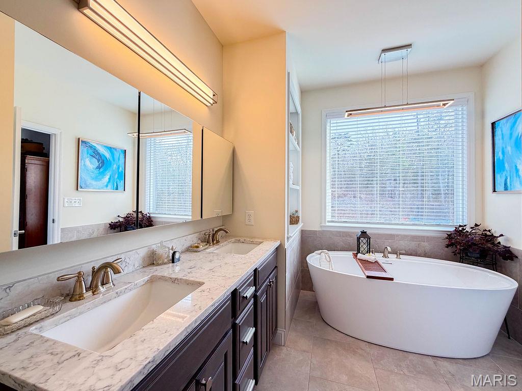 Situated on the largest lot in the subdivision, this beautifully designed home offers an exceptional blend of modern comfort, thoughtful upgrades, and versatile living space. A striking exterior with stone accents, mixed siding, and warm wood-tone garage doors creates strong curb appeal, while the oversized driveway and attached garage provide everyday convenience. Inside, the open-concept main level is filled with natural light and showcases high ceilings, wide-plank flooring, and a seamless flow ideal for both entertaining and daily living. The chef’s kitchen is the centerpiece of the home, featuring ceiling-height white cabinetry, expansive solid surface countertops, stainless steel appliances, built-in wall oven, designer range hood, and a large center island with seating. Pendant and recessed lighting enhance the clean, modern aesthetic. The kitchen opens to a spacious living area anchored by a gas fireplace and a wall of windows overlooking the backyard. Just off the main living space, a bright screened-in porch provides the perfect spot to relax and enjoy the surrounding views year-round. The primary suite offers a peaceful retreat with a tray ceiling, ceiling fan, and generous space. The en suite bath includes a double vanity with solid surface counters, a freestanding soaking tub, a walk-in tiled shower with glass enclosure, and a large walk-in closet with custom shelving. The finished lower level expands the living space significantly, offering a large family/rec room ideal for entertaining, games, or media space, along with ample storage. With approximately 75% of the basement finished, this level adds flexibility for a variety of uses. This home offers a total finished living area of approximately 3,360 square feet. A rare combination of style, functionality, and finished space—designed for today’s lifestyle and ready to impress.