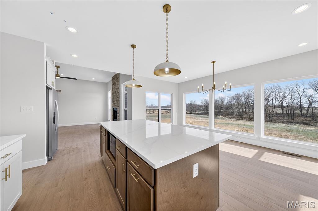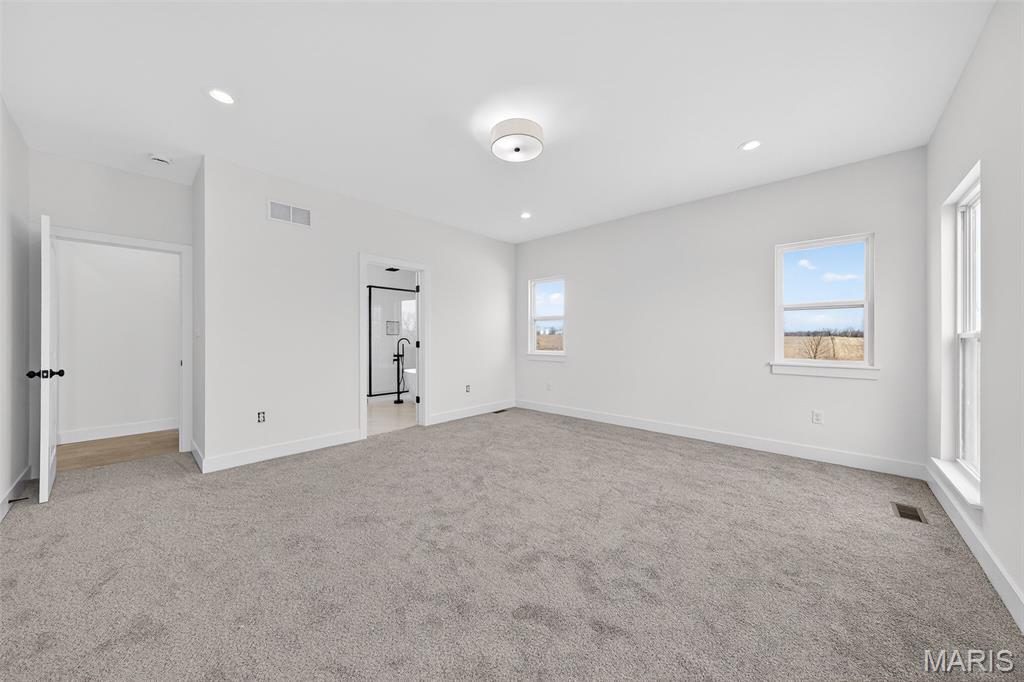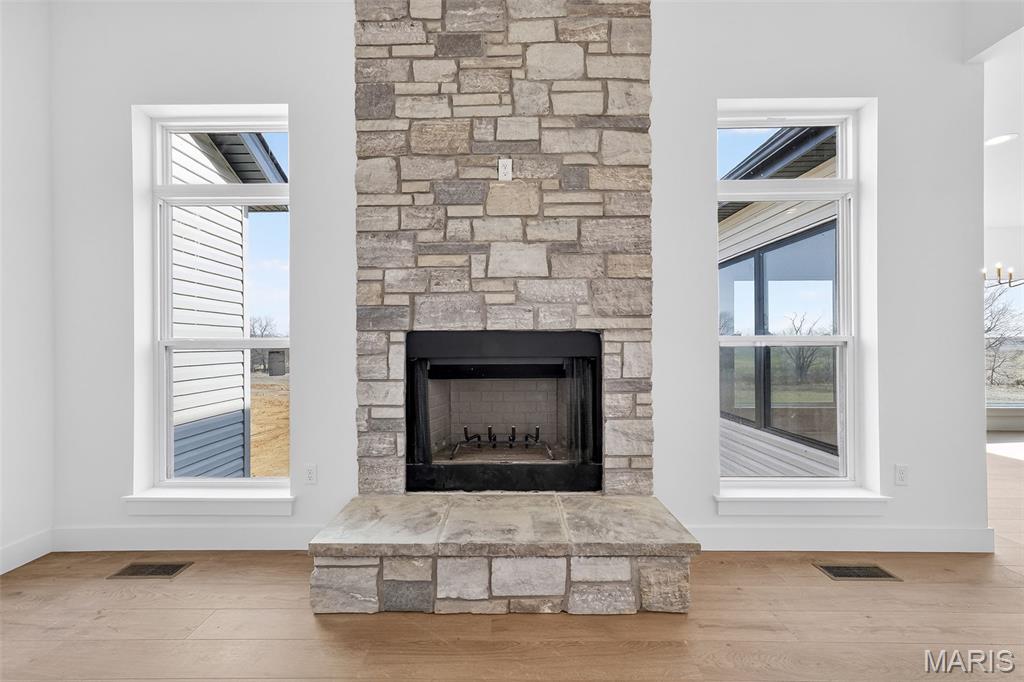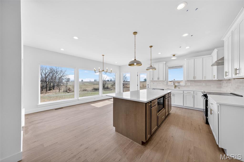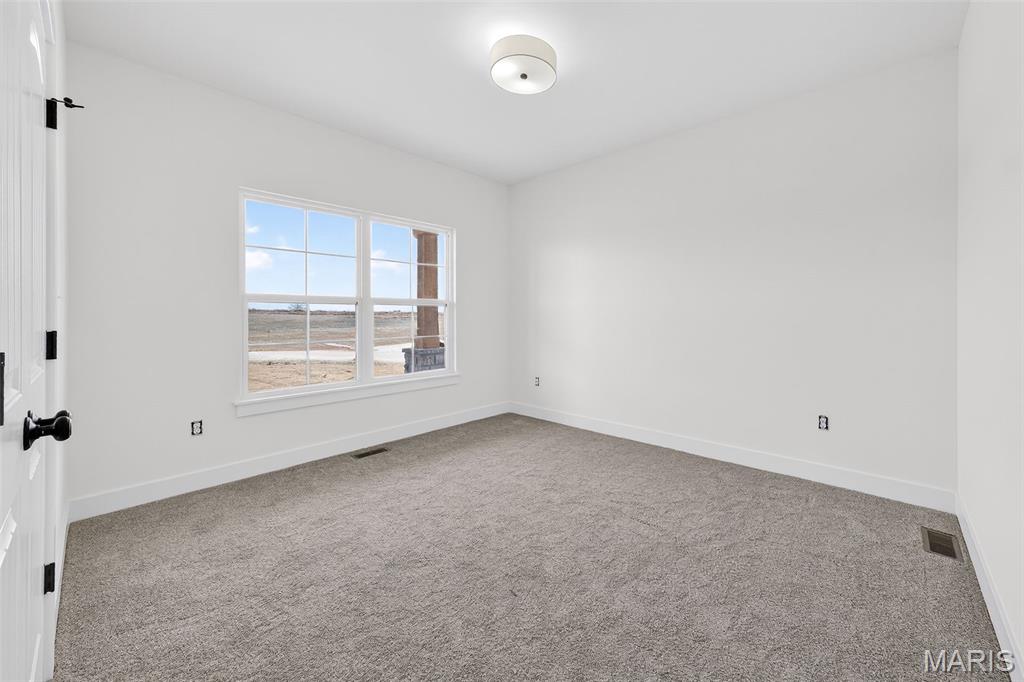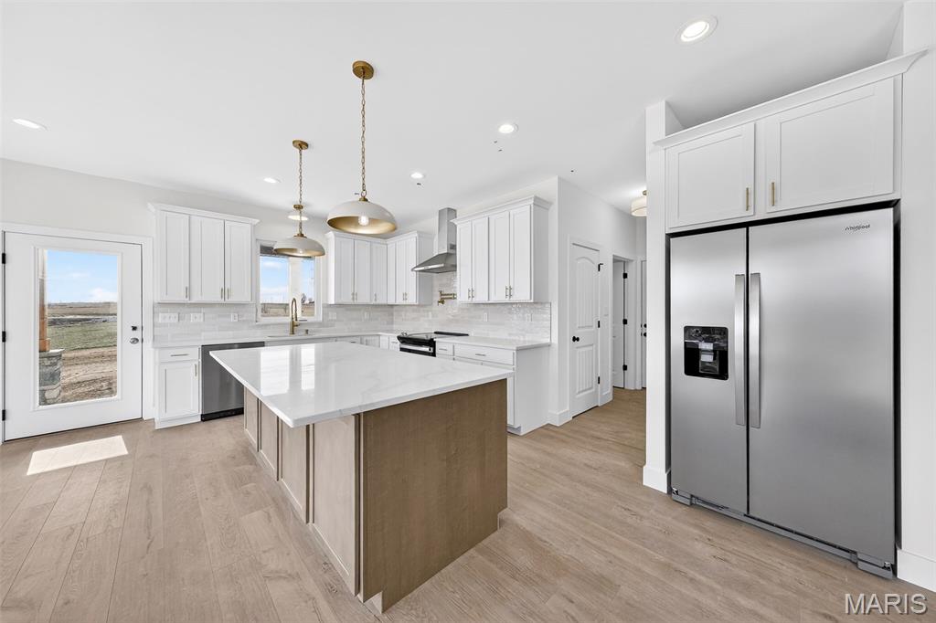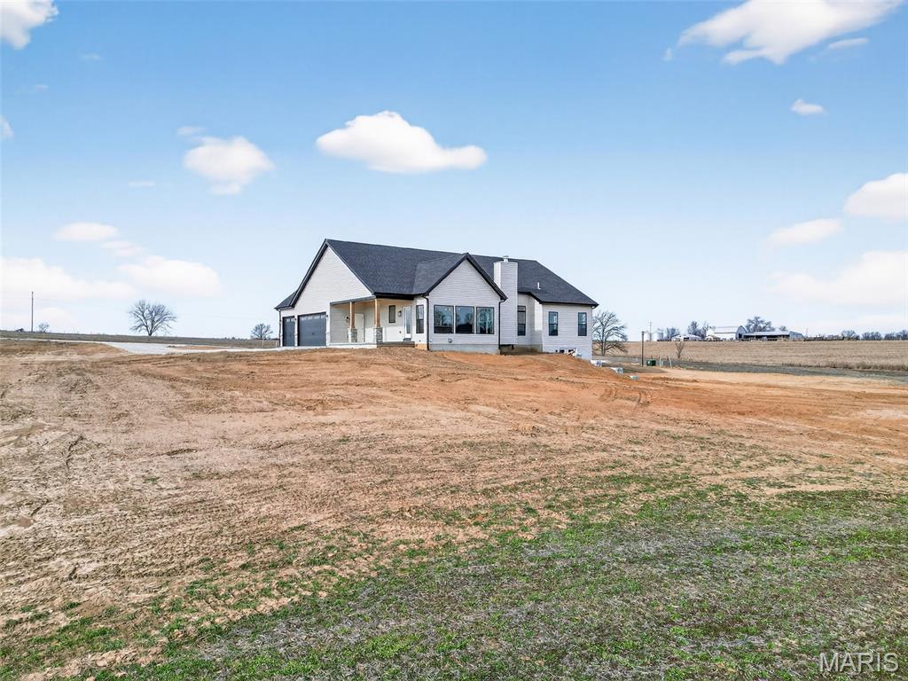 Stunning new construction ranch offering modern farmhouse style and thoughtful design throughout. This open-concept home features a bright, airy kitchen with a large center island, quartz countertops, custom cabinetry, and stylish pendant lighting—perfect for entertaining. Expansive windows flood the living and dining areas with natural light and showcase peaceful country views. The private primary suite includes a spa-like bath with a freestanding soaking tub, walk-in tiled shower, and sleek matte black fixtures. Quality finishes include wide-plank flooring, contemporary lighting, and neutral tones throughout. Inviting covered front porch, stone accents, and timeless exterior details complete the curb appeal. Enjoy the perfect blend of modern comfort and serene surroundings—move-in ready and built to impress. The streets will have asphalt this spring! 10 Year structural home warranty provided!