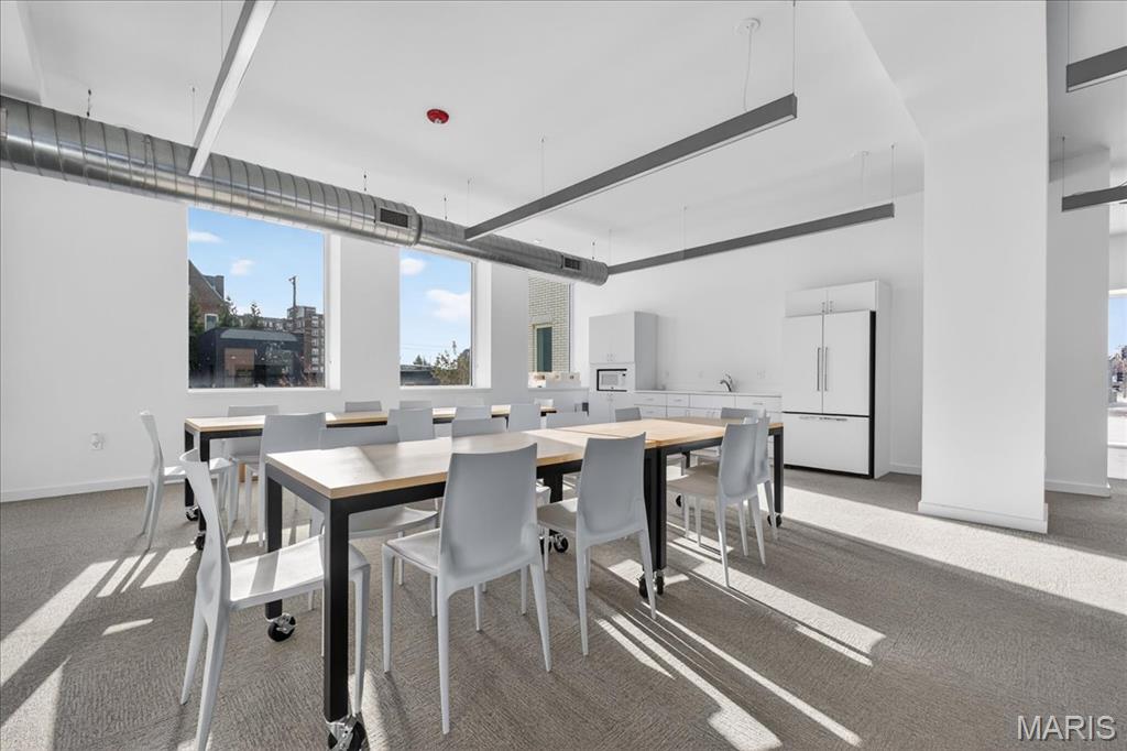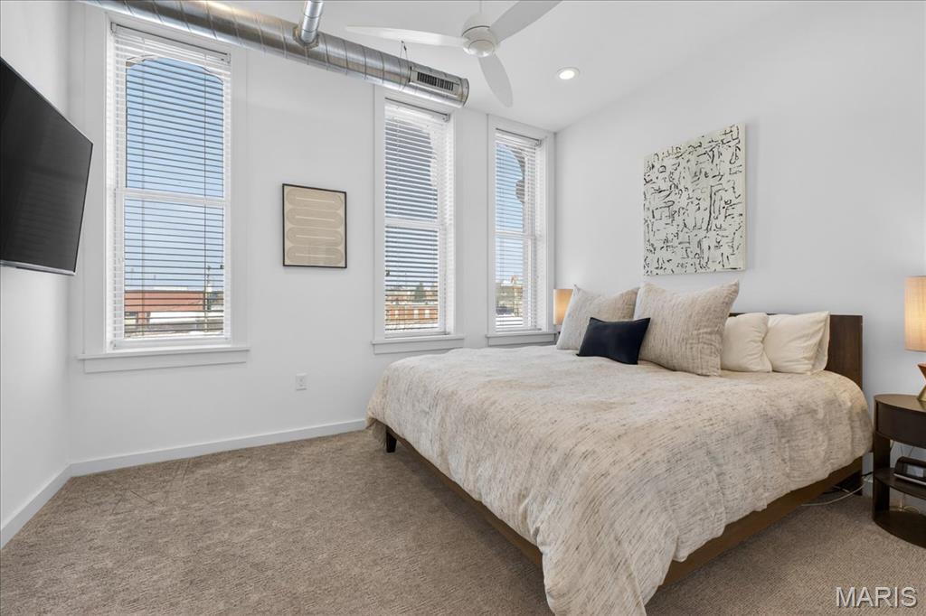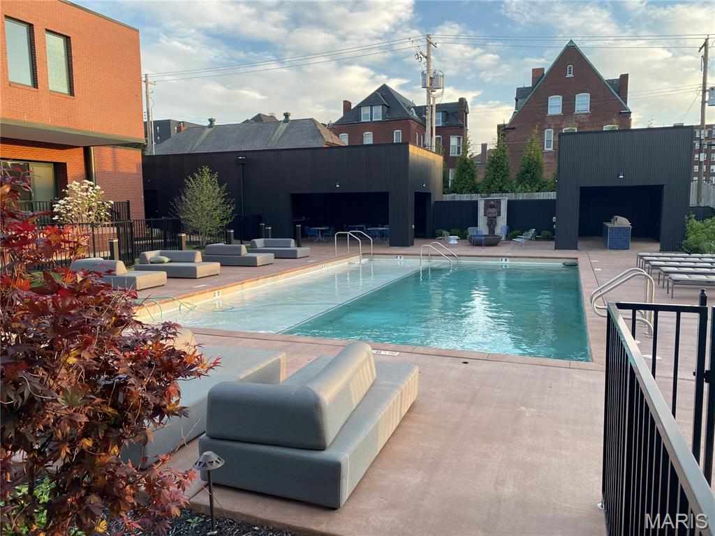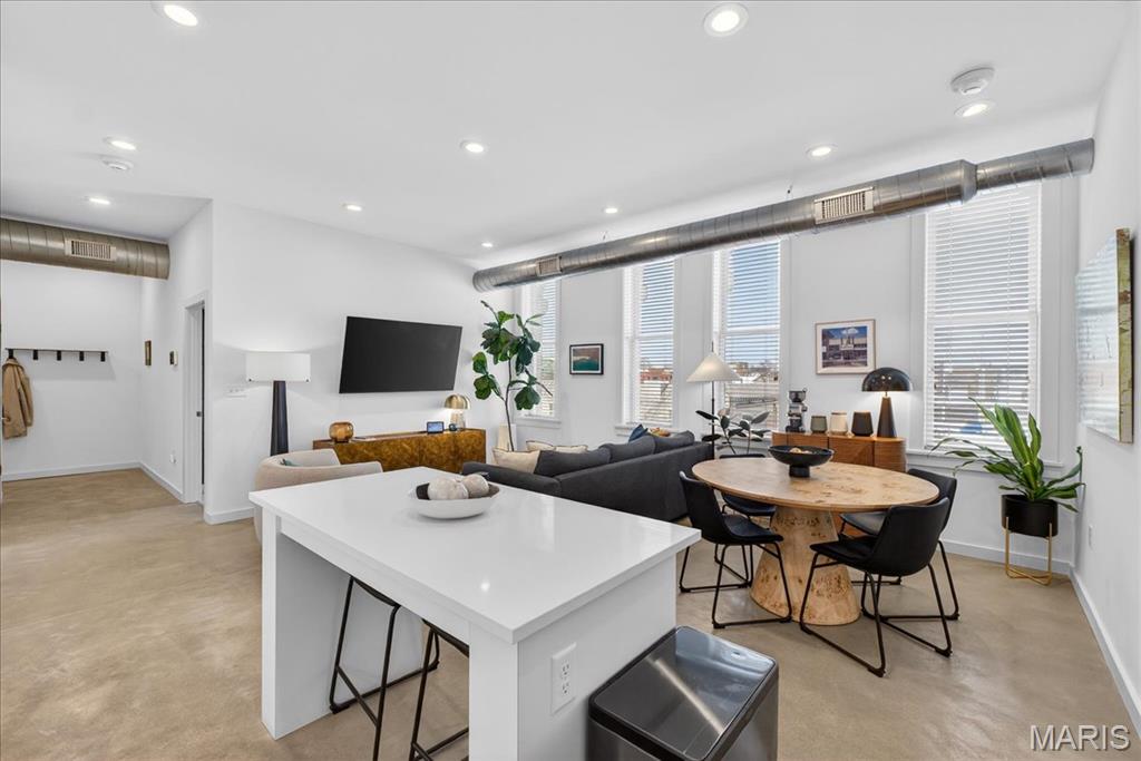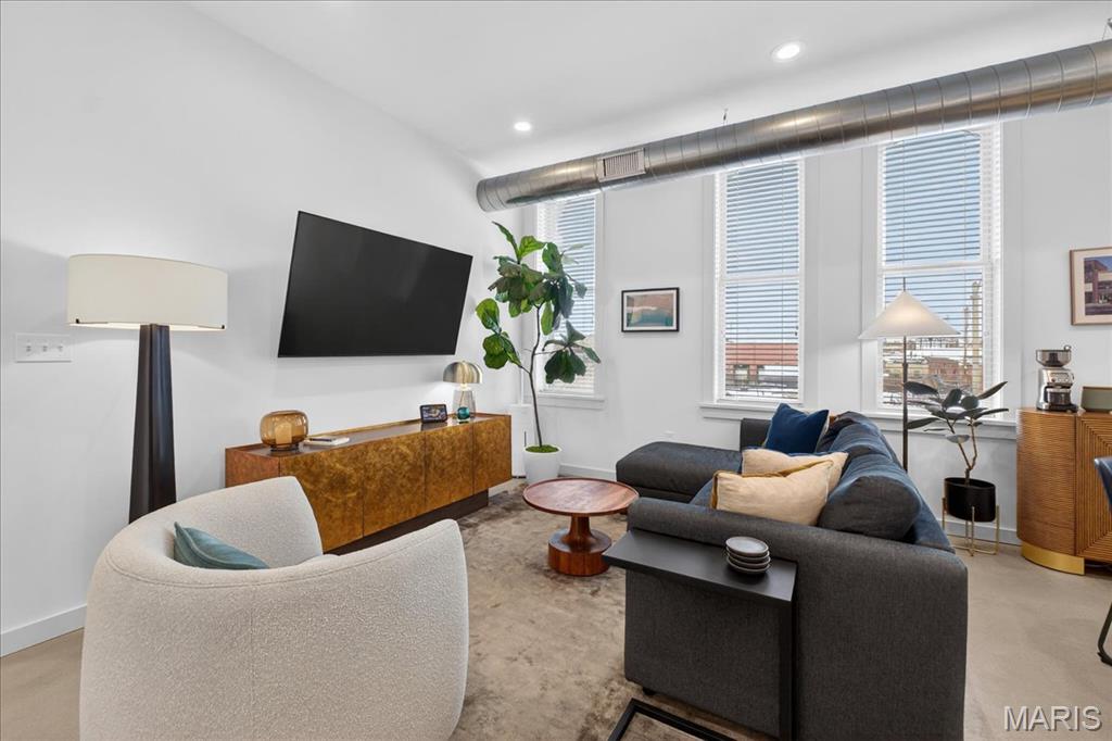 Welcome to your serene oasis at 3842 Unit 2A – one of only two condos crowning the historic Wolfner building in the On Olive community. Built in 2020, this modern home pairs the character of a vintage shell with a bright, contemporary interior. Step inside to a light-filled open plan: concrete floors, quartz countertops and GE Cafe appliances create a polished backdrop while north-facing windows bathe the living area in natural light. Two bedroom retreats are positioned for privacy, yet the generous living-dining space flows effortlessly for gatherings. Custom closet build-outs offer smart storage, and the mounted TVs in bedrooms and custom dining table stay with the home. A secure elevator brings you directly to your door, and your garage spot sits conveniently beside the pool. The HOA covers water, internet, trash, sewer and roof maintenance, giving peace of mind and low monthly costs; even the tax abatement keeps the property tax bill minimal. Beyond your doorstep, the community beckons with a gym, edible garden, dog run and lush private parks linked by meandering paths. Enjoy the resort-style pool with tanning deck, fire pit and grilling cabana, or walk to The Foundry, Alamo Drafthouse Cinema, the Contemporary Art Museum, Fox Theatre and numerous restaurants. Experience a blend of urban convenience, nature and community – an invitation to live beautifully in the heart of St. Louis.