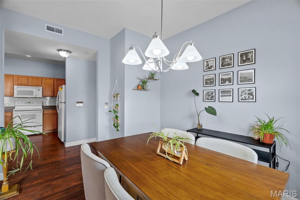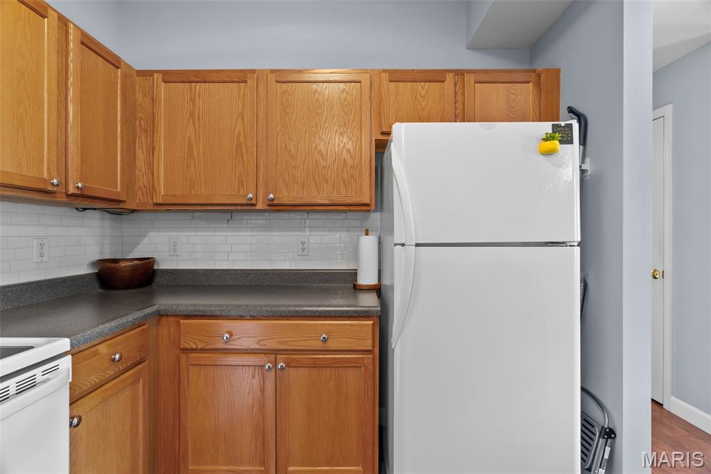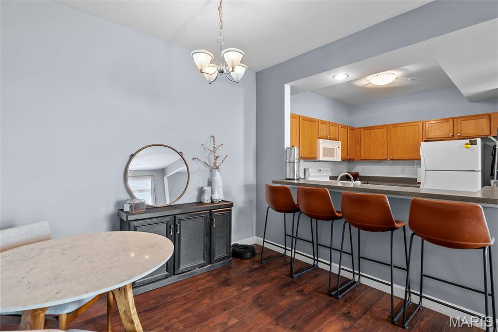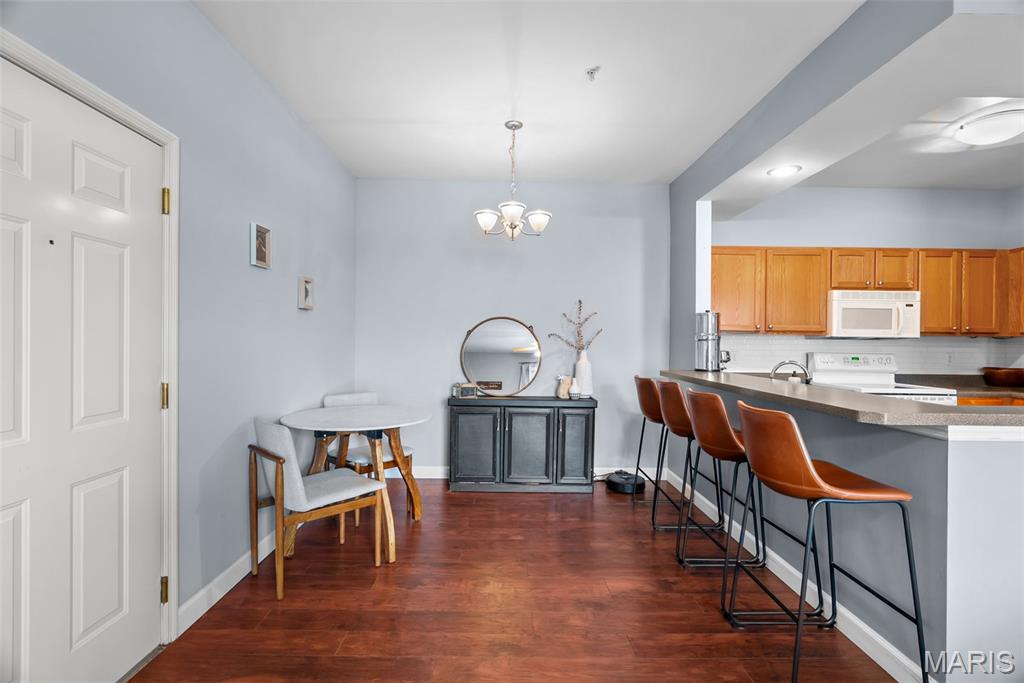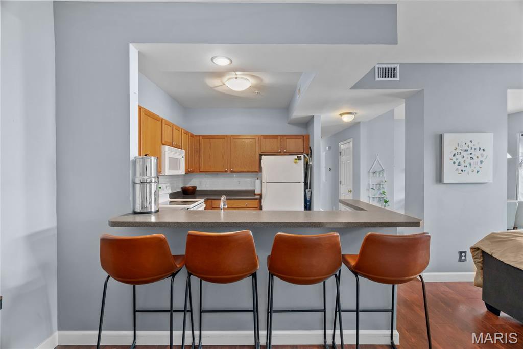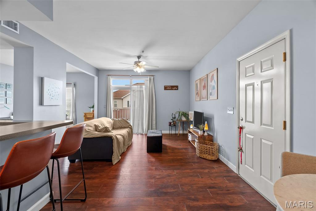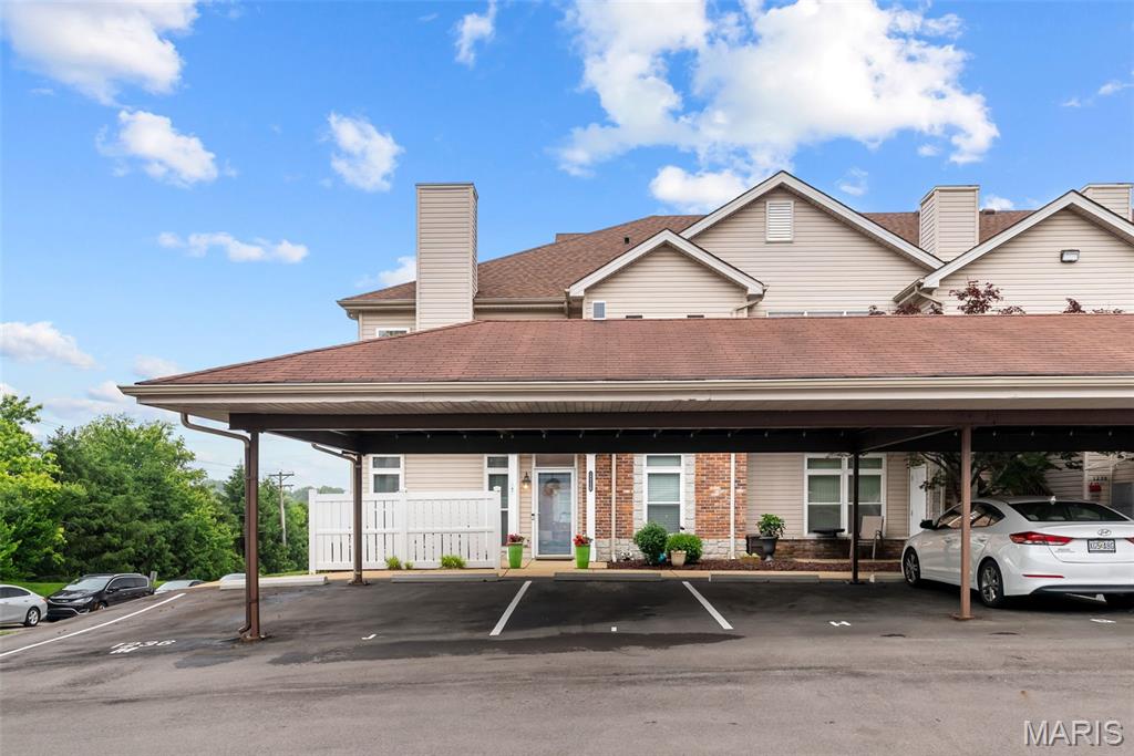 Enjoy the ease of entry level condo living in this bright and spacious unit in Mehlville, nestled at the top of a no-outlet hill, and surrounded by the sounds of nature. Wake up to birdsong and enjoy a cup of coffee on the balcony. The curb appeal is inviting, with brick and stone accents, plus you'll have an assigned covered parking space just outside at ground level. The open layout of the main living area is filled with natural light! The living room flows into the dining room, perfect for entertaining. The kitchen features a breakfast nook, breakfast bar and new backsplash. 9-foot ceilings add to the spacious feel & gleaming laminate floors throughout create a cohesive look. The primary bedroom has a walk-in closet & bathroom w/step-in shower. Another bedroom, full bath w/double sink vanity & tile-surround tub, as well as renovated laundry room complete the space. Just moments from shopping, restaurants, parks, Grant's Trail, schools, and quick access to I-55 and 270. Fantastic opportunity!