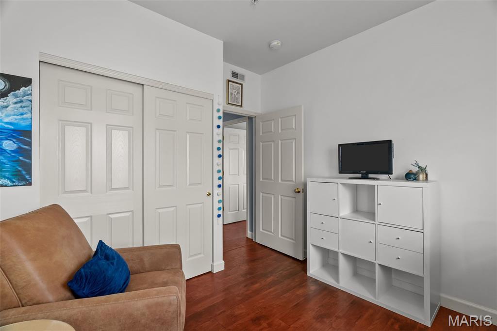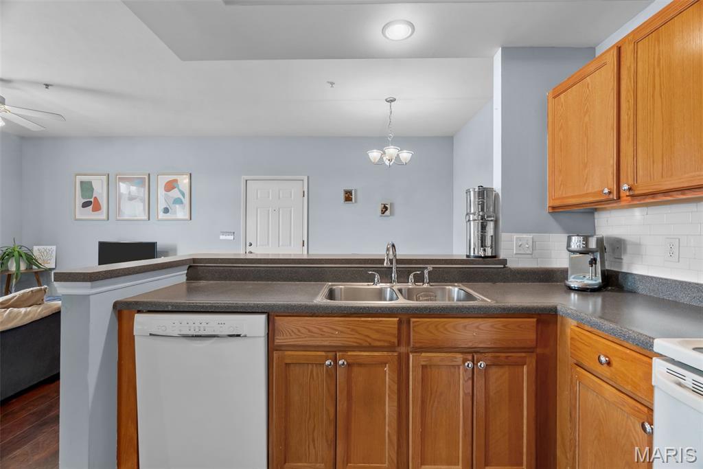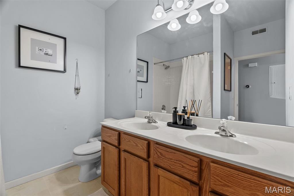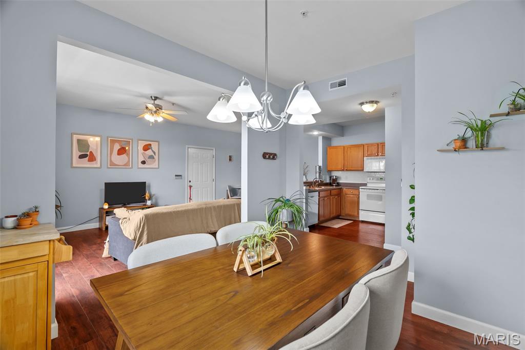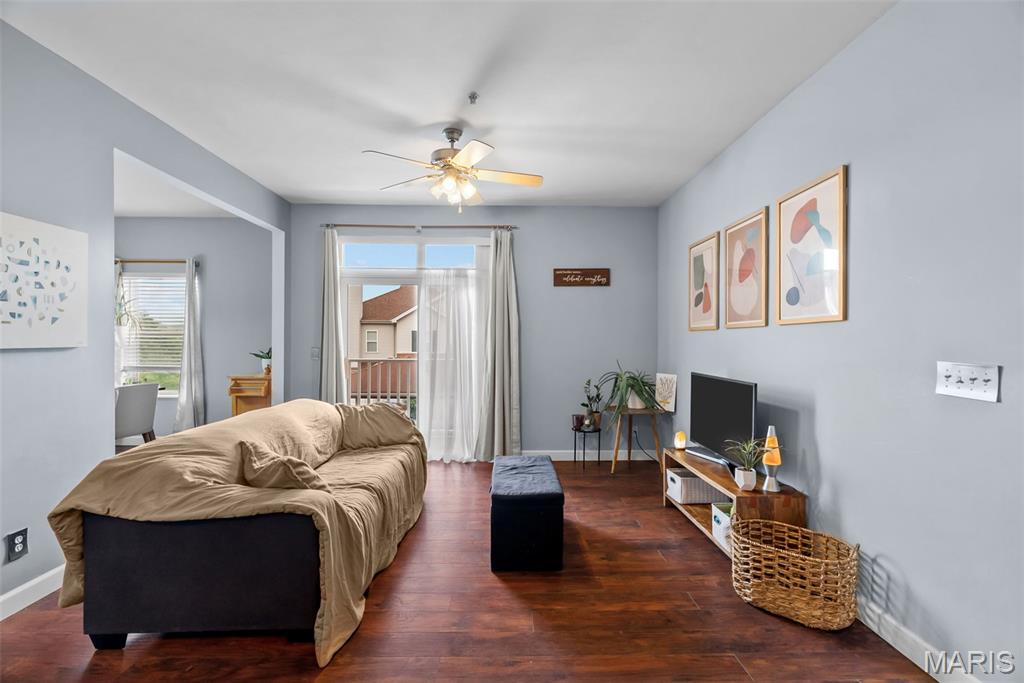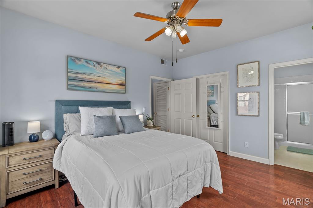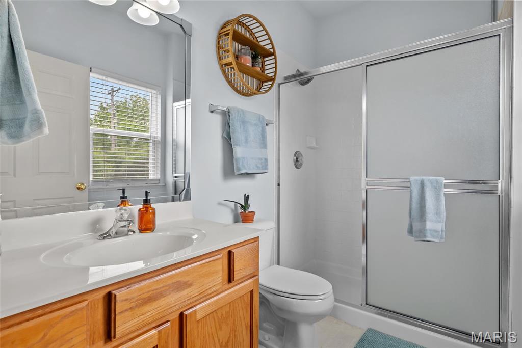 Enjoy the ease of entry level condo living in this bright and spacious unit in Mehlville, nestled at the top of a no-outlet hill, and surrounded by the sounds of nature. Wake up to birdsong and enjoy a cup of coffee on the balcony. The curb appeal is inviting, with brick and stone accents, plus you'll have an assigned covered parking space just outside at ground level. The open layout of the main living area is filled with natural light! The living room flows into the dining room, perfect for entertaining. The kitchen features a breakfast nook, breakfast bar and new backsplash. 9-foot ceilings add to the spacious feel & gleaming laminate floors throughout create a cohesive look. The primary bedroom has a walk-in closet & bathroom w/step-in shower. Another bedroom, full bath w/double sink vanity & tile-surround tub, as well as renovated laundry room complete the space. Just moments from shopping, restaurants, parks, Grant's Trail, schools, and quick access to I-55 and 270. Fantastic opportunity!