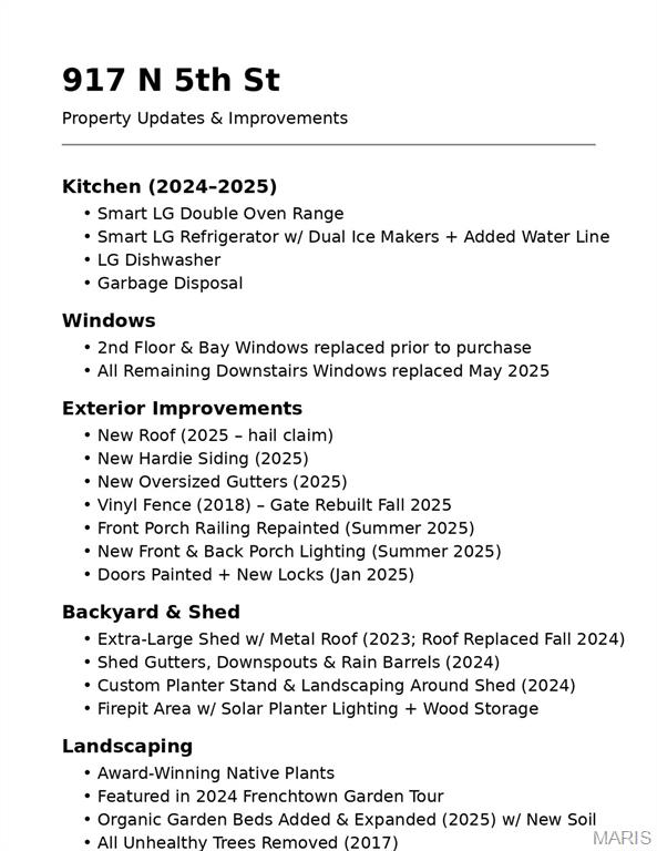 MORE PICTURES COMING SOON!!! Charming, fully updated 2 story traditional cottage just steps from Historic Frenchtown and Main Street Saint Charles. Opportunities like this in such a walkable, sought-after location don’t come along often — especially with this level of renovation already completed. The exterior has been completely redone, offering fresh curb appeal and long-term peace of mind. A fully fenced yard surrounds a beautifully maintained garden, creating a private outdoor retreat. The new oversized shed adds excellent storage or workshop space. Inside, original pine hardwood floors and soaring 10-foot ceilings showcase the home’s timeless character. The spacious dine-in kitchen features granite countertops, 42-inch cabinetry, a beautiful bay window, and top-of-the-line stainless steel appliances — thoughtfully blending charm and modern functionality. The main-floor primary bedroom provides flexibility and convenience, complemented by two full baths and upstairs laundry. Major systems — electric, plumbing, HVAC, and windows — many were updated in 2025 the rest in 2017, giving buyers confidence that the big-ticket items are already done. Walk to breakfast, dinner, festivals, shopping, and the Katy Trail. Enjoy coffee in your garden, entertain with ease, or stroll to Main Street on a summer evening. Homes offering this combination of character, upgrades, and location at this price point are rare — schedule your showing before someone else does.