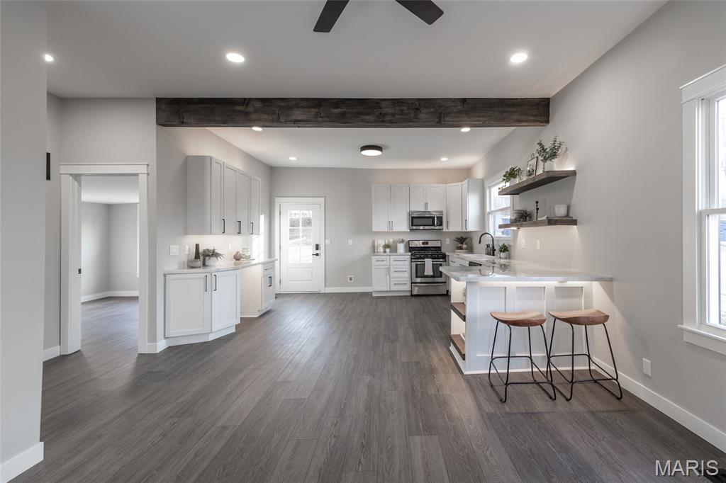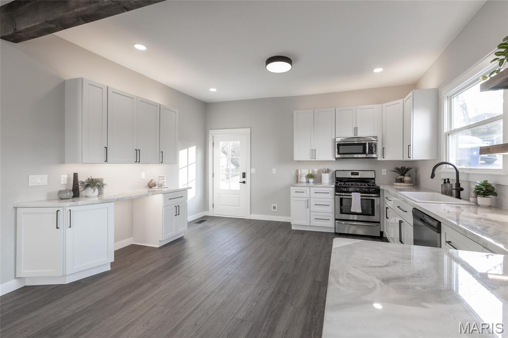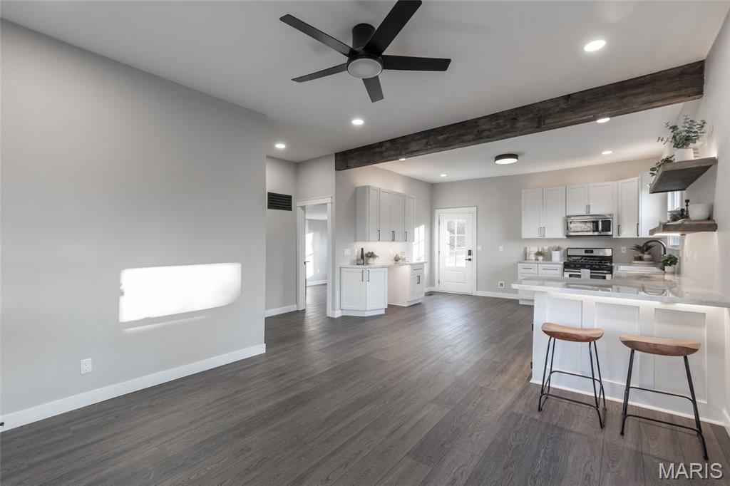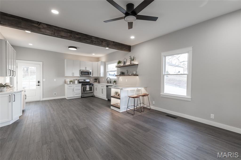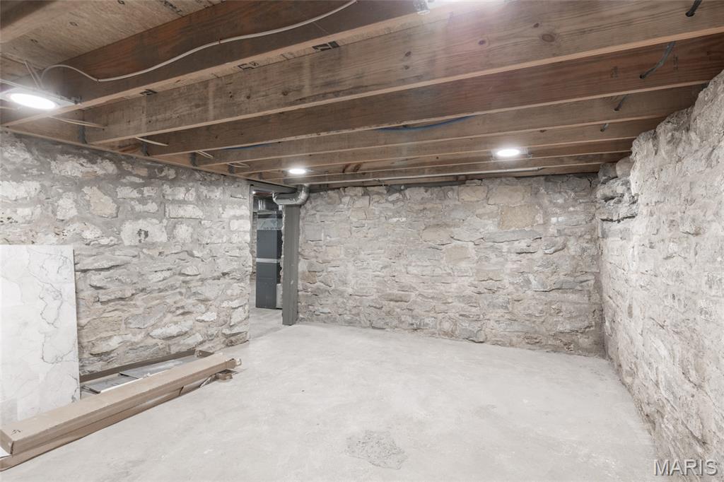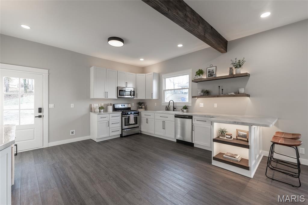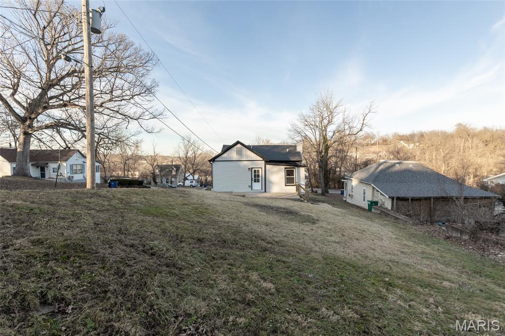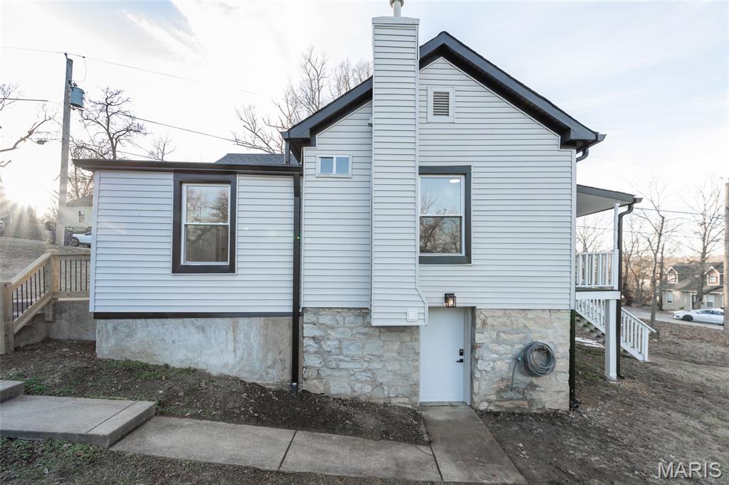 This fully remodeled 2-bedroom, 1-bath home offers a versatile space with a charmingly modern flair. It’s zoned for both residential and commercial use and creates endless possibilities for homeowners or business owners alike. The home has been completely renovated from top to bottom with extensive updates throughout. Improvements include a new roof, gutters, downspouts and some new siding. A reimagined main living area featuring a structural beam provides an open concept floor plan. The fully remodeled kitchen and bathroom are just a few of the highlights. The extensive rebuild includes a new band board at the rear foundation wall with new floor joists in the kitchen and bedroom. The electrical and plumbing systems are new throughout the home. Additional upgrades include a new heating and AC system, new LVP and tile flooring, additional insulation, new drywall and paint, doors and all new windows. The front porch/deck has also been reinforced with new beams added and the main sewer lateral has been replaced to the city main. The lower-level features trendy, historic stone walls with a separate room that could be used for utility or storage space. This rebuilt beauty is conveniently located near the city of De Soto’s main street district. It’s move-in-ready and blends quality craftsmanship with flexible zoning—perfect for a residence, office, or investment opportunity. Showings begin with an open house on Friday 2/13 4pm-7pm and there is another open house on Sunday 2/15 1pm-3pm.