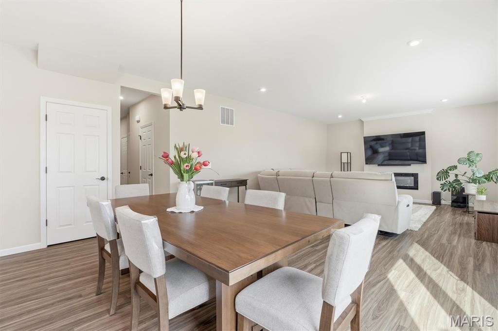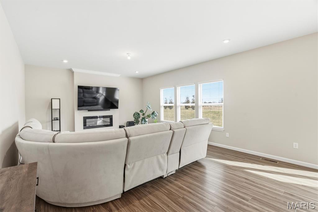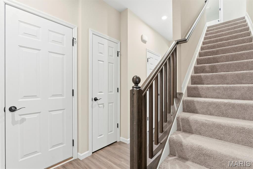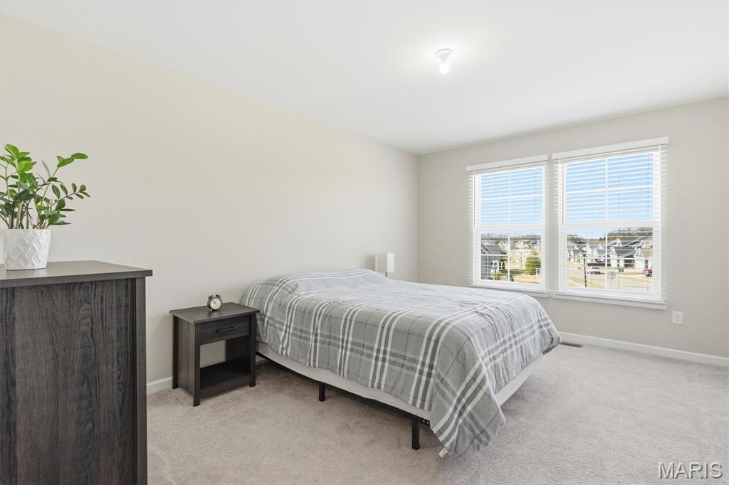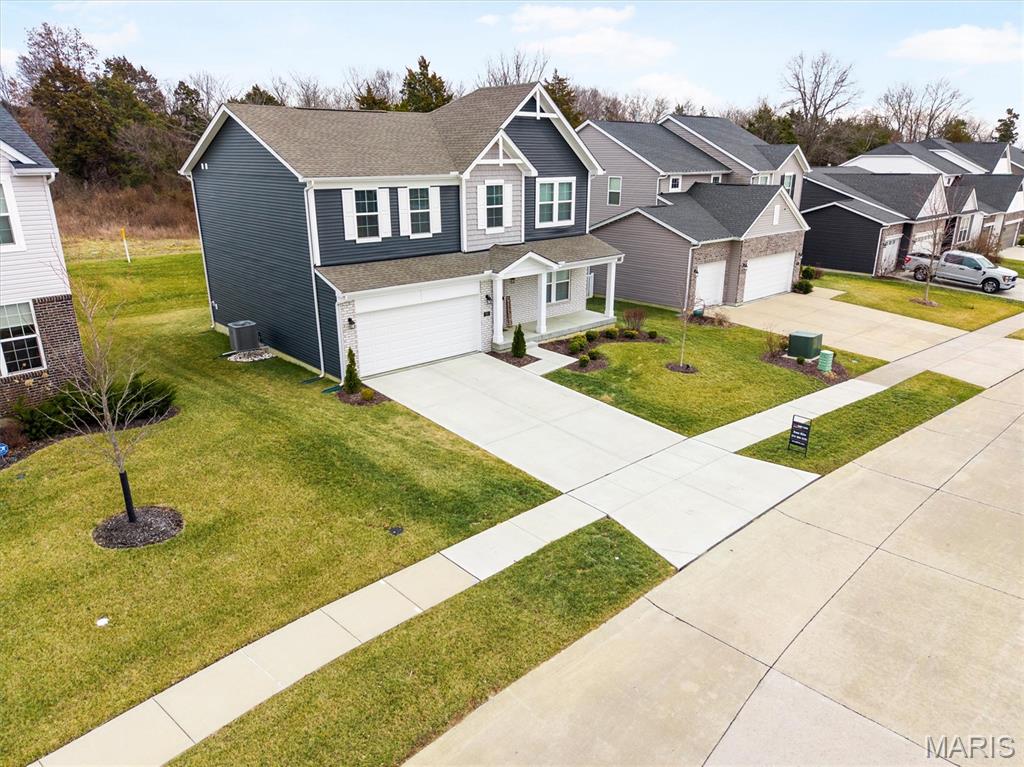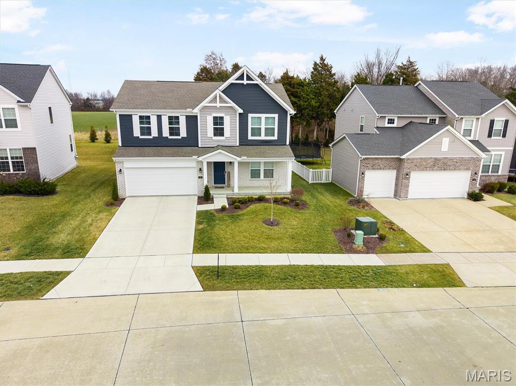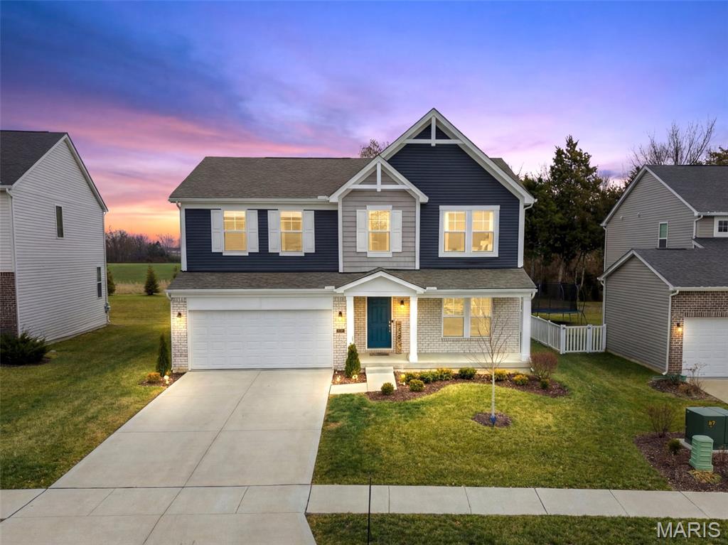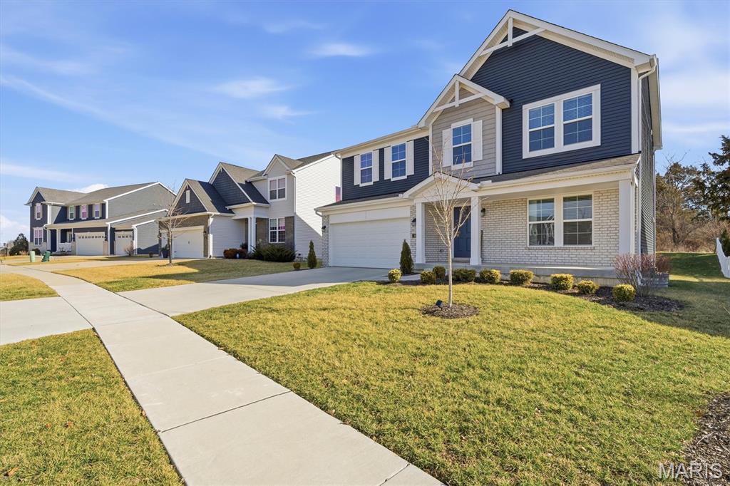 Welcome to this impeccably maintained, move-in-ready, 2-story, 2023-built Fischer Home offering 4 bedrooms, 2.5 baths, and an exceptional blend of modern comfort and functional design—loaded with upgrades! The charming covered front porch sets the tone as you step inside to 9’ ceilings and luxury vinyl plank flooring flowing throughout the main level. A versatile main-floor bedroom provides the perfect space for a home office, guest suite, or additional family room. The light-filled living area features a beautiful wall-mounted fireplace, creating a warm and inviting atmosphere for everyday living or entertaining. The open-concept layout seamlessly connects to the dining area and the upgraded kitchen, complete with a center island, 42” cabinetry with crown moulding, granite countertops, stainless steel appliances, and a walk-in pantry. From the dining area, step outside to enjoy the expanded concrete patio—ideal for gatherings, grilling, or relaxing evenings with family and friends. Upstairs, the thoughtfully designed primary suite offers a double-sink bath and a generous walk-in closet. Two additional bedrooms each feature their own walk-in closets. A versatile loft area offers endless possibilities—playroom, second office, media space, or cozy reading nook. Convenient second-floor laundry with a window and utility sink adds everyday ease. The unfinished basement is ready for your personal touch, featuring a rough-in for a future bath, egress window, sump pump, and water softener system that is already installed for you. The Pinewoods Estates community also offers a beautiful pond with trails, picnic areas, and a playground. Located just minutes from Wentzville Parkway shopping, dining, and everyday conveniences, with quick access to Hwy 70 and Hwy 64 for easy commuting. Don’t miss this rare opportunity to own this beautifully upgraded home, where functional finishes and floorplan meet your desired everyday lifestyle. Schedule your showing today!