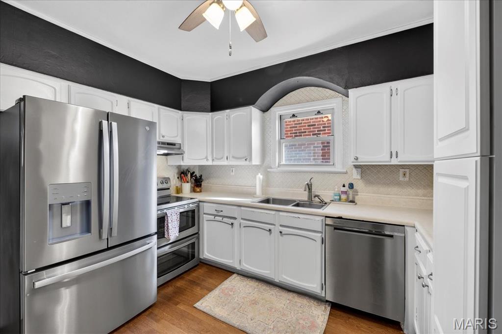 Nestled in the heart of Southampton, this storybook brick Gingerbread home is full of timeless charm and character. Step inside to a welcoming entry foyer framed by stained glass windows and refinished hardwood floors, setting the tone for the classic details found throughout. The spacious living room is flooded with natural light and features a statement stone fireplace, flowing seamlessly into a separate dining room ideal for hosting and entertaining. The bright white kitchen offers ample cabinet space and opens to a sunroom that leads out to the deck, creating an easy connection to outdoor living. The main level includes two bedrooms, a den and a full bathroom. Upstairs, you’ll find two additional bedrooms, one of which can function as a second living area, complete with a nook perfect for a home office or play space. A fenced backyard and detached two-car garage complete this charming home. Set on tree-lined streets with walkable blocks, nearby parks, coffee shops, and beloved South City favorites just minutes away, this home delivers the charm, character, and sense of community Southampton is known for.