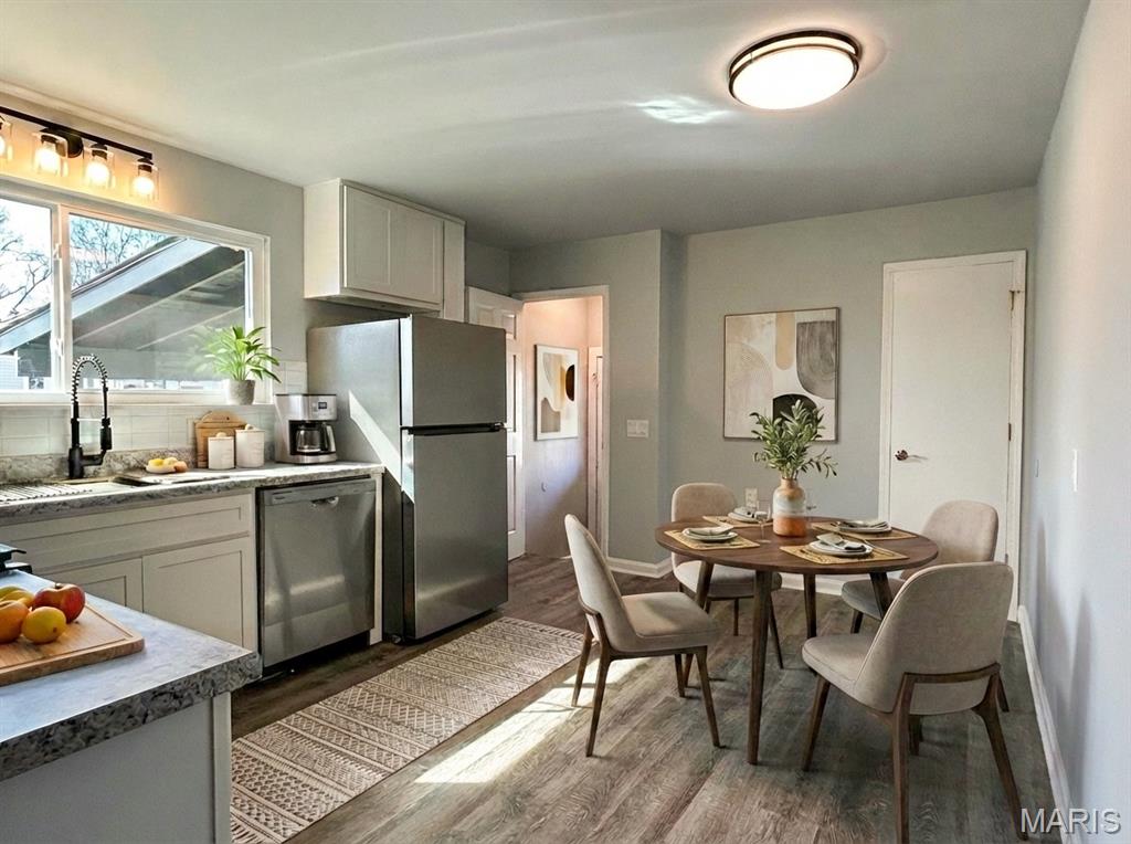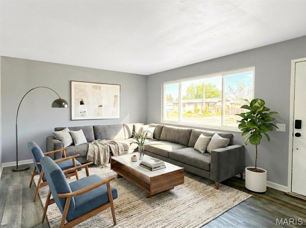 Beautiful renovated home in the heart of Florissant on a peaceful tree lined street with sidewalks. This gorgeous ranch style floor plan has all new vinyl windows, new luxury vinyl plank flooring, freshly painted interior, and new light fixtures. Stunning all new kitchen with 40” kitchen cabinets, stainless steel appliances, chef’s sink, and pantry. Fully renovated bathroom. The basement is very clean and ready to utilize however you imagine. Brand new roof, landscaping, and exterior paint. Level yard with large covered patio. Newer HVAC. Amazing location-convenient to shopping, parks, and schools. HSA Home Warranty included!