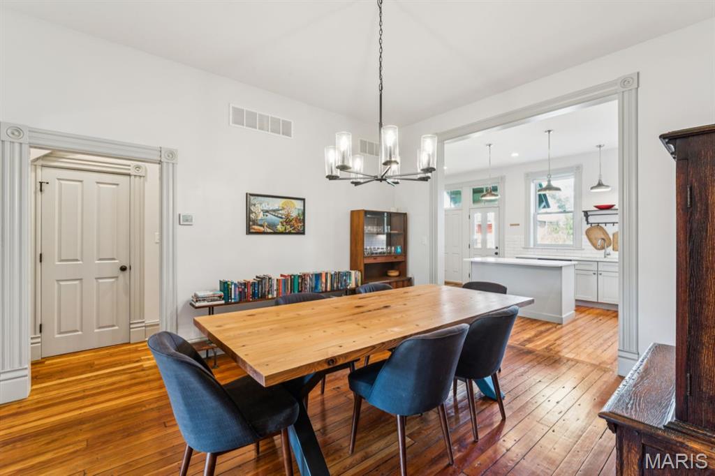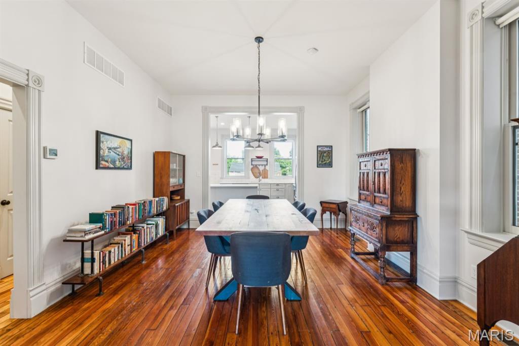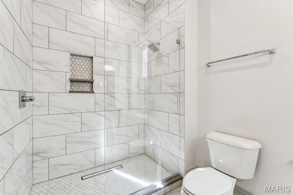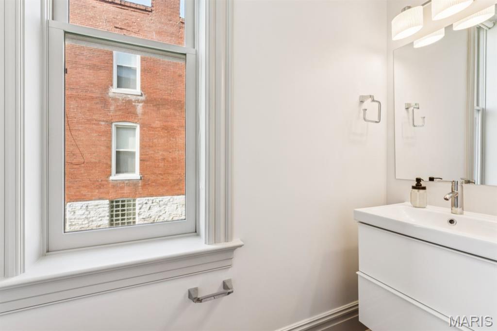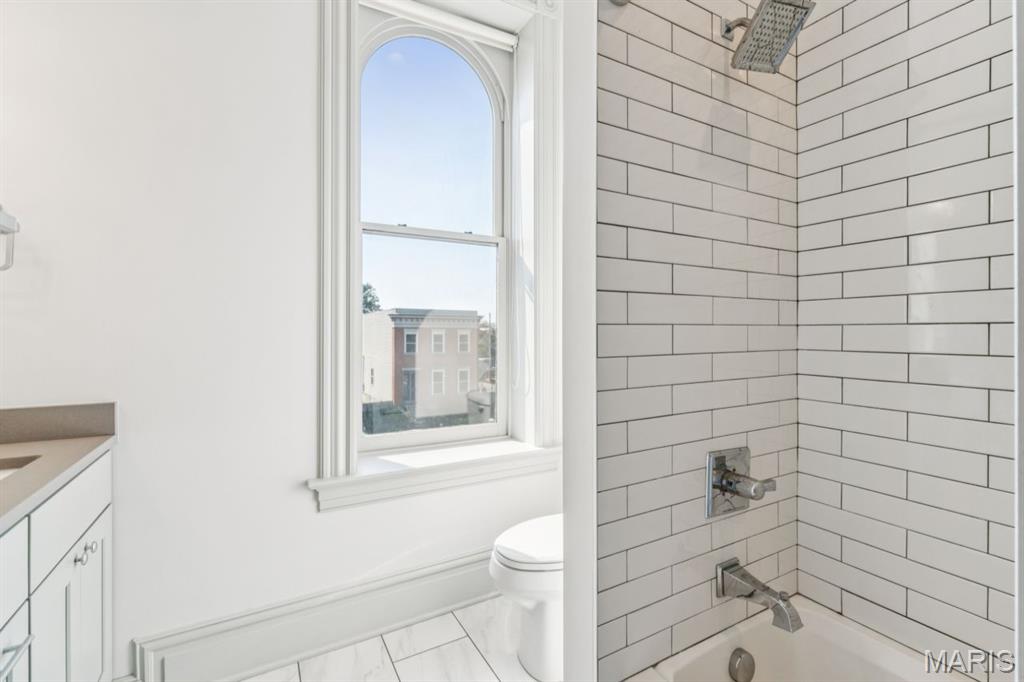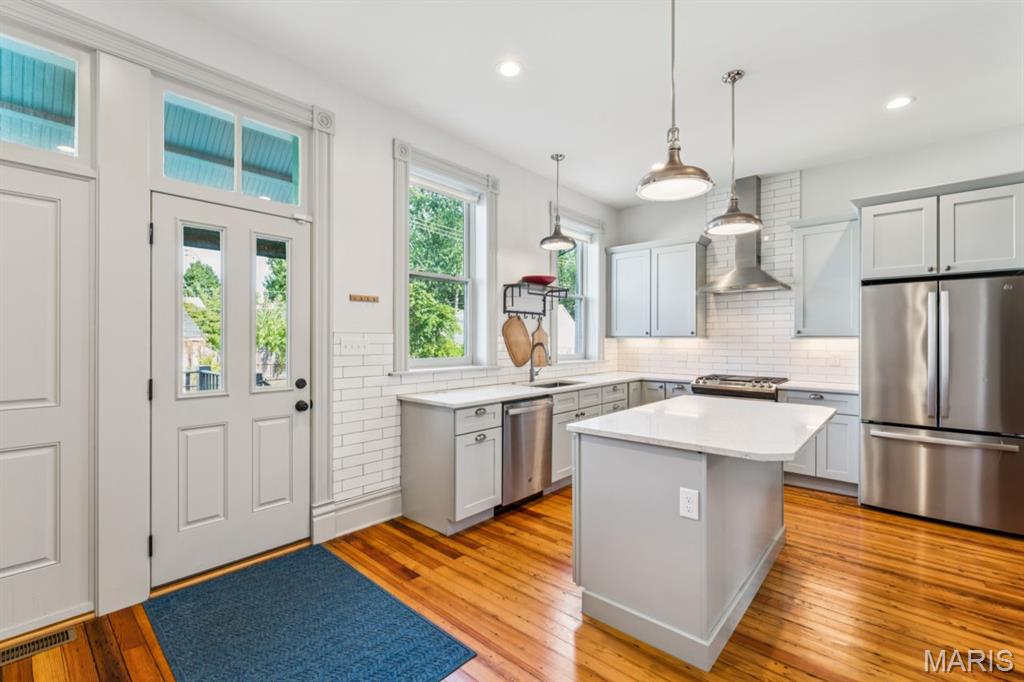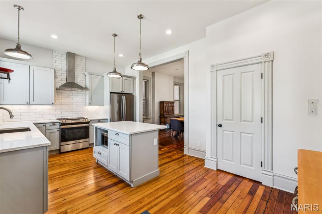 Located in the heart of the Forest Park Southeast neighborhood, this 1897 home strikes a perfect harmony of past and present. Completely renovated by previous owner, the facade was lovingly restored with a custom-built historic front porch, original arched windows, stained-glass transoms, and a carefully rebuilt cornice—bringing the home’s 19th-century character back to life. Step inside through crafted oak doors to find gleaming historic hardwood floors and a warm, inviting living room anchored by a decorative fireplace with custom tile and a striking mantel. Pocket doors open to a generous dining room and kitchen bathed in an abundance of natural light. Classic finishes guarantee longevity—quartz countertops, subway tile, stainless appliances, a center island, range hood, and a coveted WALK-IN PANTRY create both function and style. A powder room and two hall closets complete the main floor. Upstairs, the primary suite feels like a private retreat with its spacious walk-in closet and spa-inspired bath featuring double sinks, a large mirror, and an impressive marble 4’x7’ walk-in shower. Two additional bedrooms share a full bath, while a convenient second-floor laundry makes daily living a breeze. Zoned high-efficiency HVAC, large deck overlooking the fenced backyard, and a parking pad for two cars. Living in Forest Park Southeast puts you steps from it all—Forest Park, the Grove’s dining & nightlife, and just minutes to the Central West End and medical campus. This home has it all—layout, location, and lifestyle.