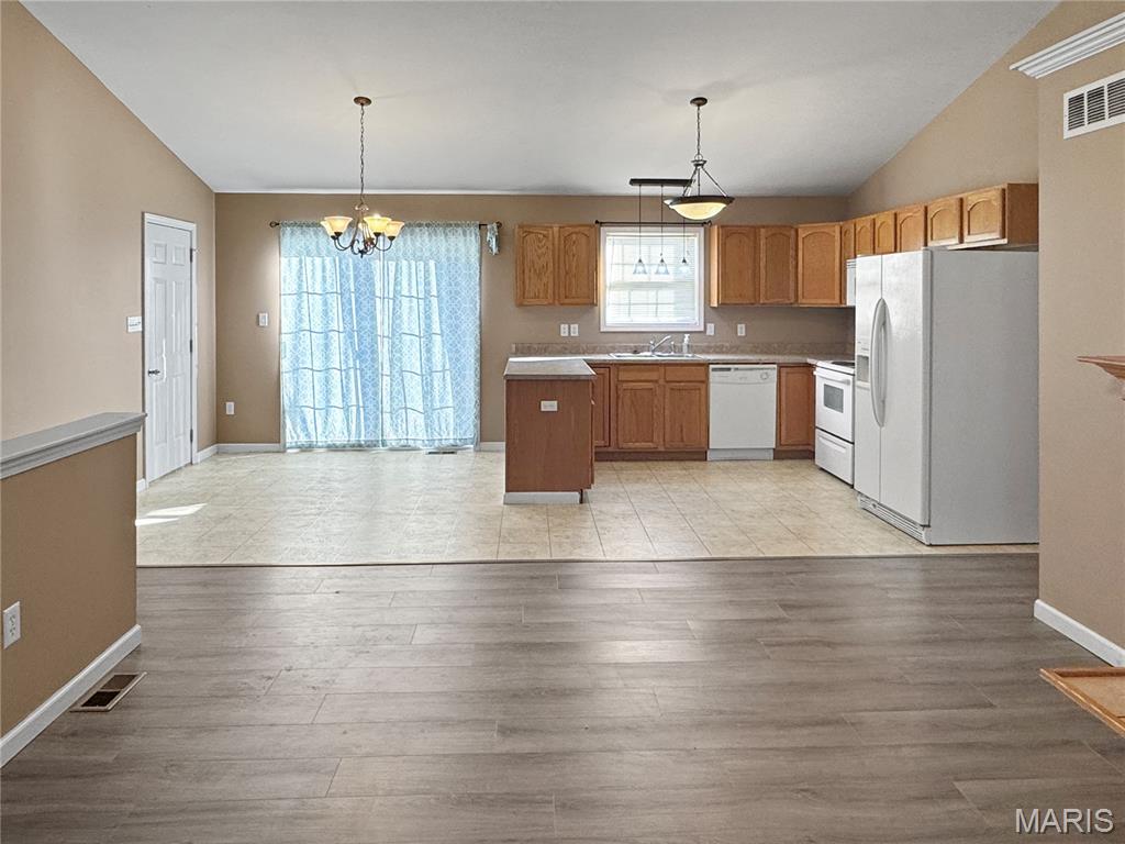 Wonderful home that has been lovingly enjoyed for many years and is ready for its next chapter! This comfortable, well-designed floor plan offers the perfect blend of open living space and private retreats, making it ideal for everyday living and entertaining alike. Roof 2024, water heater 2025, Lvp flooring approx. 2023 Step inside to an inviting Open Concept Great Room featuring a vaulted ceiling that enhances the spacious feel and a decorative gas fireplace that serves as a warm and charming focal point. The natural flow of this main living area makes gathering with family and friends easy and enjoyable. The kitchen offers a convenient snack bar for casual meals, ample cabinetry, and appliances that are included, making this space both functional and welcoming. The adjoining dining area provides plenty of room for a full-sized table and features a door that leads directly to the fenced backyard—perfect for pets, play, gardening, or hosting outdoor get-togethers. Down the hall, you’ll find a laundry closet thoughtfully placed on the main level for convenience, along with a WiFi thermostat that adds modern efficiency and comfort control. The main floor also includes three bedrooms and two full bathrooms. The primary suite offers a comfortable retreat with its own closet and private full bath, while the additional bedrooms are well-sized and versatile for guests, family members, or home office needs. The finished lower level significantly expands your living space. Here you’ll find a generous recreation area and family room, providing flexible options for movie nights, hobbies, workout equipment, or game tables. The walk-out feature allows easy access to the outdoors and brings in natural light. This level also includes an additional bathroom, a designated sleeping area ideal for a day sleeper or overnight guests, and space already set up for a future kitchenette or bar area—perfect for entertaining or multi-generational living. The stained concrete floors in the lower level are both stylish and durable, offering a unique design touch while remaining low-maintenance. Storage and parking are well accommodated with the oversized two-car garage, providing extra room for tools, bikes, lawn equipment, or workshop space in addition to your vehicles. Location is another standout feature of this home. Enjoy the convenience of being just a short walk to the library, community pool, park, and school—making daily routines and recreational activities easily accessible. Development has pond and trail if desired. With its inviting layout, finished lower level, nice yard, and convenient location, this home offers space, comfort, and value. Truly a must-see for anyone looking for a well-cared-for property ready to welcome new memories!
