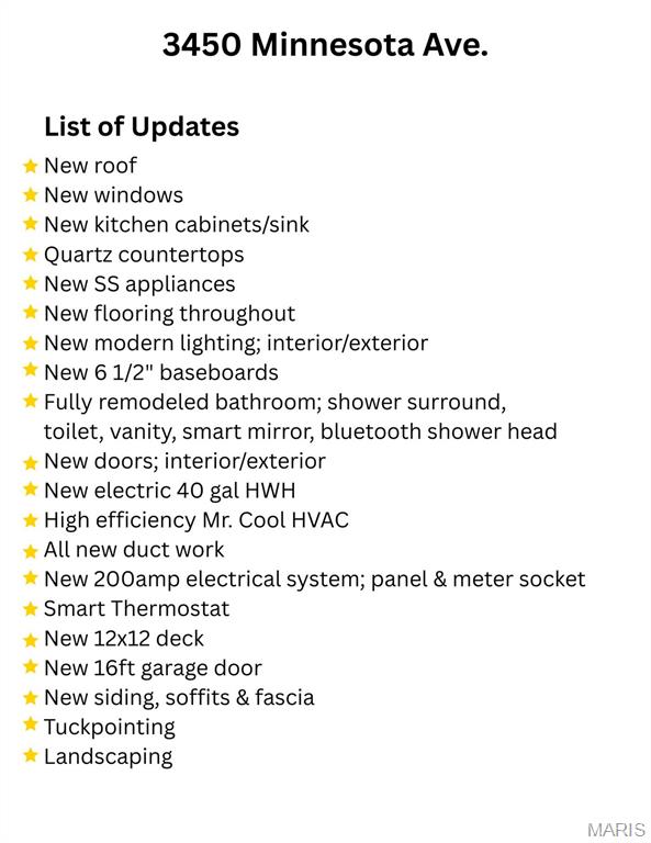 Welcome to 3450 Minnesota Avenue! Just steps from the vibrant energy of Cherokee Street, this fully updated home blends modern style with everyday comfort. Inside, you’ll find 3 generously sized bedrooms and a beautifully refreshed bathroom on the main floor, all connected by a long, spacious hallway that enhances the home’s true size and makes it feel even larger than expected from the outside! Also leading to the brand-new kitchen with quartz counter tops; it is sleek, stylish, and designed for both functionality & entertaining to the open living space! Downstairs, a partially finished basement offers the perfect opportunity for a rec room, an additional half bath, along with a dedicated laundry area for added convenience. Brand new flooring, paint, windows & light fixtures add to the luxury at an affordable price! Step outside to enjoy the brand-new deck, ideal for relaxing or hosting, in a private & fully fenced backyard, plus a 2 car detached garage with a new 16ft garage door that provides ample parking & storage! With even more updates throughout such as; a new electric 40gal hot water heater, a high efficiency Mr. Cool HVAC system with Smart thermostat, all new duct work, a new 200amp electrical panel & meter socket, you'll save on a gas bill since this home is ALL ELECTRIC! This move-in ready home offers the perfect combination of location, space, and modern upgrades. Don’t miss your chance to view this truly new, beautiful home before it's someone else's dream come true!