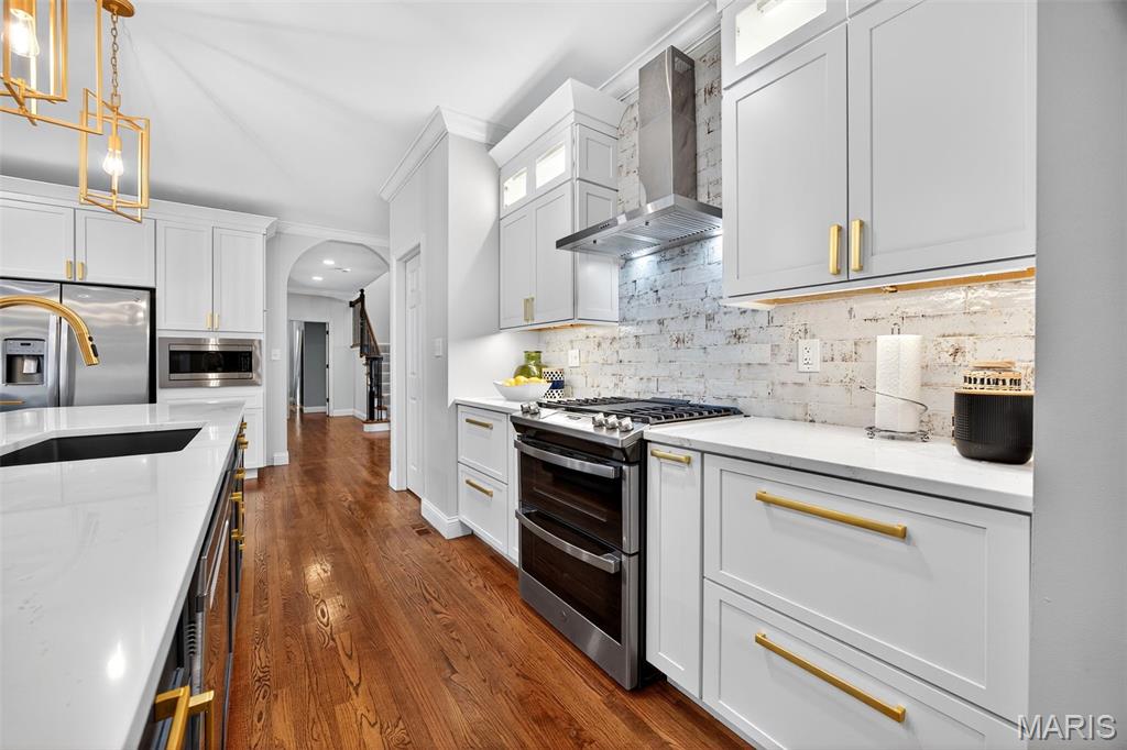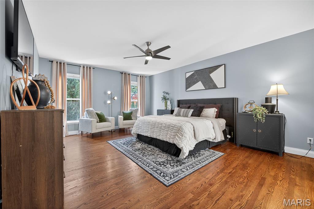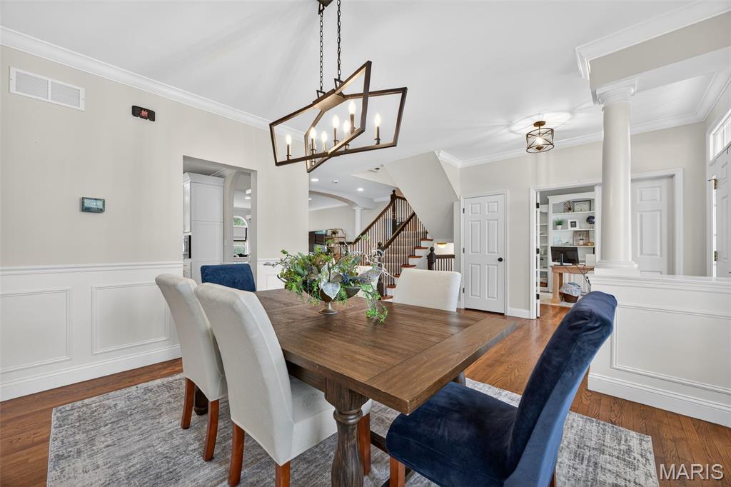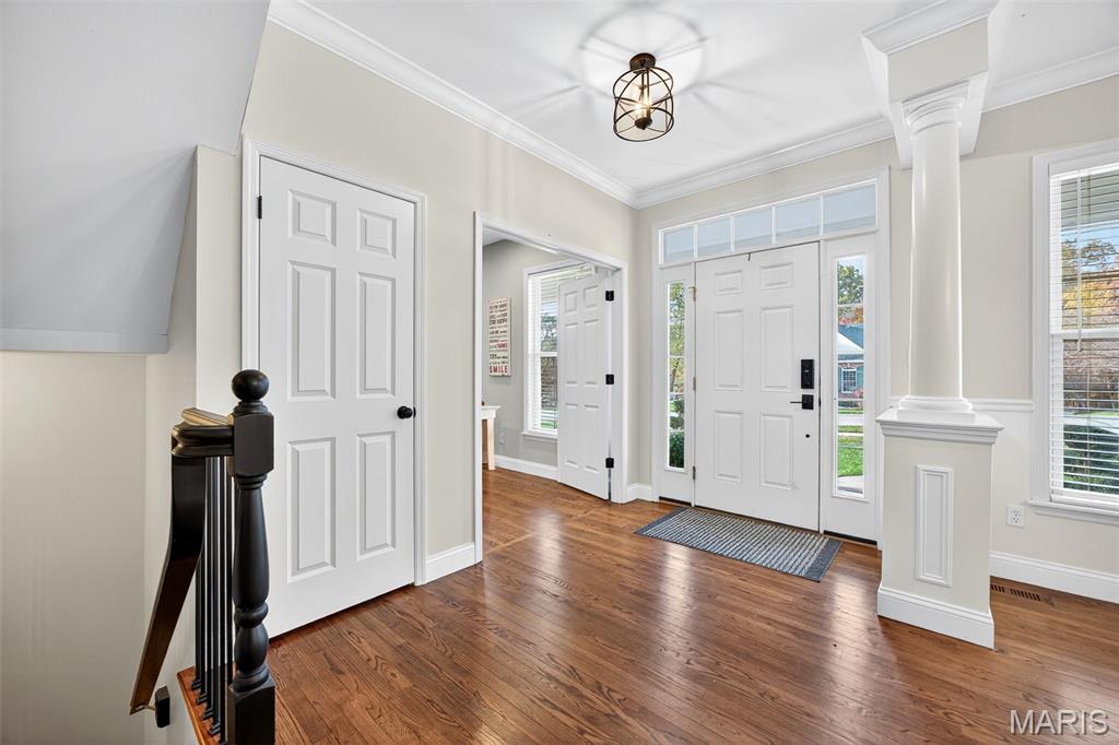 This custom-built Cape Cod–inspired residence offers over 4,200 sq ft of refined living space across 1.5 stories, seamlessly blending timeless architecture with modern luxury. A grand foyer welcomes you into a thoughtfully designed interior, flanked by a light-filled study with built-ins and a formal dining room enhanced by board-and-batten paneling and crown molding. The elegant great room features a wall of windows, recessed lighting, and signature custom archways, creating a bright yet sophisticated gathering space. The main level has been beautifully updated with newly refinished hardwood floors, 5” baseboards, designer lighting, and sleek black hardware, delivering a crisp, contemporary feel throughout. At the heart of the home, the gourmet kitchen impresses with 42” soft-close cabinetry, under-cabinet lighting, a 10’ quartz island, double-oven gas range, coffee bar with beverage cooler, and a spacious walk-in pantry—perfect for both everyday living and entertaining. Just beyond, the inviting hearth room is filled with natural light from dual French doors with transoms and anchored by a charming wood-burning fireplace. Designed for year-round enjoyment, the screened 3-season room features a stunning stone wood-burning fireplace and overlooks the resort-style backyard. A standout feature of this home is its rare main-level layout, offering two private bedroom suites. The luxurious primary suite includes adult-height vanities with Moen fixtures, a soaking tub, and a walk-in shower, while the second suite provides a private full bath and walk-in closet—ideal for guests or multigenerational living. A main-floor laundry and powder room complete the level. Upstairs, a striking iron spindle staircase leads to two spacious bedrooms with new carpeting and an updated full bath featuring a walk-in shower. The finished walkout lower level expands your living space with a large recreation room with gas fireplace, a fifth bedroom with oversized walk-in closet, full bath, and a flex room perfect for a sixth bedroom, gym, or media space. Step outside to your own private retreat—a resort-style backyard featuring a heated saltwater pool and spa, fully fenced yard, and a serene 0.6-acre lot backing to woods, offering exceptional privacy. Additional highlights include a side-entry 3-car garage and major system updates such as new dual-zone HVAC, new hot water heater, and a new architectural shingle roof—providing peace of mind and turnkey living.