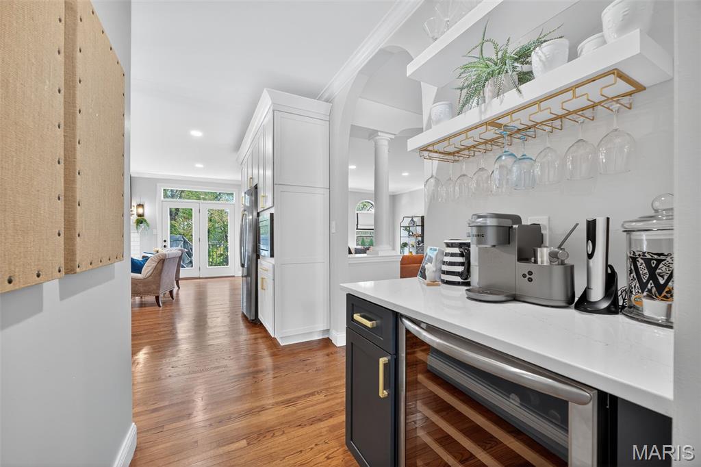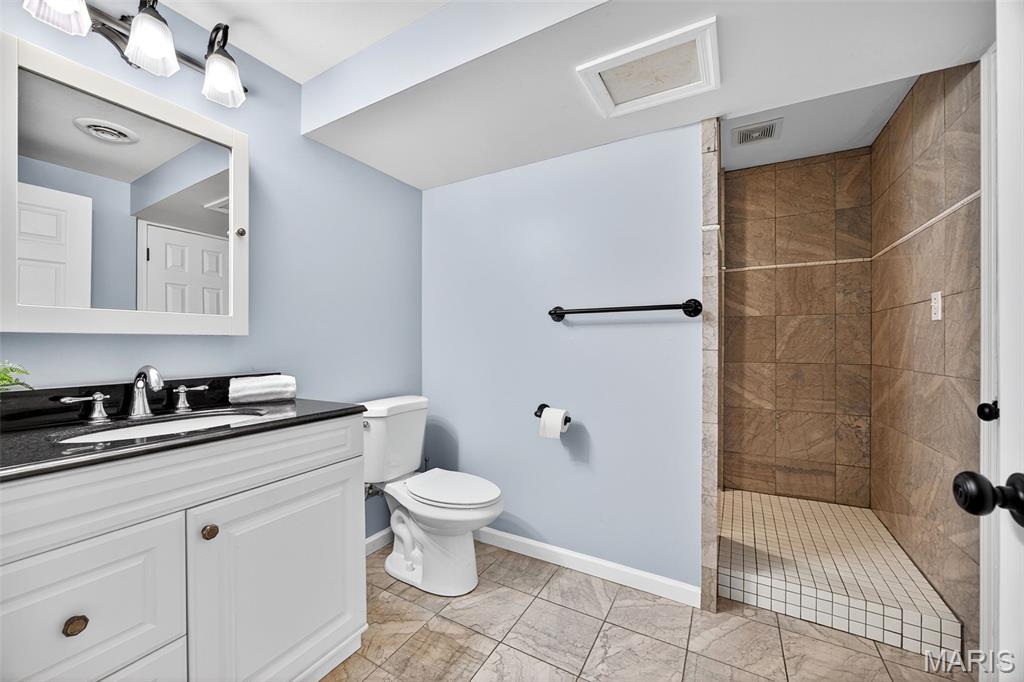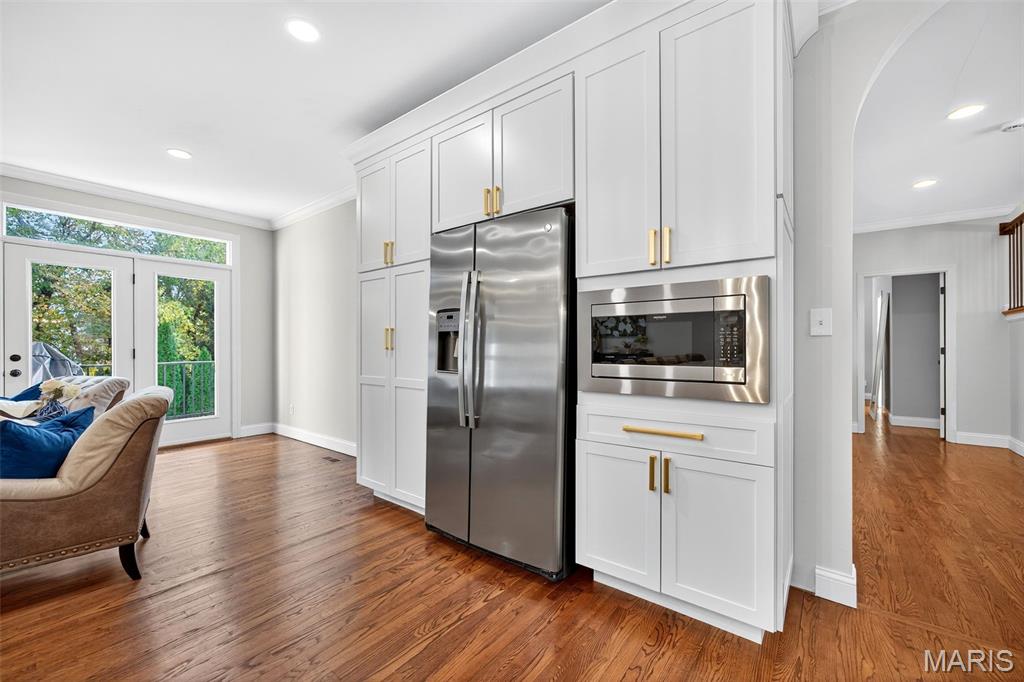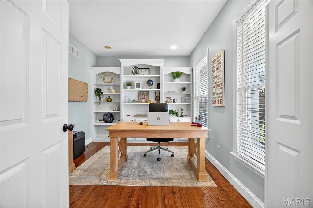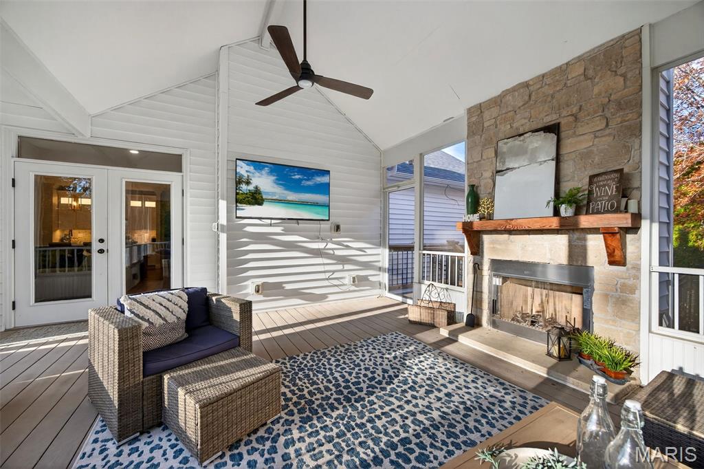 This custom-built Cape Cod–inspired residence offers over 4,200 sq ft of refined living space across 1.5 stories, seamlessly blending timeless architecture with modern luxury. A grand foyer welcomes you into a thoughtfully designed interior, flanked by a light-filled study with built-ins and a formal dining room enhanced by board-and-batten paneling and crown molding. The elegant great room features a wall of windows, recessed lighting, and signature custom archways, creating a bright yet sophisticated gathering space. The main level has been beautifully updated with newly refinished hardwood floors, 5” baseboards, designer lighting, and sleek black hardware, delivering a crisp, contemporary feel throughout. At the heart of the home, the gourmet kitchen impresses with 42” soft-close cabinetry, under-cabinet lighting, a 10’ quartz island, double-oven gas range, coffee bar with beverage cooler, and a spacious walk-in pantry—perfect for both everyday living and entertaining. Just beyond, the inviting hearth room is filled with natural light from dual French doors with transoms and anchored by a charming wood-burning fireplace. Designed for year-round enjoyment, the screened 3-season room features a stunning stone wood-burning fireplace and overlooks the resort-style backyard. A standout feature of this home is its rare main-level layout, offering two private bedroom suites. The luxurious primary suite includes adult-height vanities with Moen fixtures, a soaking tub, and a walk-in shower, while the second suite provides a private full bath and walk-in closet—ideal for guests or multigenerational living. A main-floor laundry and powder room complete the level. Upstairs, a striking iron spindle staircase leads to two spacious bedrooms with new carpeting and an updated full bath featuring a walk-in shower. The finished walkout lower level expands your living space with a large recreation room with gas fireplace, a fifth bedroom with oversized walk-in closet, full bath, and a flex room perfect for a sixth bedroom, gym, or media space. Step outside to your own private retreat—a resort-style backyard featuring a heated saltwater pool and spa, fully fenced yard, and a serene 0.6-acre lot backing to woods, offering exceptional privacy. Additional highlights include a side-entry 3-car garage and major system updates such as new dual-zone HVAC, new hot water heater, and a new architectural shingle roof—providing peace of mind and turnkey living.