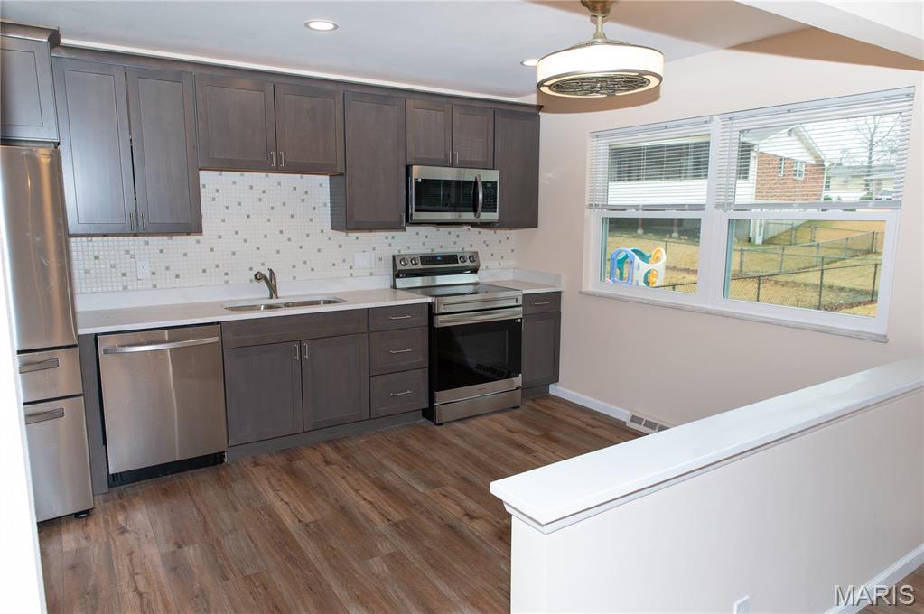 Won't Last Long. Easy 3rd Bedroom Update Possible. This wonderful property is in the highly desirable Grants Farm area and Lindbergh Schools. Open eat-in kitchen to family room with fireplace. Updated throughout the main level including remodeled kitchen with marble countertops and new matching stainless appliances. All new flooring and new high efficiency furnace. New architectural roof. New light fixtures, ceiling fans and recessed lighting. Gorgeous fenced backyard with a patio. You will love the quiet area and very short walk to the Grants Trail Library, Grants Trail Farms and Trail. There is an easy update possible to turn separate dining room in a 3rd bedroom or office. The sunlit large basement windows and open space are also an easy update for a growing family and/or your own plans. This property is priced below market value and is move-in ready. A No Pets and No Smoke Home.