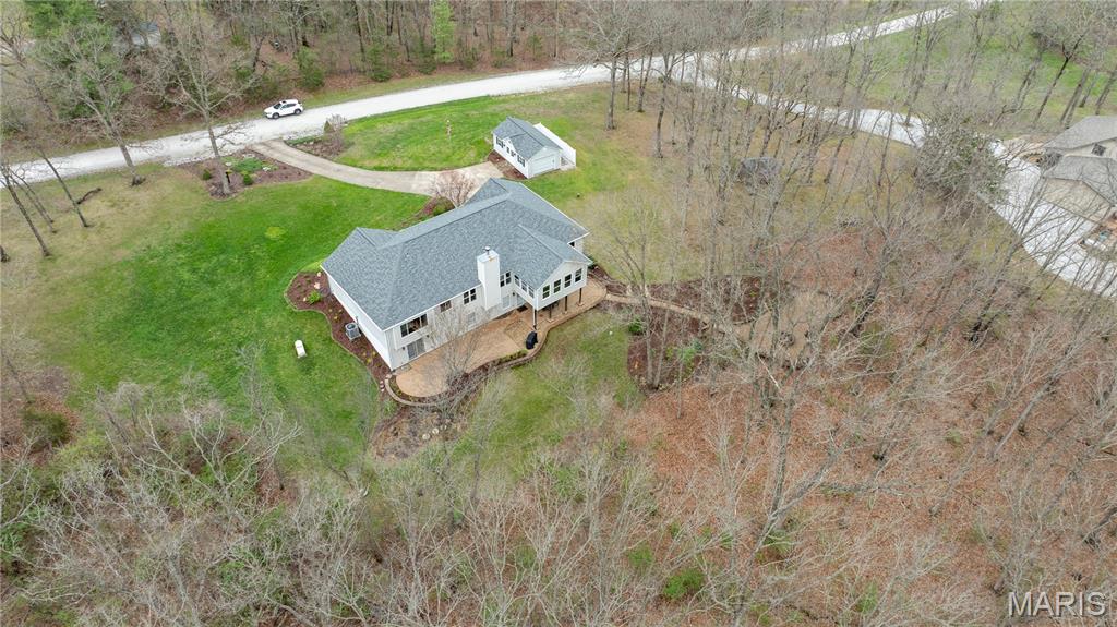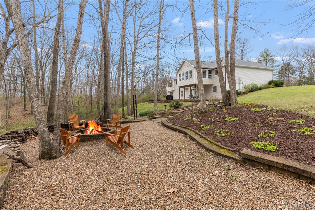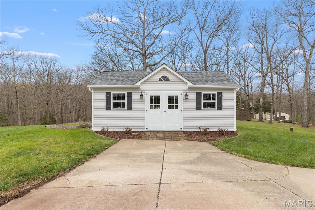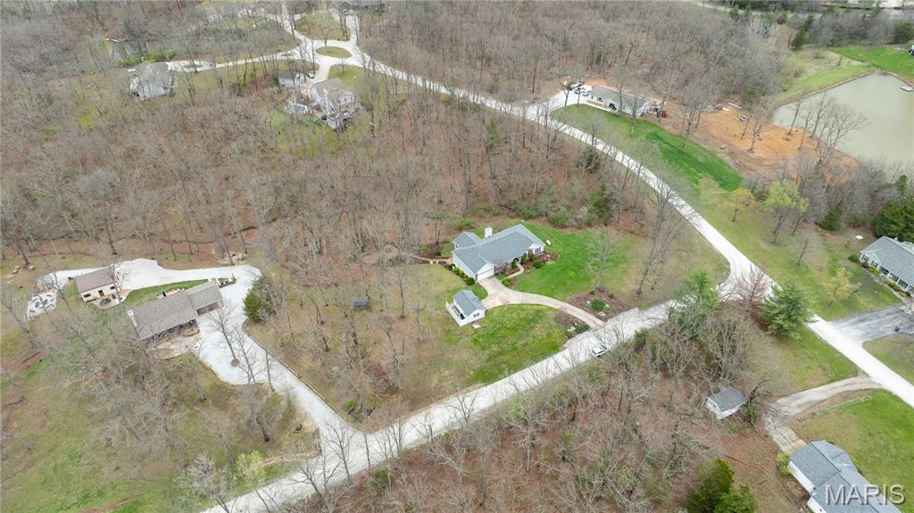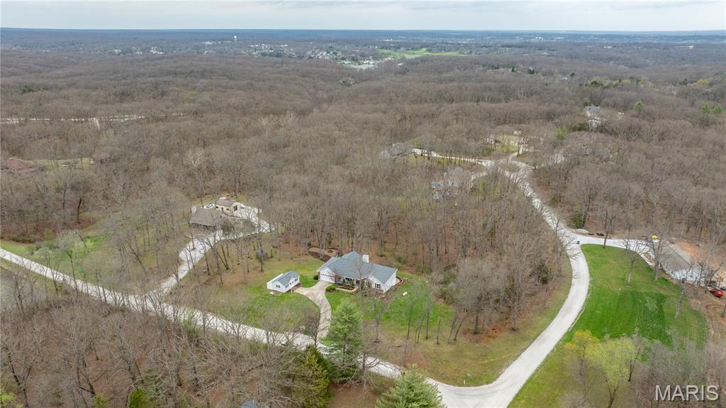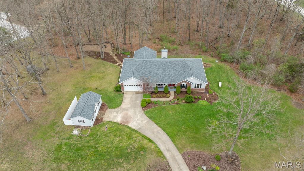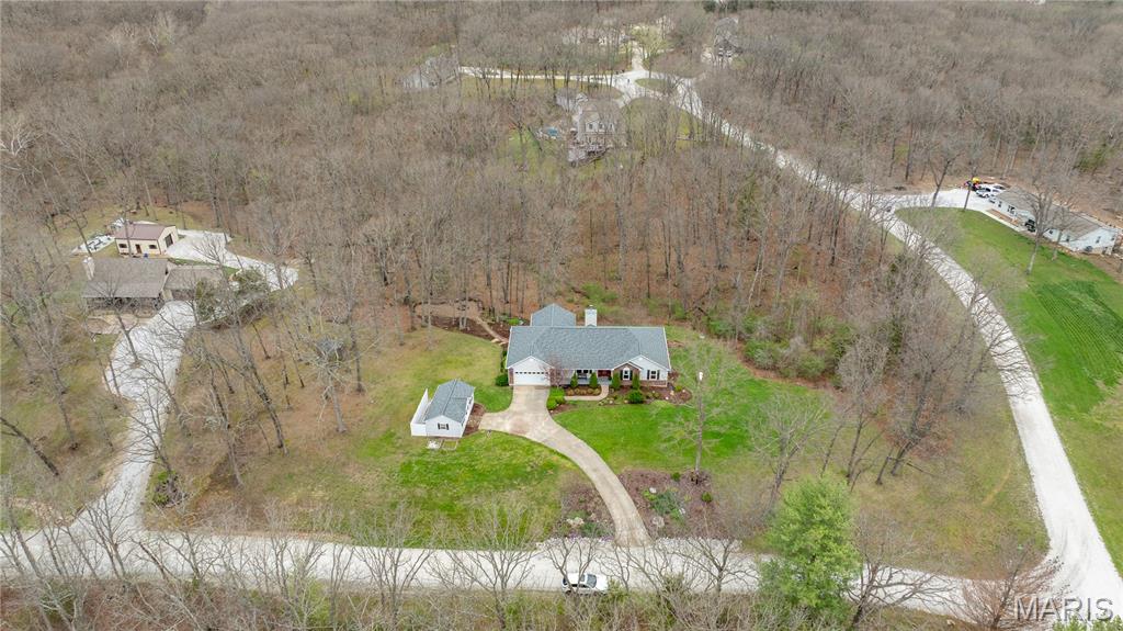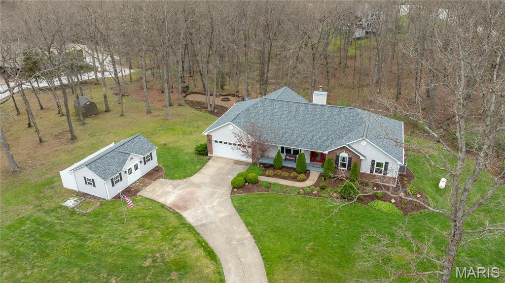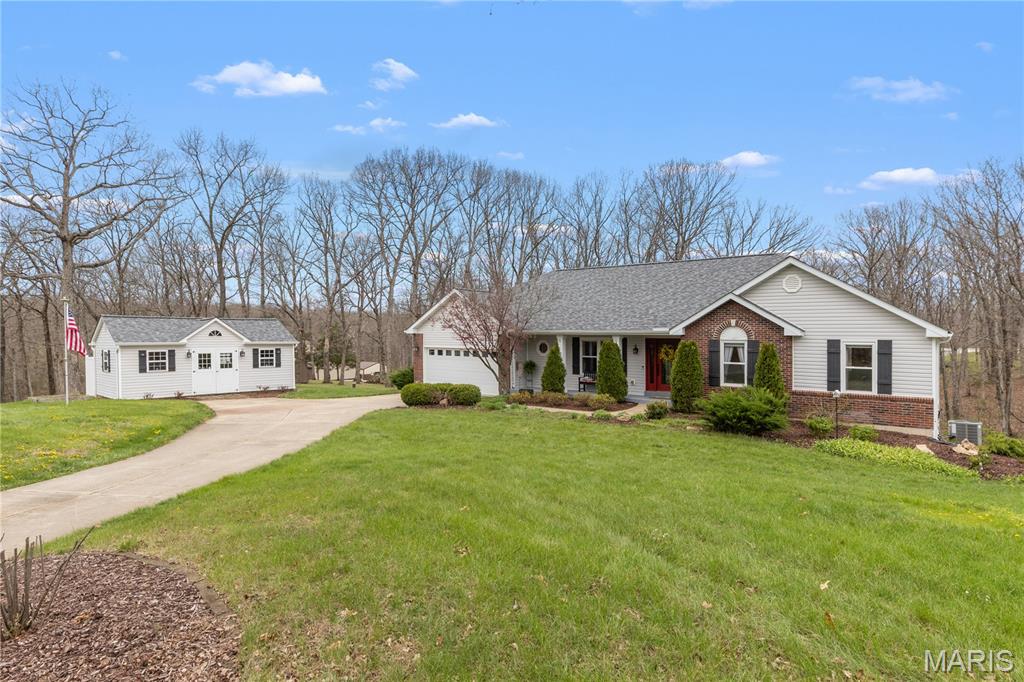 Welcome home to this beautifully maintained 3 bed, 3 full bath ranch nestled on 3 private acres in sought-after Foristell in Wentzville School District! From the moment you arrive, you’ll appreciate the peaceful, wooded setting, long driveway, and additional outbuilding—perfect for storage, hobbies, or a workshop. Inside, the home offers a warm and inviting layout with laminate flooring, a vaulted great room with stone fireplace, and abundant natural light throughout. The updated kitchen features white cabinetry, granite countertops, stainless appliances, center island, and opens seamlessly to both dining and living spaces—ideal for everyday living and entertaining. Convenient main floor laundry adds to the ease of one-level living. The spacious primary suite offers serene backyard views, a large walk-in closet, and an gorgeous updated bath with dual vanities, soaking tub, and separate shower. With 2 Additional main floor bedrooms and full bath provide flexibility for family, guests or home office. The finished lower level expands your living space with a large rec area, bar, full bath, and dedicated media space—perfect for entertaining. Step outside to your private retreat featuring a covered patio, extensive paver patio space, and a cozy firepit area surrounded by mature trees—an ideal setting for relaxing evenings or gatherings. This rare combination of space, privacy, and functionality with modern updates makes this property a must-see!