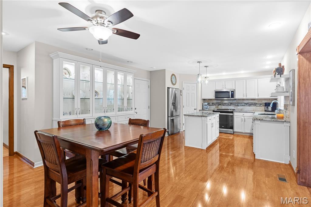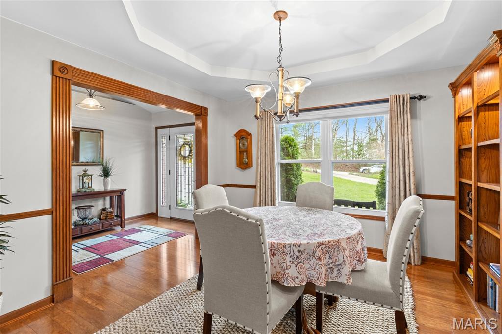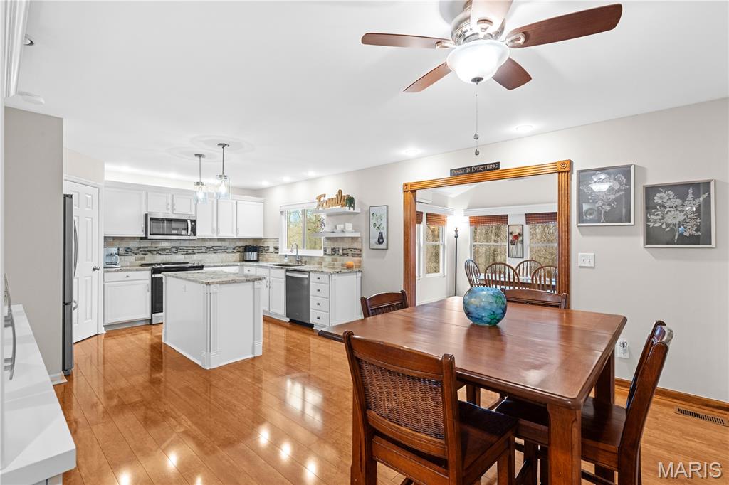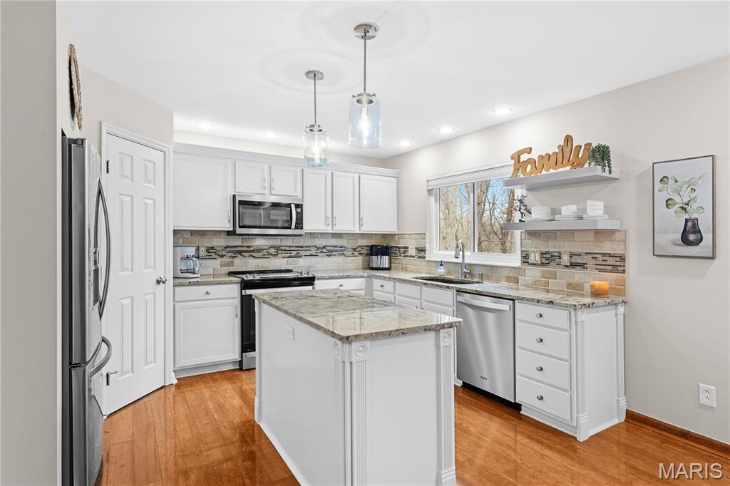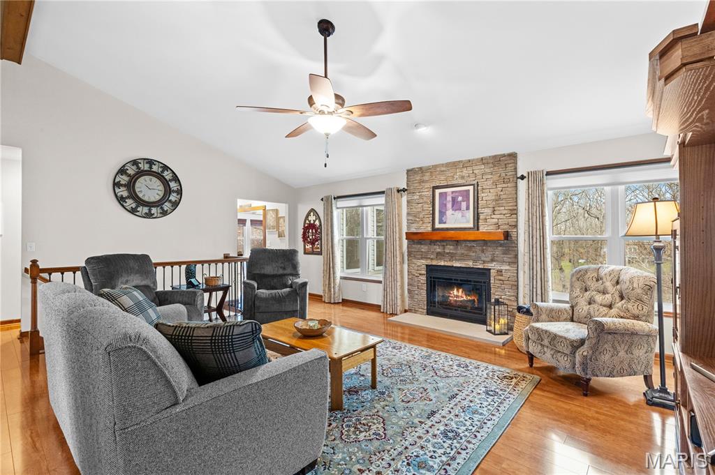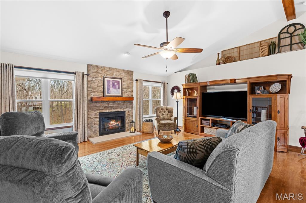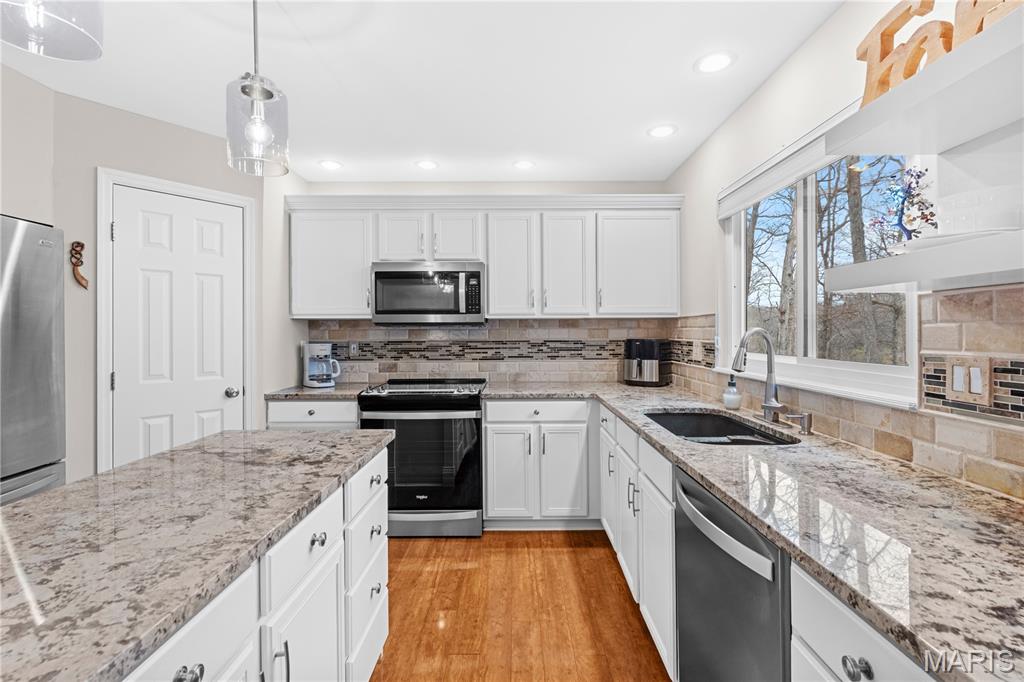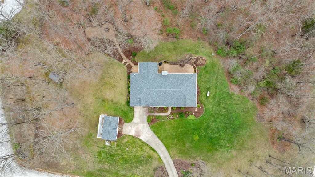 Welcome home to this beautifully maintained 3 bed, 3 full bath ranch nestled on 3 private acres in sought-after Foristell in Wentzville School District! From the moment you arrive, you’ll appreciate the peaceful, wooded setting, long driveway, and additional outbuilding—perfect for storage, hobbies, or a workshop. Inside, the home offers a warm and inviting layout with laminate flooring, a vaulted great room with stone fireplace, and abundant natural light throughout. The updated kitchen features white cabinetry, granite countertops, stainless appliances, center island, and opens seamlessly to both dining and living spaces—ideal for everyday living and entertaining. Convenient main floor laundry adds to the ease of one-level living. The spacious primary suite offers serene backyard views, a large walk-in closet, and an gorgeous updated bath with dual vanities, soaking tub, and separate shower. With 2 Additional main floor bedrooms and full bath provide flexibility for family, guests or home office. The finished lower level expands your living space with a large rec area, bar, full bath, and dedicated media space—perfect for entertaining. Step outside to your private retreat featuring a covered patio, extensive paver patio space, and a cozy firepit area surrounded by mature trees—an ideal setting for relaxing evenings or gatherings. This rare combination of space, privacy, and functionality with modern updates makes this property a must-see!