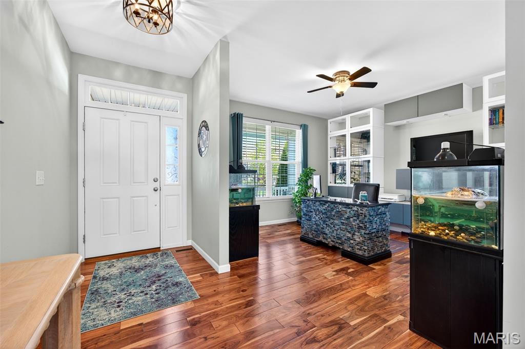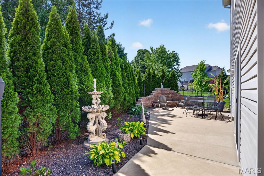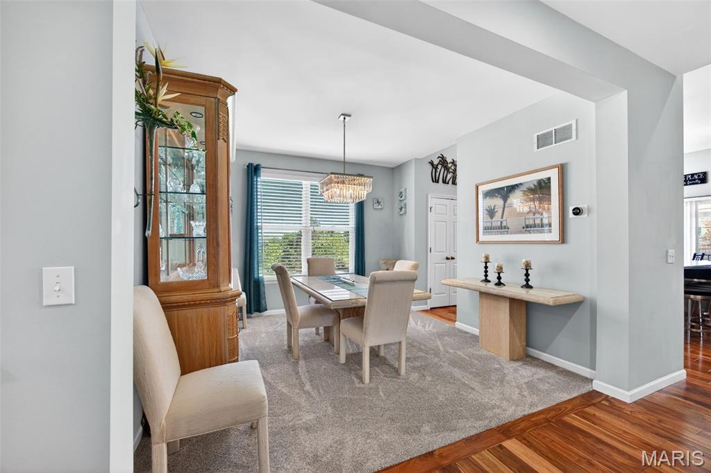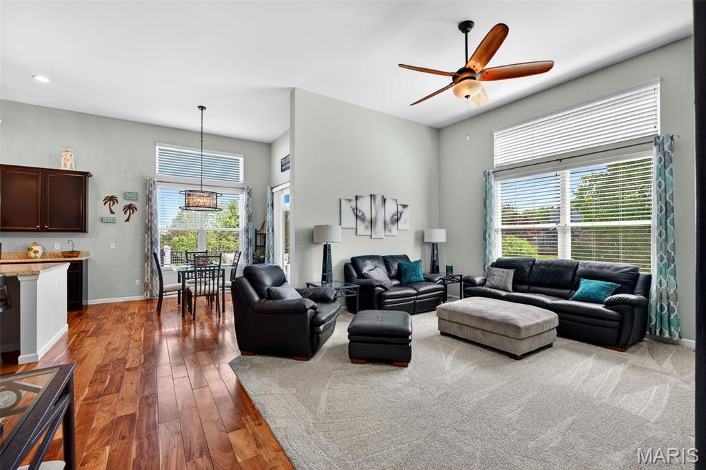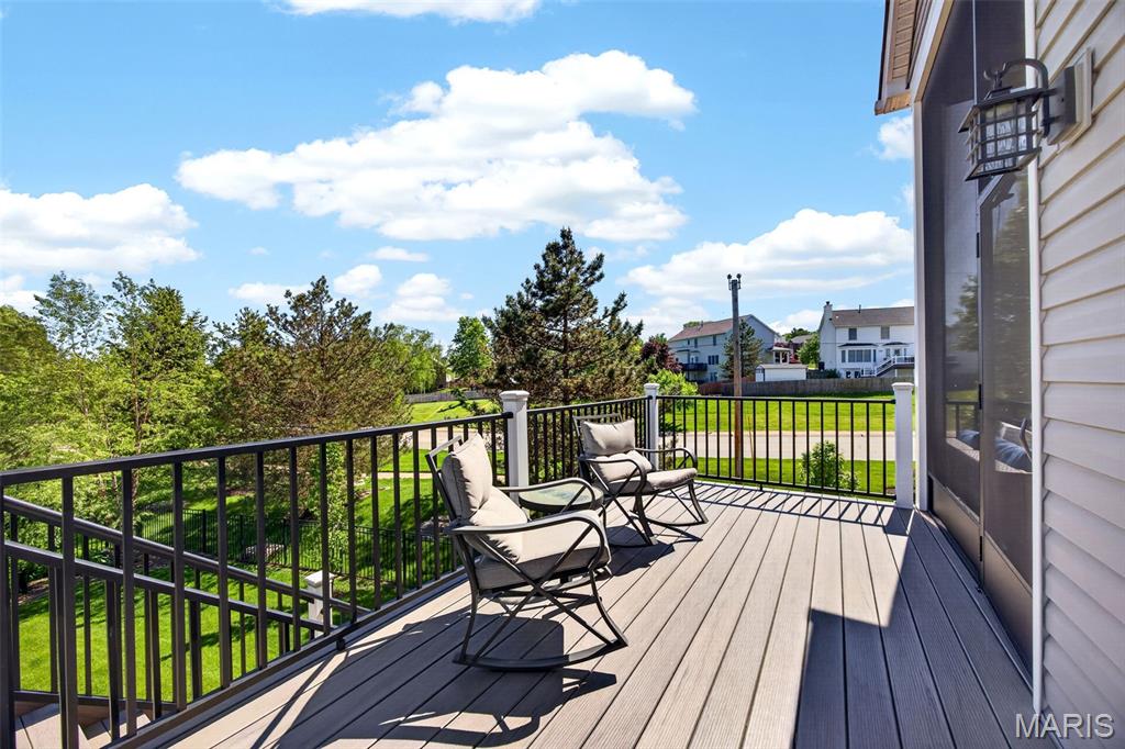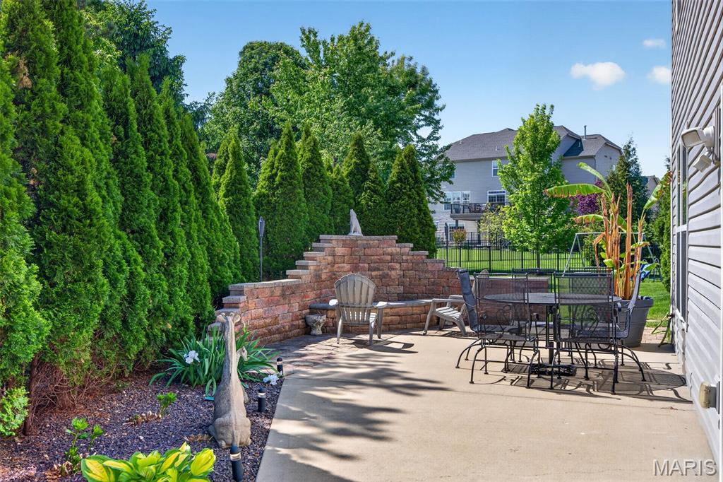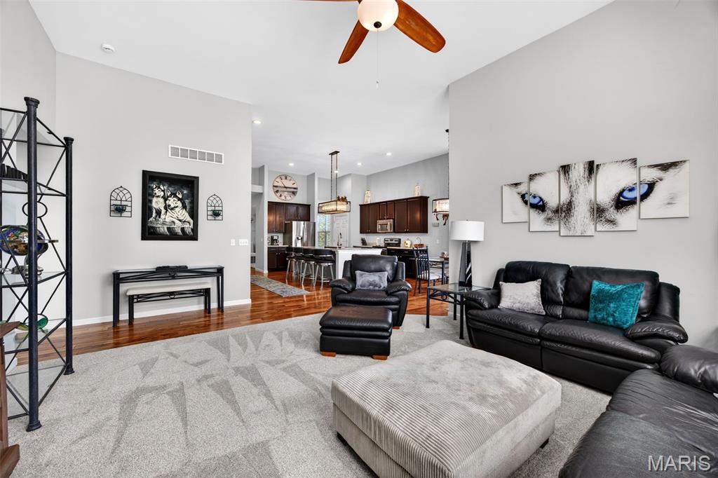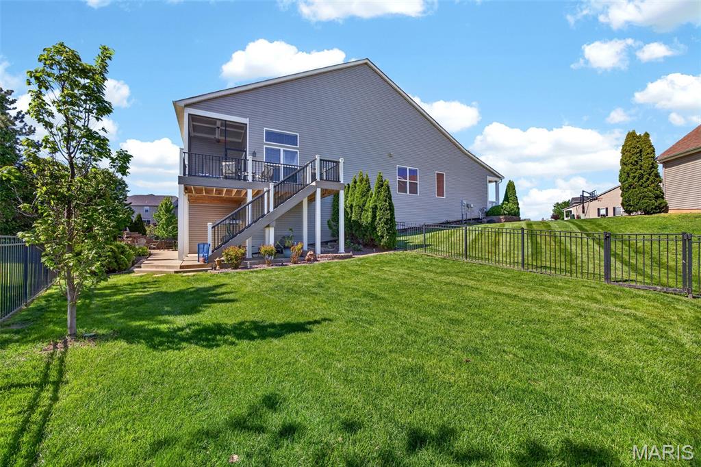 Welcome to this beautifully appointed ranch featuring rich Asian walnut hardwood floors and a thoughtfully designed open layout perfect for modern living. A private office with custom bookcases and a formal dining room set the stage for both work and entertaining. The chef’s kitchen is the true centerpiece with 12-foot ceilings, stainless steel appliances, an expansive center island, and butler’s pantry with abundant cabinetry. The adjoining great room mirrors the soaring ceilings, creating a bright, spacious feel. You will live in these spaces! The split-bedroom floor plan provides privacy, highlighted by a generous primary suite with a walk-in closet and spa-like bath with dual vanities, soaking tub, and separate shower. Two additional bedrooms offer ample space and storage. Enjoy the outdoors from the screened composite deck w/privacy shades overlooking a beautifully landscaped and fenced yard with lower-level patio and brick fire pit, perfect for relaxing and entertaining. The walk-out lower level with 9 ft ceilings offers excellent potential for additional living space incl. a rough-in bath. All well-located in St. Peters, consistently ranked one of the best places to live by Money Magazine! Showings begin 4/30