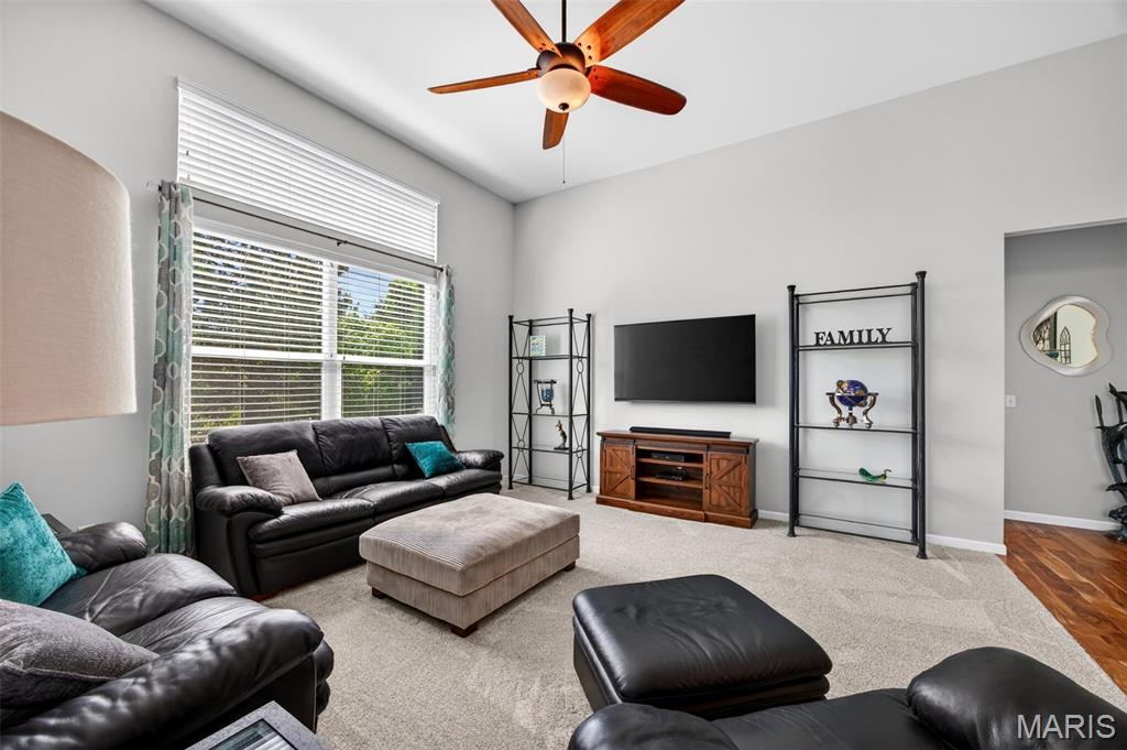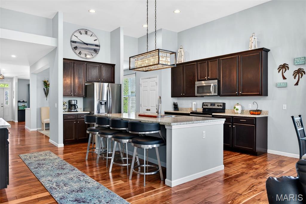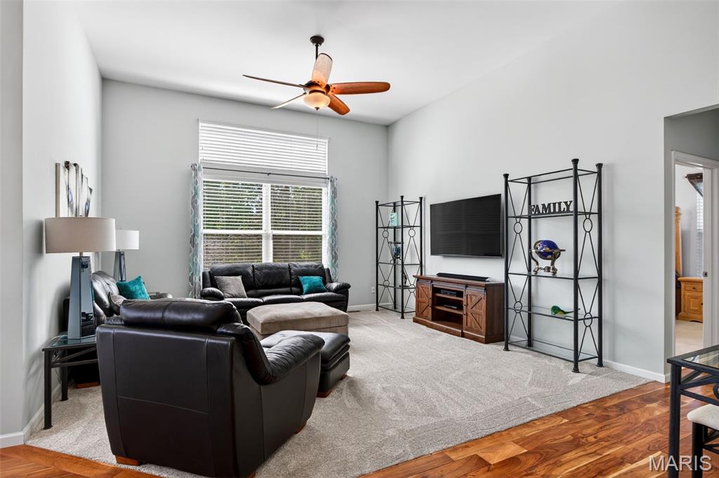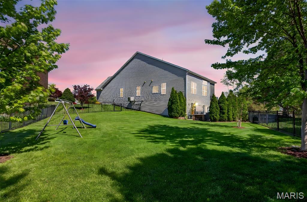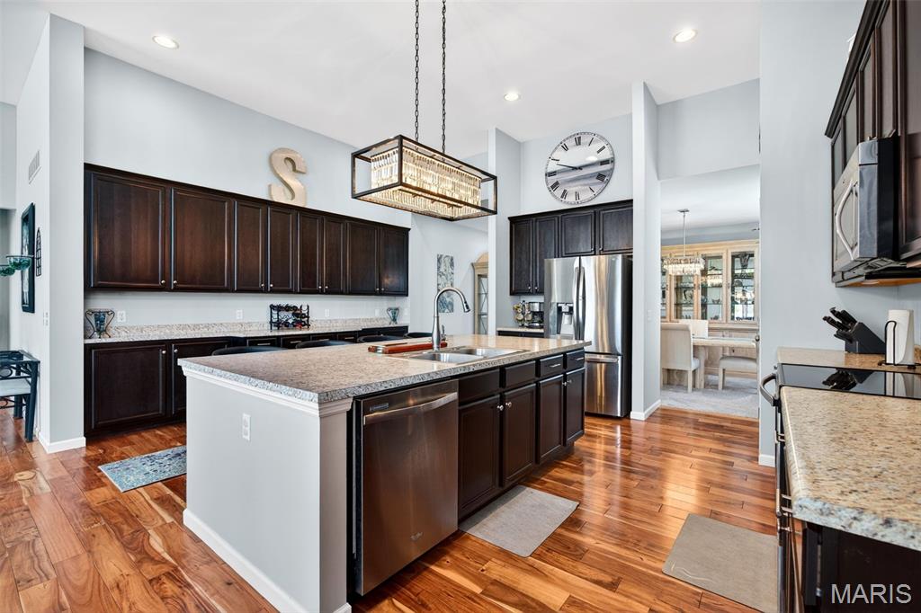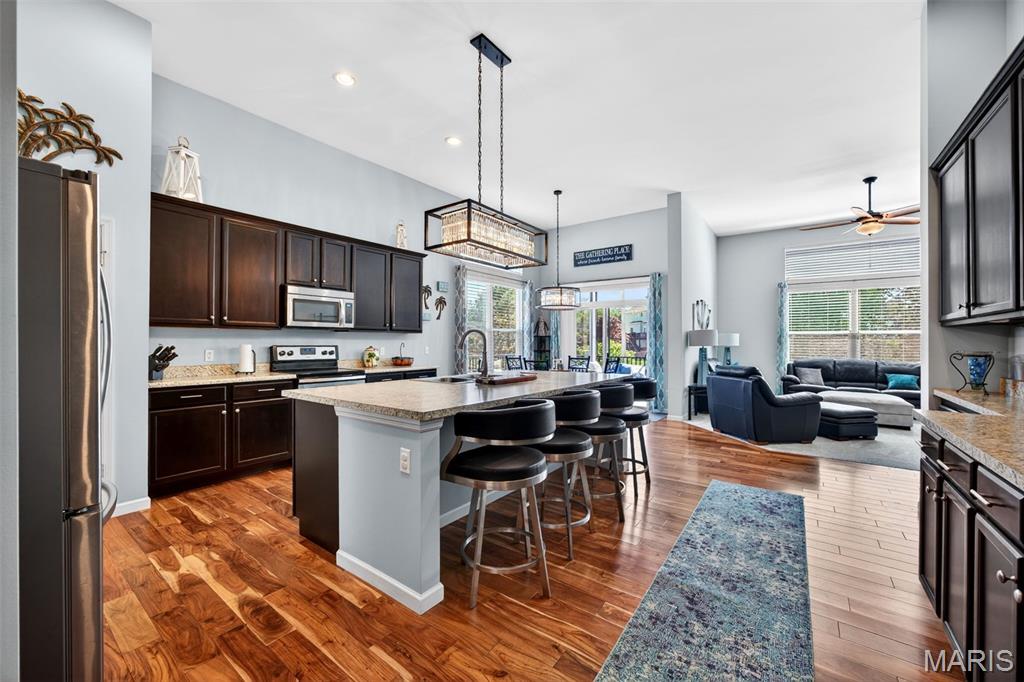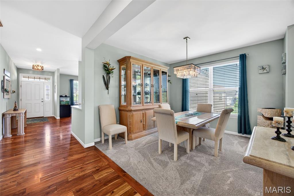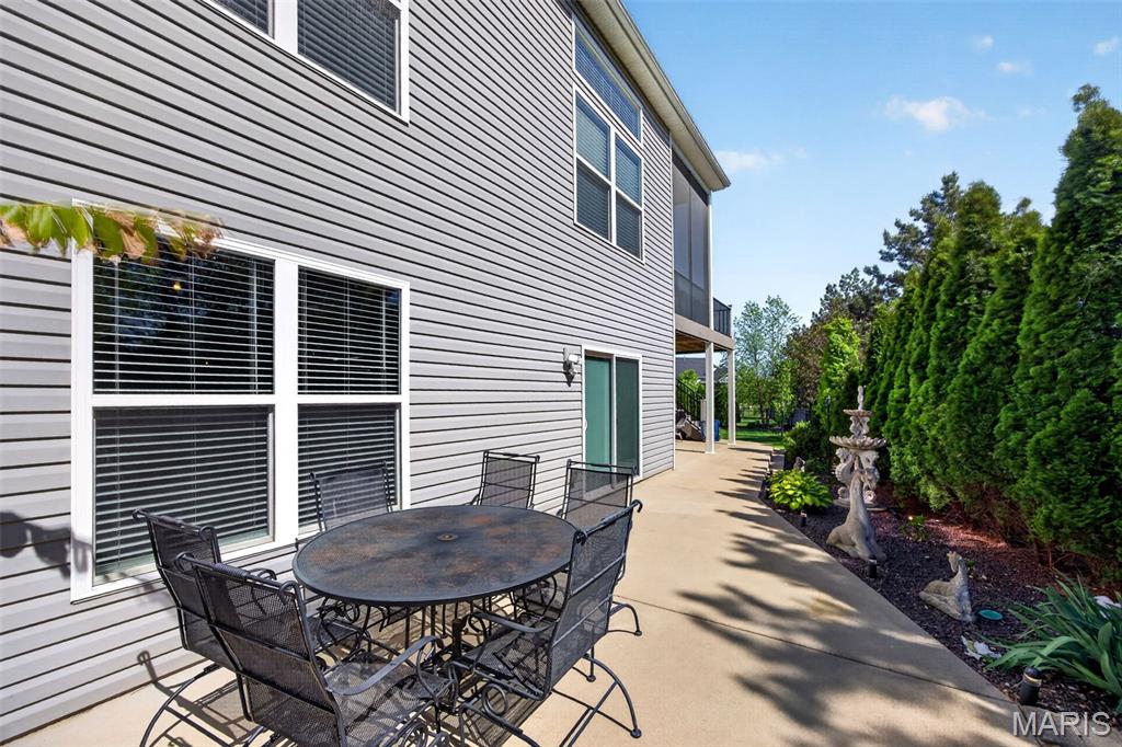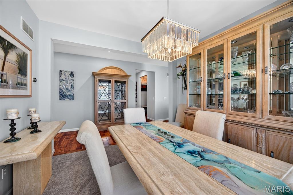 Welcome to this beautifully appointed ranch featuring rich Asian walnut hardwood floors and a thoughtfully designed open layout perfect for modern living. A private office with custom bookcases and a formal dining room set the stage for both work and entertaining. The chef’s kitchen is the true centerpiece with 12-foot ceilings, stainless steel appliances, an expansive center island, and butler’s pantry with abundant cabinetry. The adjoining great room mirrors the soaring ceilings, creating a bright, spacious feel. You will live in these spaces! The split-bedroom floor plan provides privacy, highlighted by a generous primary suite with a walk-in closet and spa-like bath with dual vanities, soaking tub, and separate shower. Two additional bedrooms offer ample space and storage. Enjoy the outdoors from the screened composite deck w/privacy shades overlooking a beautifully landscaped and fenced yard with lower-level patio and brick fire pit, perfect for relaxing and entertaining. The walk-out lower level with 9 ft ceilings offers excellent potential for additional living space incl. a rough-in bath. All well-located in St. Peters, consistently ranked one of the best places to live by Money Magazine! Showings begin 4/30