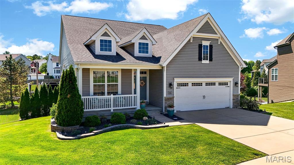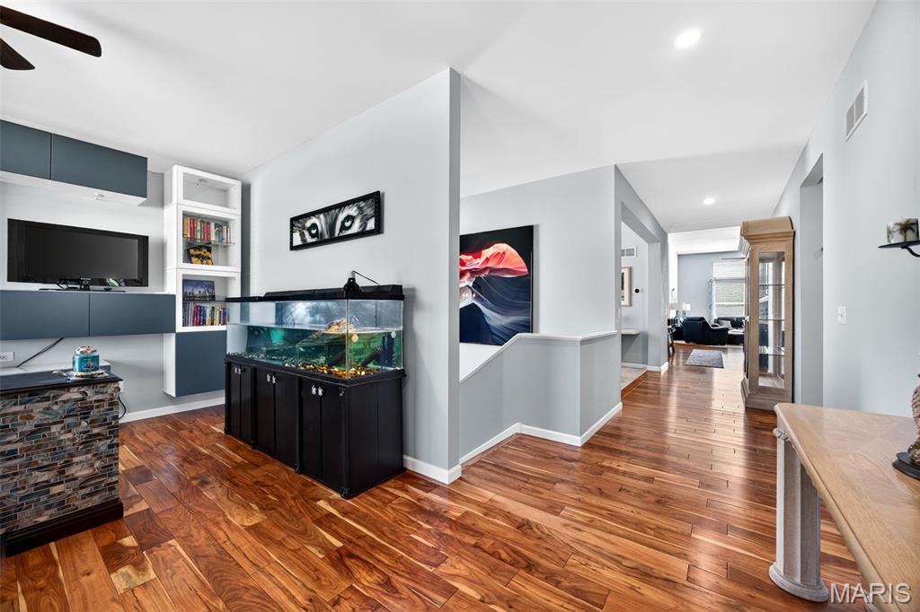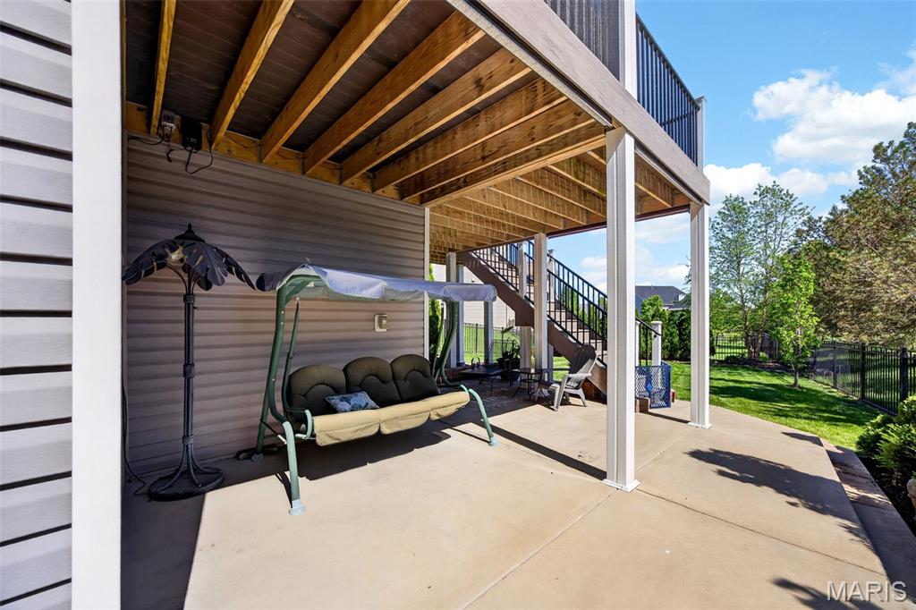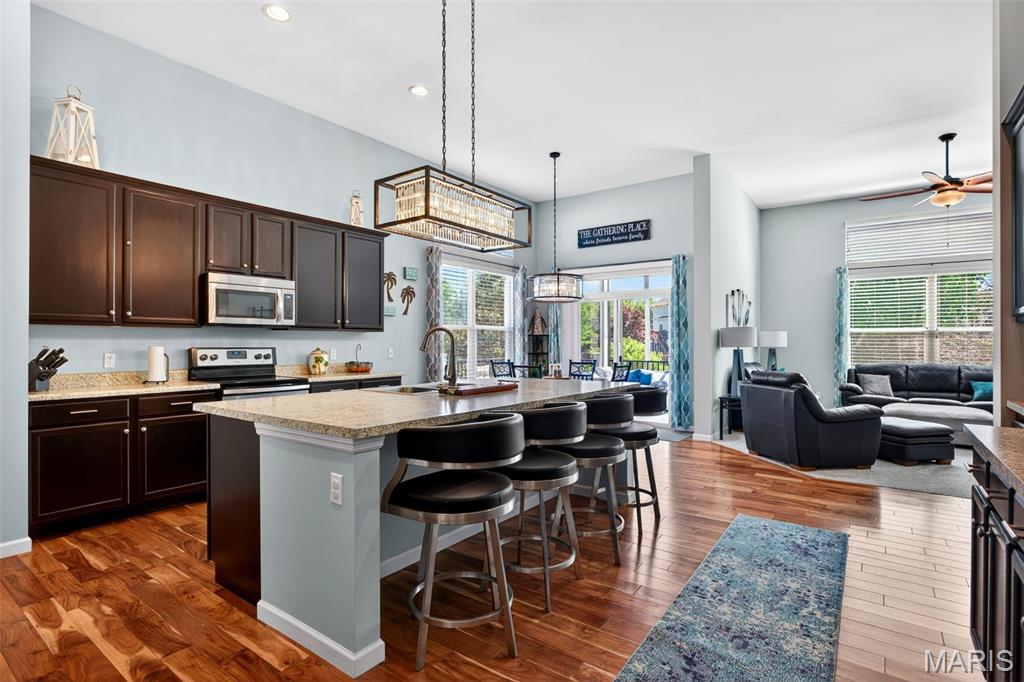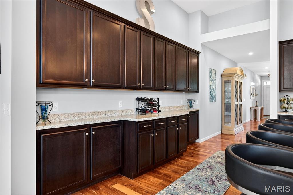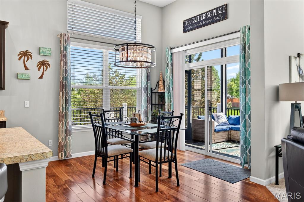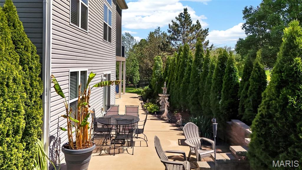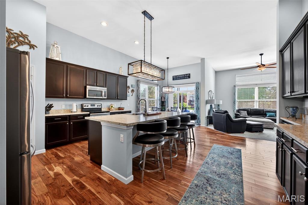 Welcome to this beautifully appointed ranch featuring rich Asian walnut hardwood floors and a thoughtfully designed open layout perfect for modern living. A private office with custom bookcases and a formal dining room set the stage for both work and entertaining. The chef’s kitchen is the true centerpiece with 12-foot ceilings, stainless steel appliances, an expansive center island, and butler’s pantry with abundant cabinetry. The adjoining great room mirrors the soaring ceilings, creating a bright, spacious feel. You will live in these spaces! The split-bedroom floor plan provides privacy, highlighted by a generous primary suite with a walk-in closet and spa-like bath with dual vanities, soaking tub, and separate shower. Two additional bedrooms offer ample space and storage. Enjoy the outdoors from the screened composite deck w/privacy shades overlooking a beautifully landscaped and fenced yard with lower-level patio and brick fire pit, perfect for relaxing and entertaining. The walk-out lower level with 9 ft ceilings offers excellent potential for additional living space incl. a rough-in bath. All well-located in St. Peters, consistently ranked one of the best places to live by Money Magazine! Showings begin 4/30