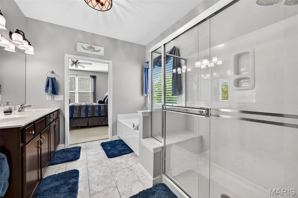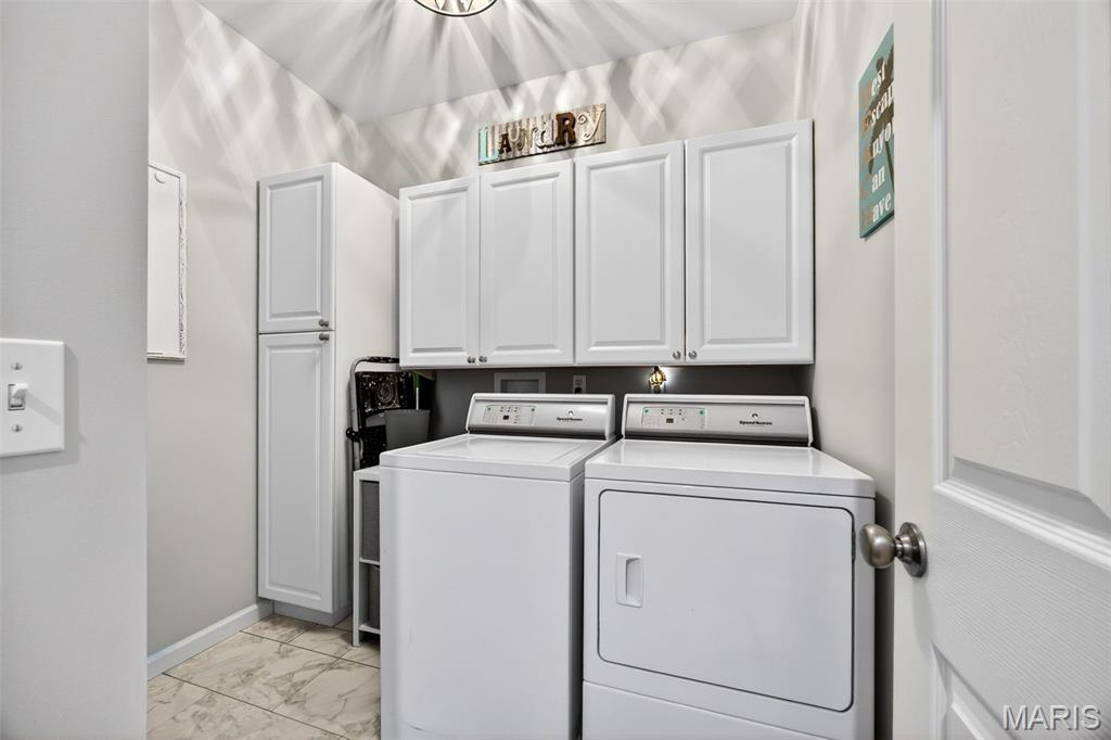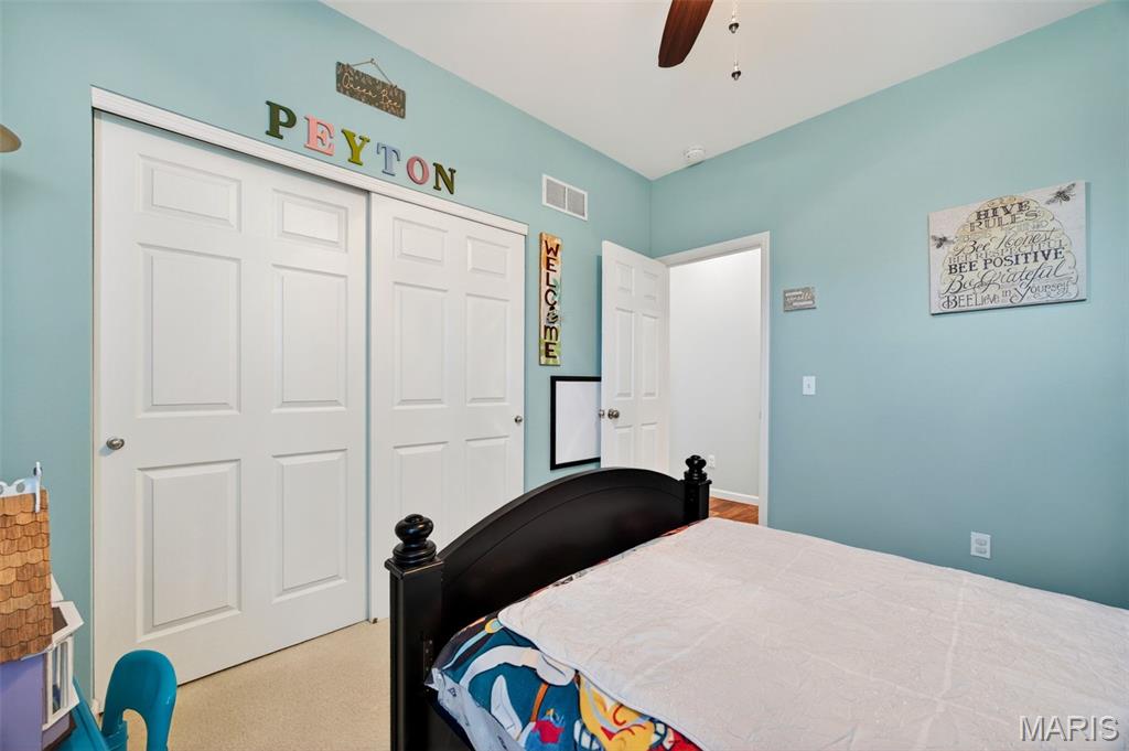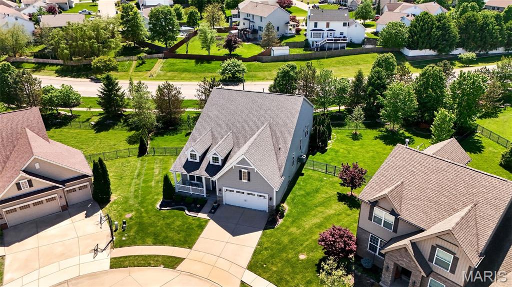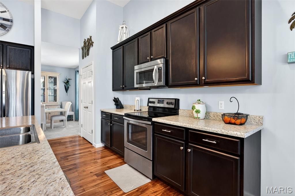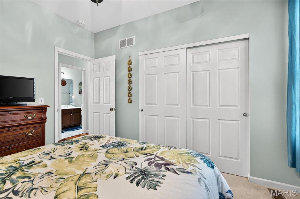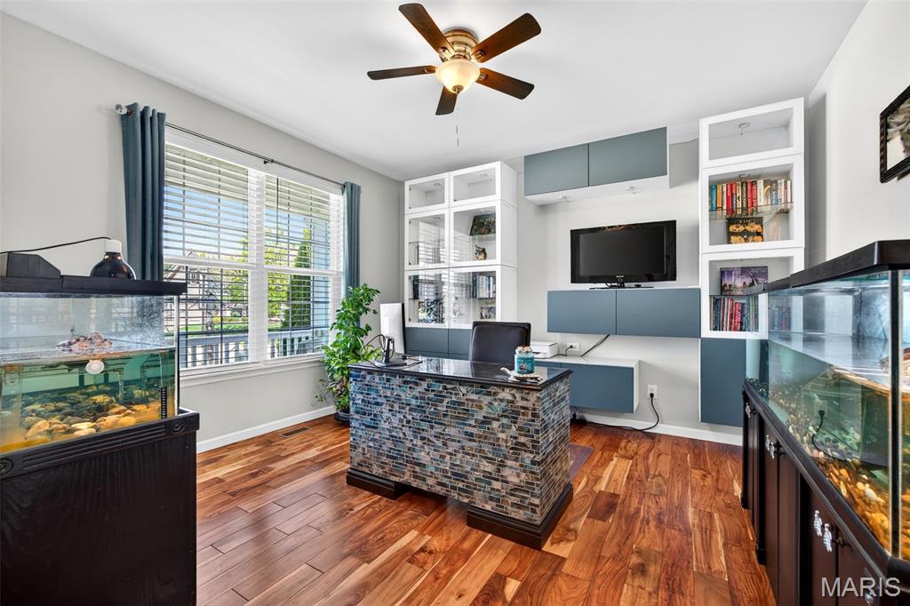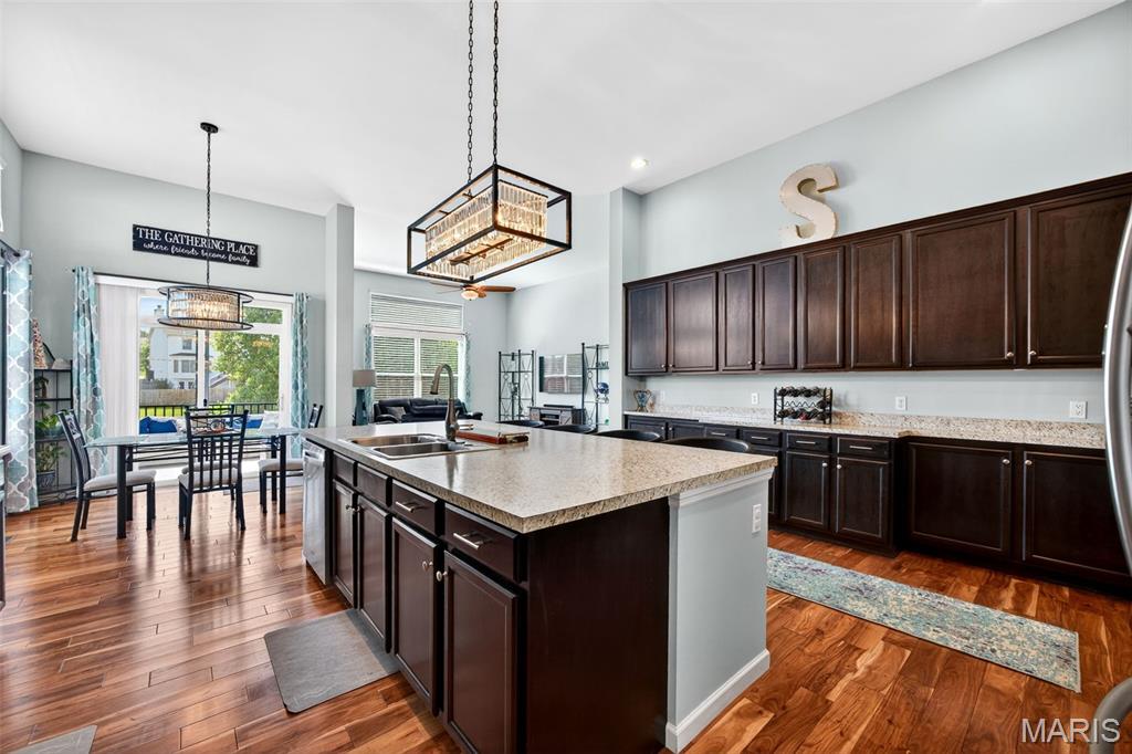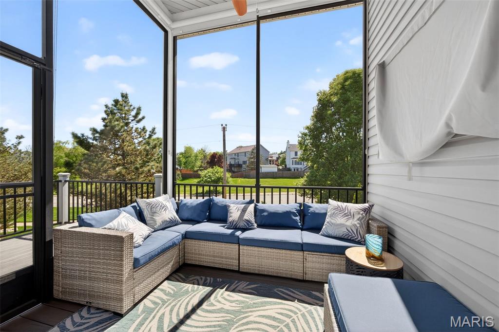 Welcome to this beautifully appointed ranch featuring rich Asian walnut hardwood floors and a thoughtfully designed open layout perfect for modern living. A private office with custom bookcases and a formal dining room set the stage for both work and entertaining. The chef’s kitchen is the true centerpiece with 12-foot ceilings, stainless steel appliances, an expansive center island, and butler’s pantry with abundant cabinetry. The adjoining great room mirrors the soaring ceilings, creating a bright, spacious feel. You will live in these spaces! The split-bedroom floor plan provides privacy, highlighted by a generous primary suite with a walk-in closet and spa-like bath with dual vanities, soaking tub, and separate shower. Two additional bedrooms offer ample space and storage. Enjoy the outdoors from the screened composite deck w/privacy shades overlooking a beautifully landscaped and fenced yard with lower-level patio and brick fire pit, perfect for relaxing and entertaining. The walk-out lower level with 9 ft ceilings offers excellent potential for additional living space incl. a rough-in bath. All well-located in St. Peters, consistently ranked one of the best places to live by Money Magazine! Showings begin 4/30