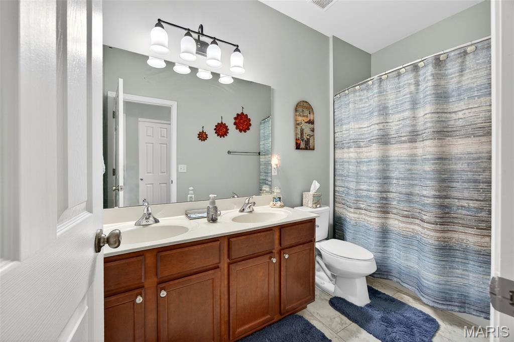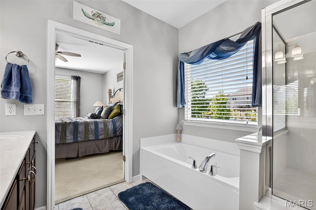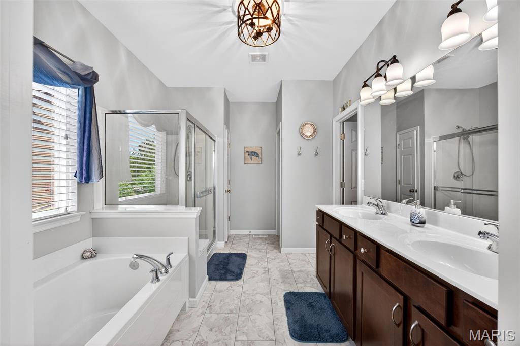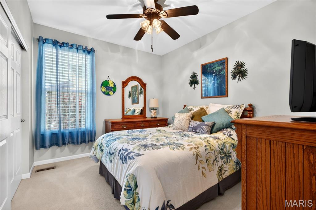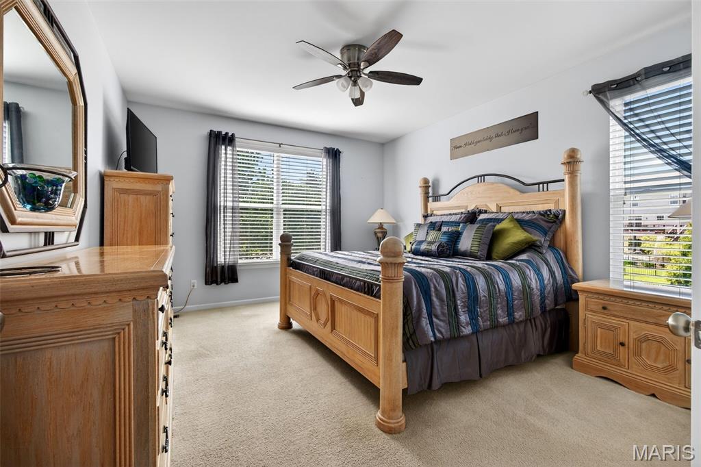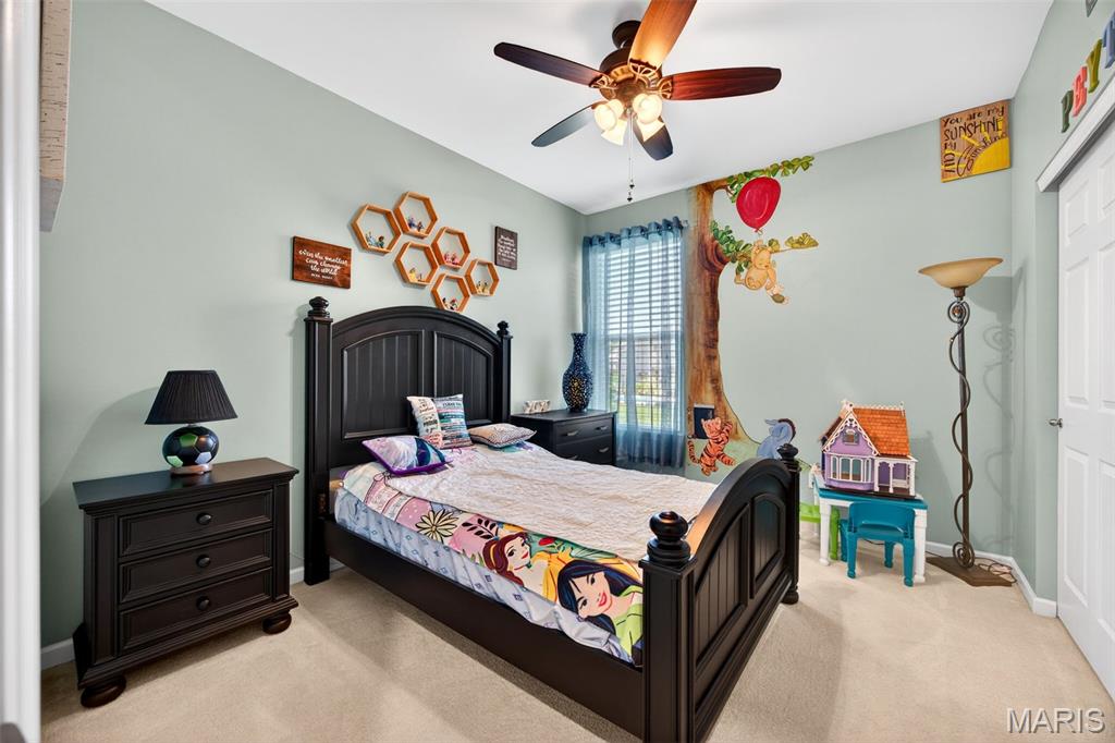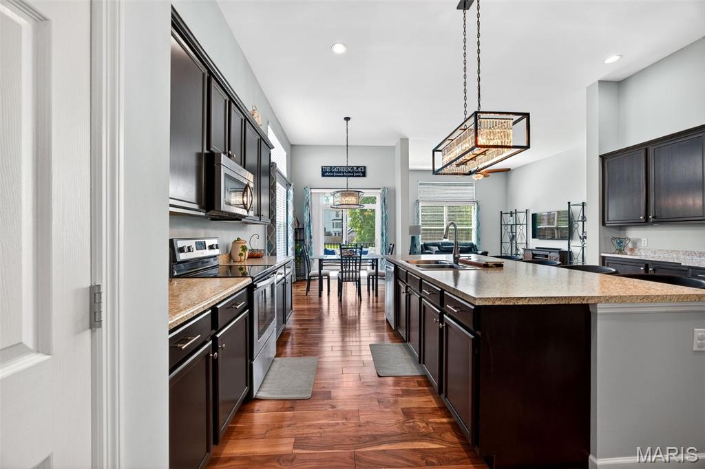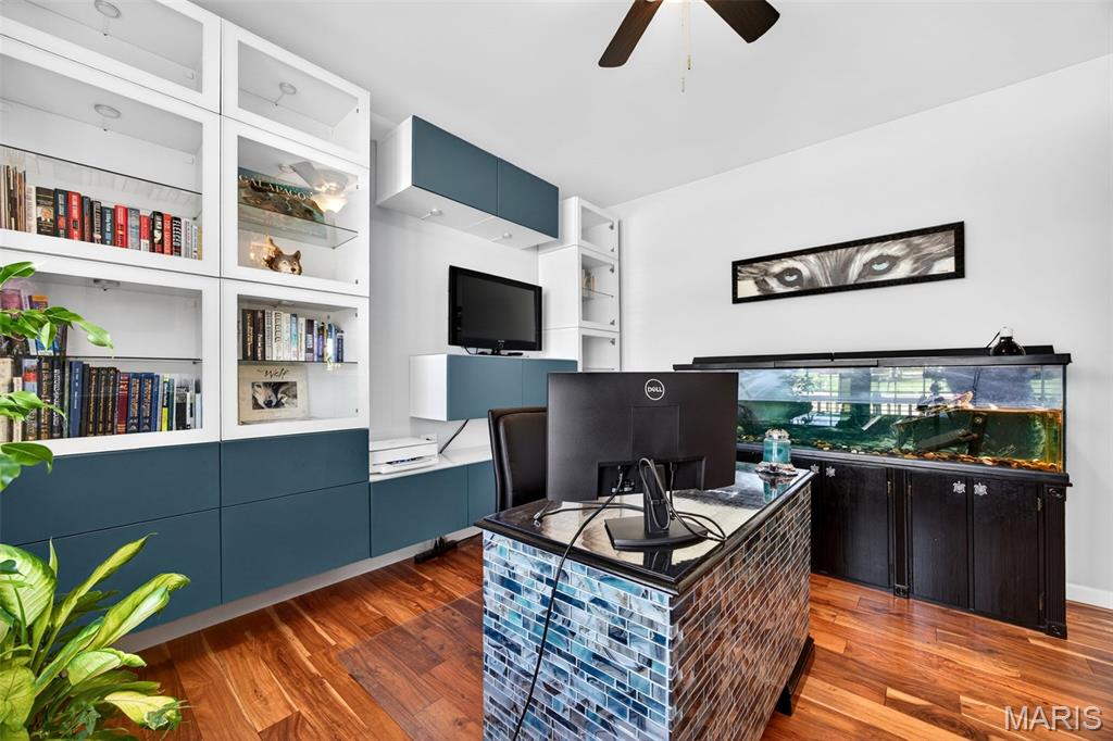 Welcome to this beautifully appointed ranch featuring rich Asian walnut hardwood floors and a thoughtfully designed open layout perfect for modern living. A private office with custom bookcases and a formal dining room set the stage for both work and entertaining. The chef’s kitchen is the true centerpiece with 12-foot ceilings, stainless steel appliances, an expansive center island, and butler’s pantry with abundant cabinetry. The adjoining great room mirrors the soaring ceilings, creating a bright, spacious feel. You will live in these spaces! The split-bedroom floor plan provides privacy, highlighted by a generous primary suite with a walk-in closet and spa-like bath with dual vanities, soaking tub, and separate shower. Two additional bedrooms offer ample space and storage. Enjoy the outdoors from the screened composite deck w/privacy shades overlooking a beautifully landscaped and fenced yard with lower-level patio and brick fire pit, perfect for relaxing and entertaining. The walk-out lower level with 9 ft ceilings offers excellent potential for additional living space incl. a rough-in bath. All well-located in St. Peters, consistently ranked one of the best places to live by Money Magazine! Showings begin 4/30