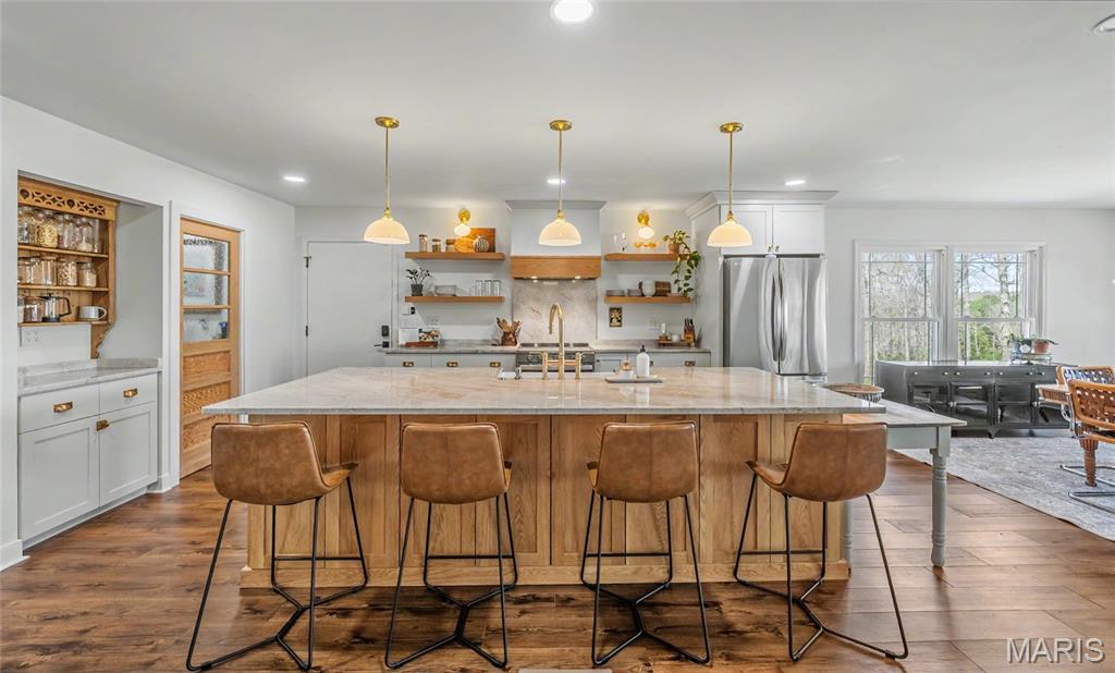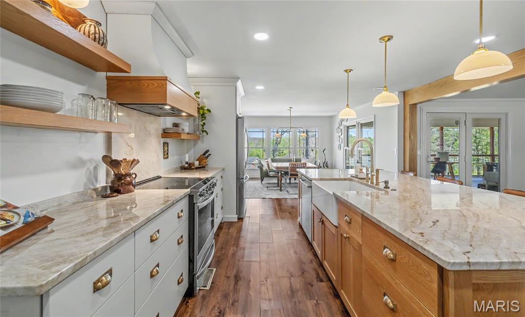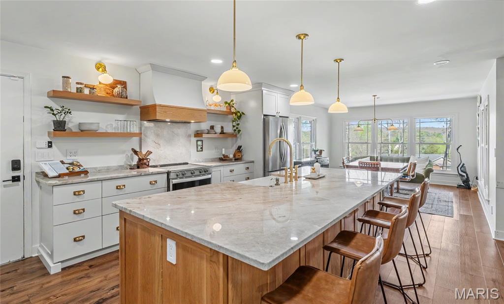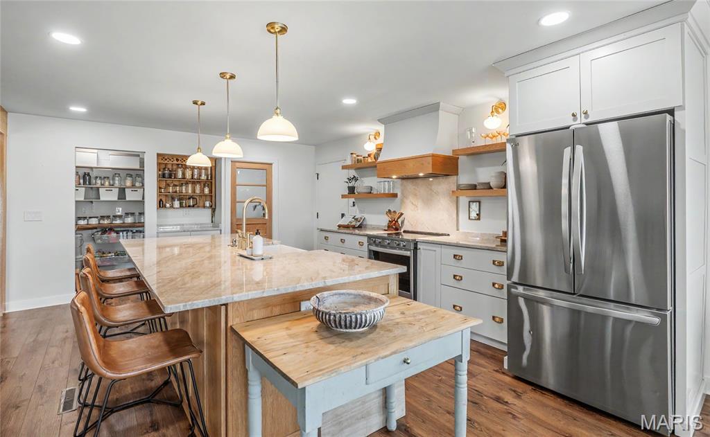 Some homes are updated. This one was reimagined. Tucked beneath a canopy of mature oaks on Meadowview Lane, this white brick ranch has been transformed with a level of craftsmanship rarely seen in Phelps County. Step through the iron entry gate into the courtyard-style front entry and something immediately feels different. This home was loved well and invested in deeply, and it shows in every room. The kitchen is extraordinary. A wall was removed, a steel beam installed, and what was created stops people in their tracks. Custom cabinetry, Taj Mahal quartzite countertops and full slab backsplash, a custom solid wood range hood, unlacquered brass hardware that will only grow more beautiful as it develops its natural patina, a farmhouse sink with a brass bridge faucet, open wood shelving, and brass pendant lighting. Just off the kitchen, the butler's pantry offers butcher block and custom cabinetry that provides the storage you actually need. This kitchen belongs in a design publication. The dining area wraps in windows on two sides, pulling in natural light all day and looking out into the mature trees. The open flow between these spaces is seamless and warm. A large covered deck extends the living space outside, made for morning coffee and summer gatherings, surrounded by native plantings including hydrangeas, dappled willows, lenten roses, coneflower, and yarrow, beautiful and low maintenance year after year. Every major system has been addressed and done right. New Owens Corning architectural roof in 2024. New HVAC inside and out in 2021. New high-efficiency heat pump water heater in 2024. Radon mitigation completed in 2025. Bathrooms updated in 2026. New Mohawk Air.O hypoallergenic carpet. New gutter screens. Fresh paint throughout. Smart home lighting. Abode security system. Both well access and Phelps County Water Supply District No. 2 connection, with an owned water softener already in place. This is the one people call about the next morning. Come see it before someone else does.