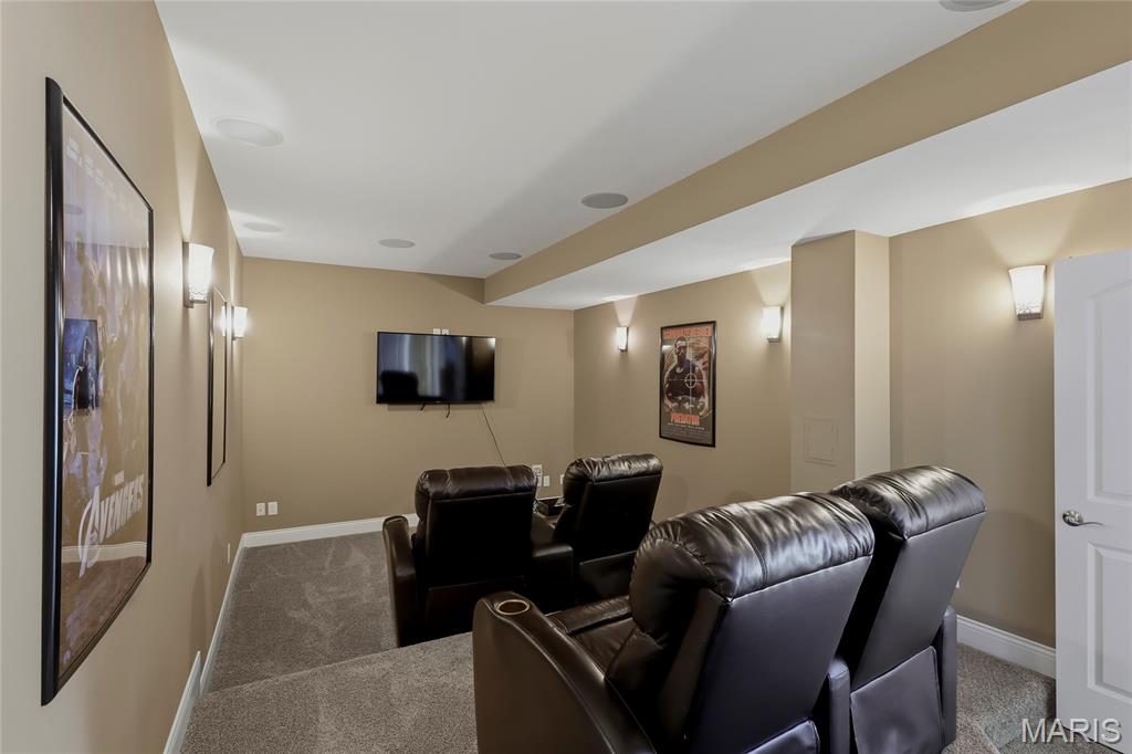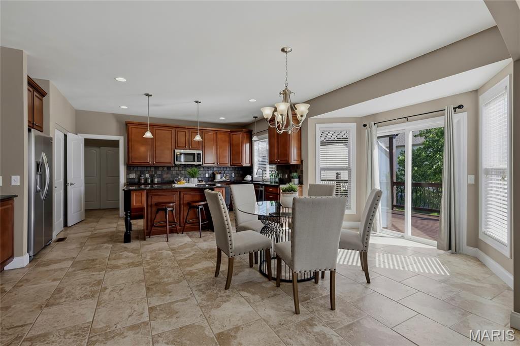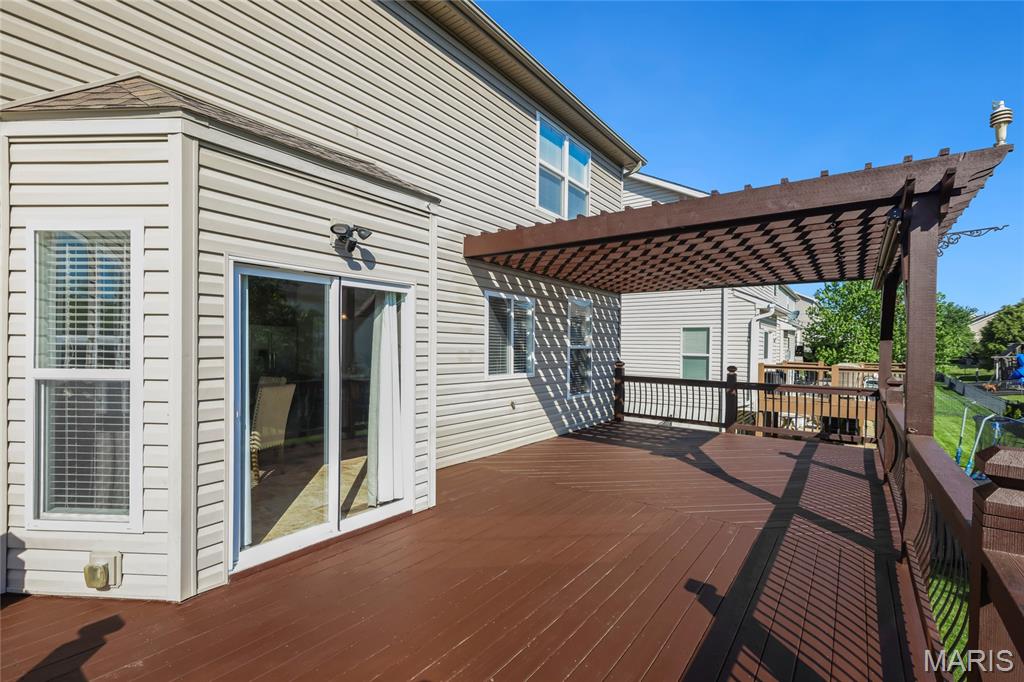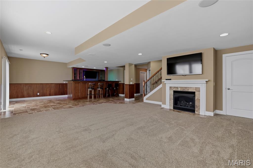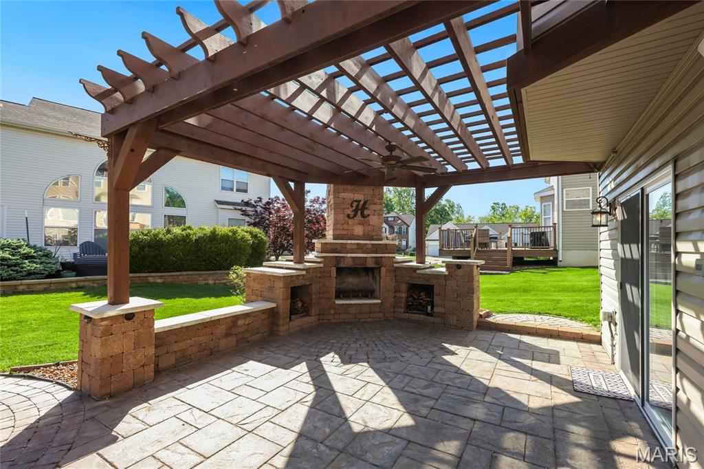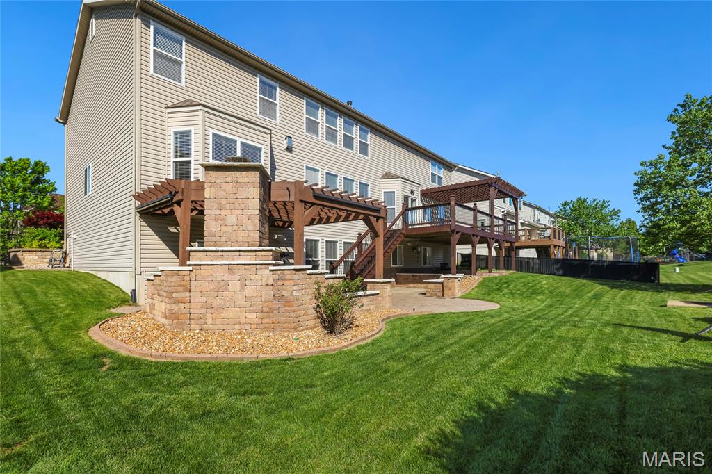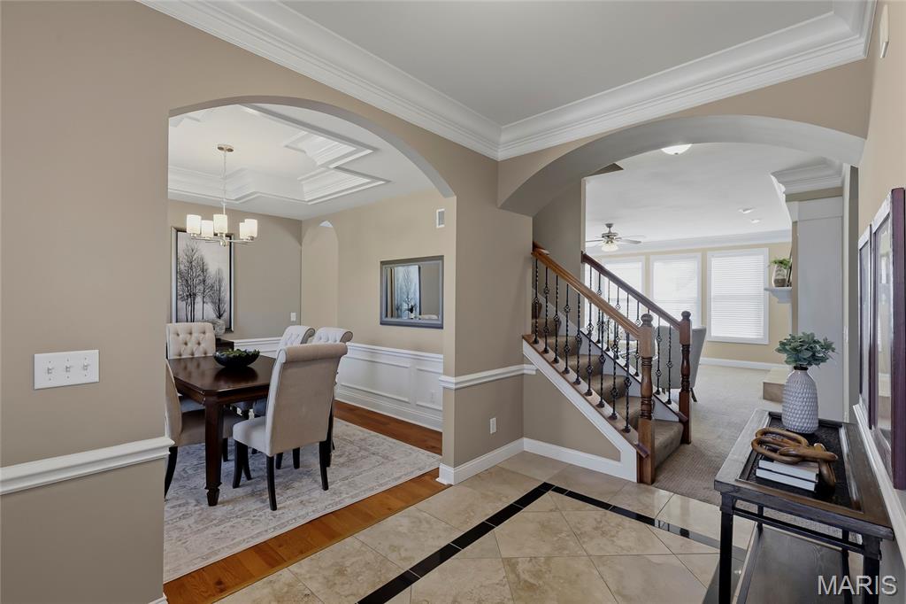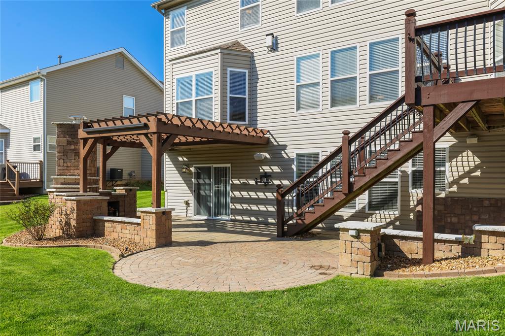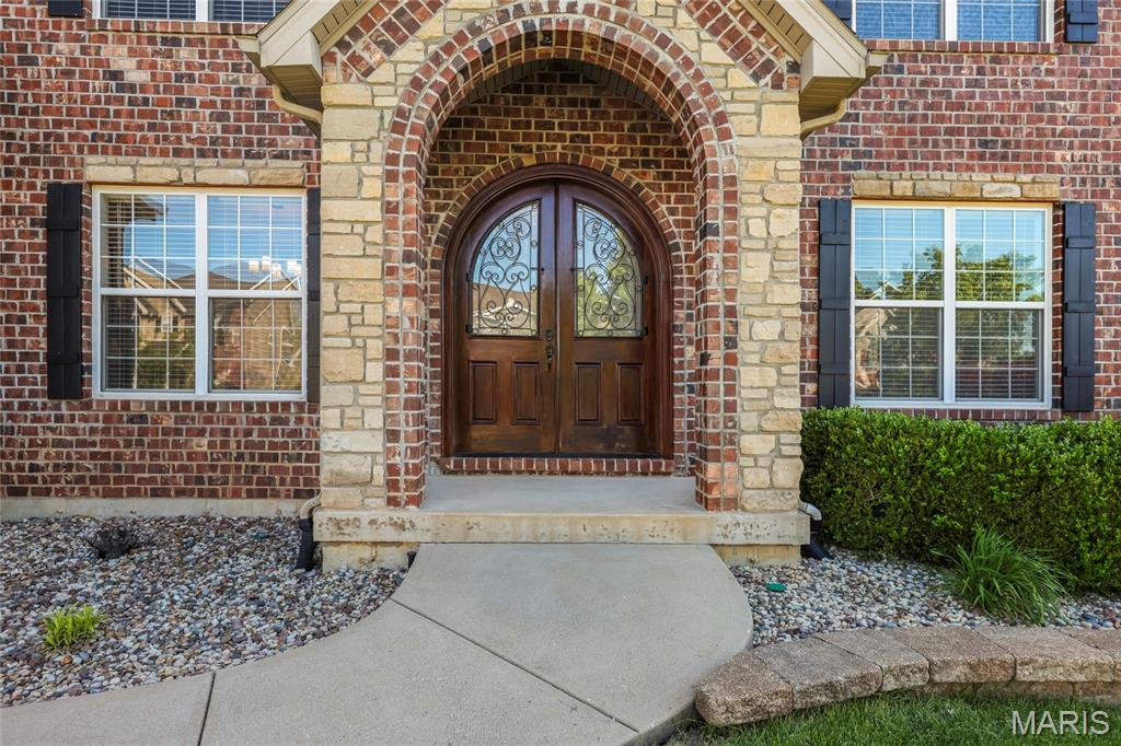 Open Sun, 4/26, 12-2pm. Stunning 1.5 story home located in the sought after Manors of Fieldstone Farms subdivision in O'Fallon! This home boasts over 5,000 square feet of living space with 5 bedrooms, 4.5 bathrooms, and finished lower level. The front door opens to the entry foyer with a coat closet and tile floors. The entry foyer opens to the formal dining room with gleaming hardwood floors, a coffered ceiling, and wainscoting. The living room features a gas fireplace, built-in bookshelves, wall of windows, and opens to the kitchen. The kitchen boasts 42 inch cabinetry with crown molding, granite countertops, soft close drawers, stainless steel appliances, new gas range (2025), new microwave (2026), refrigerator which is included, a tile backsplash, center island, pantry, planning desk, and dining area with a bay window. The primary bedroom features a bay window, walk-in closet with custom shelving, and a luxurious bathroom with a dual vanity, tile floors, soaking tub, and separate shower with a tile surround. The powder room, mud room with a closet, and laundry room with a utility sink complete the main level. The second floor features a huge loft and 4 bedrooms. One bedroom has dual closets and double doors. Another bedroom has a private full bathroom and walk-in closet. The other two bedrooms have walk-in closets and a Jack and Jill bathroom. The finished, walkout lower level boasts a huge recreation room, full bathroom, home theatre, and ample storage space. The recreation room features a gas fireplace, wainscoting, built-in speakers, and a custom wet bar with granite countertops, a tile backsplash, colored LED lights, and beer taps. Other highlights include: 3 car garage, new roof (2025), new humidifier (2024), arched 2 panel doors throughout, wrought iron spindles, crown molding throughout most of the main level, archways throughout most of the main level, irrigation system, zoned HVAC, water softener, and painted neutral colors throughout. Relax outside on the wood back deck with a pergola and retractable shade, or on the stone back patio and enjoy the level yard! The patio boasts a pergola with a fan, TV mount, custom fireplace, firepit area, and speakers. Location could not be better – close to major highways, restaurants, shops, schools, and walking distance to the subdivision pool!