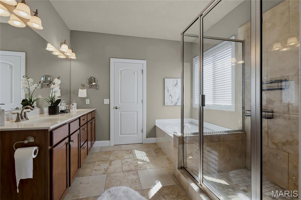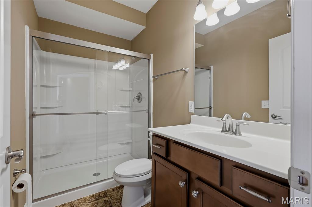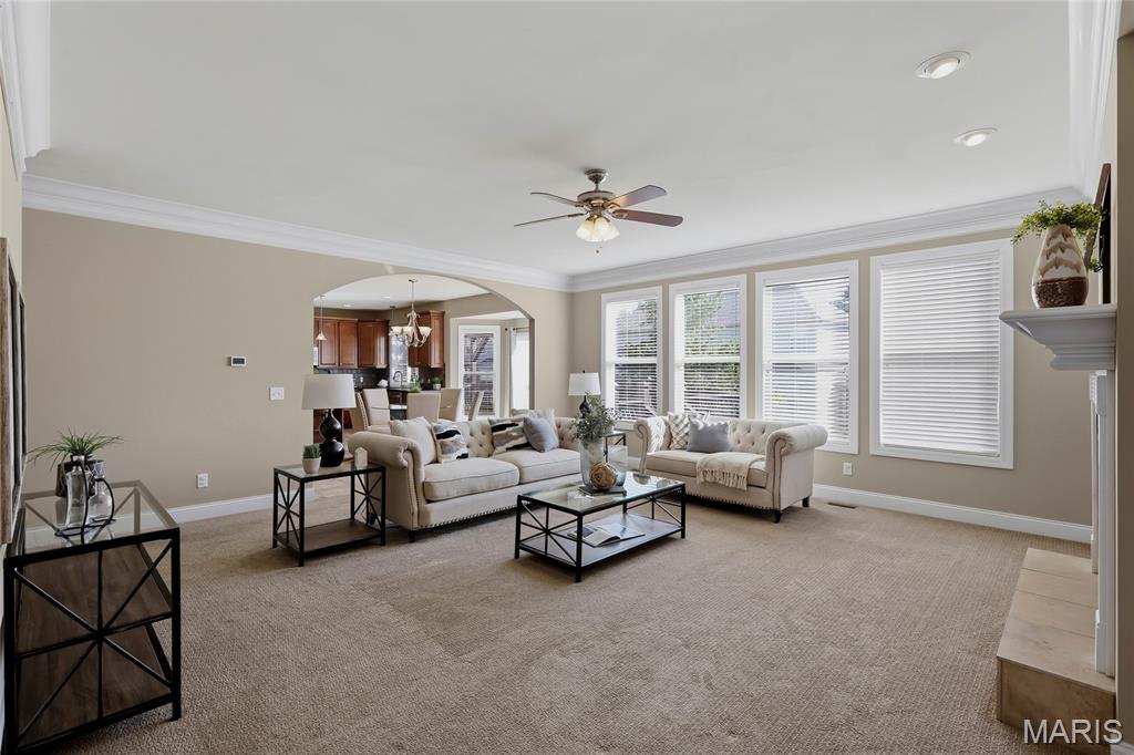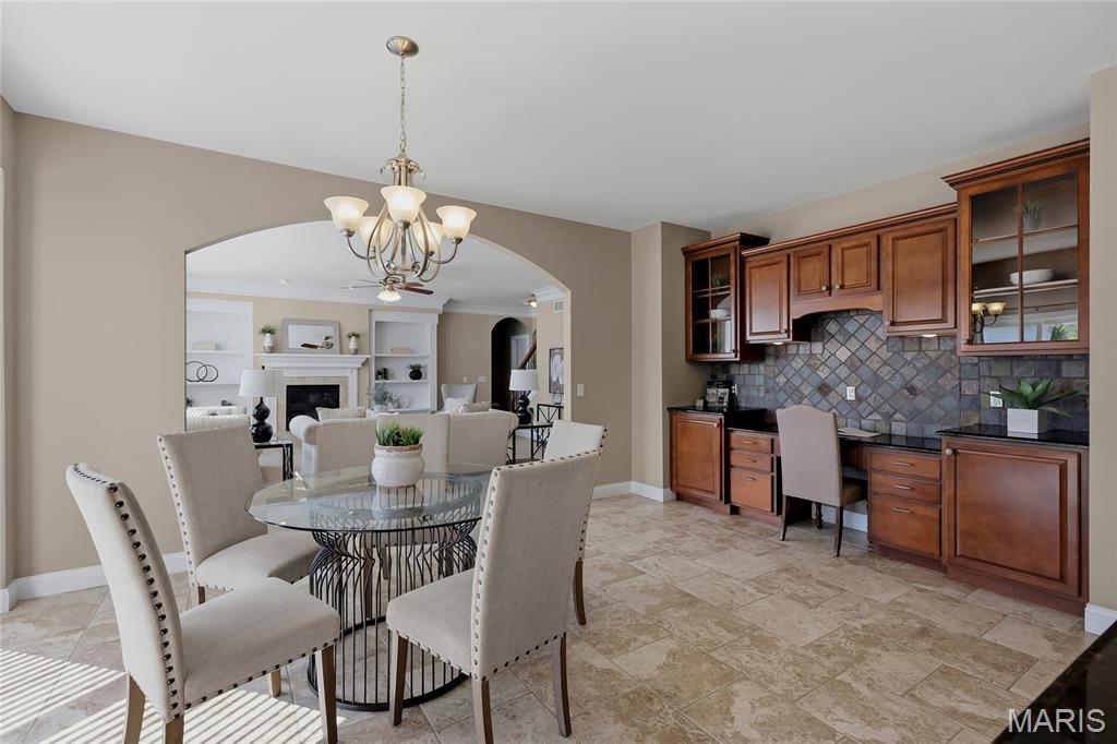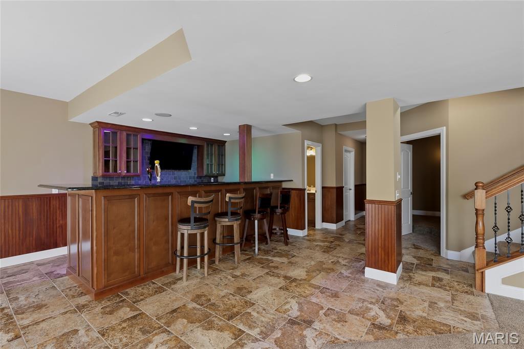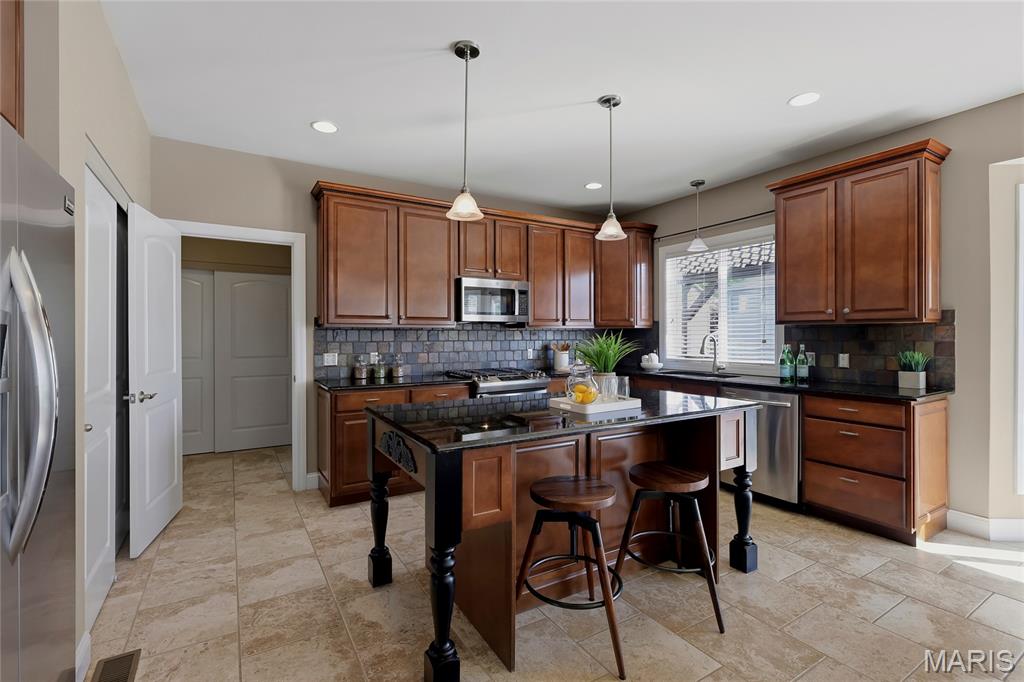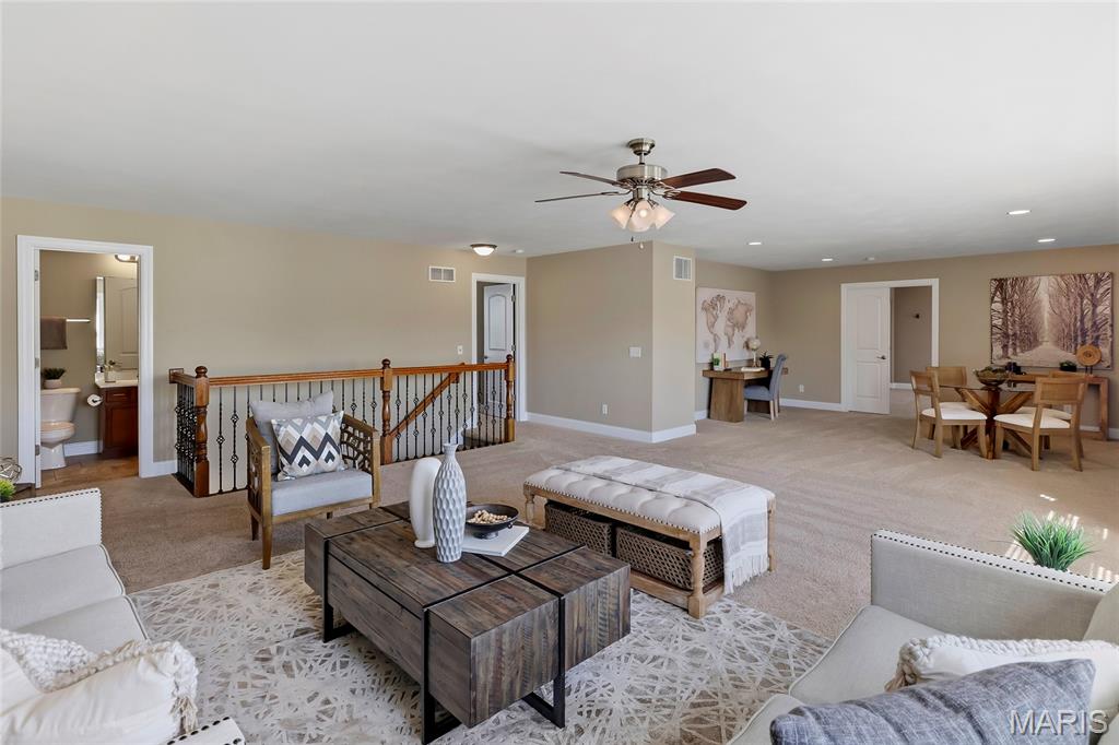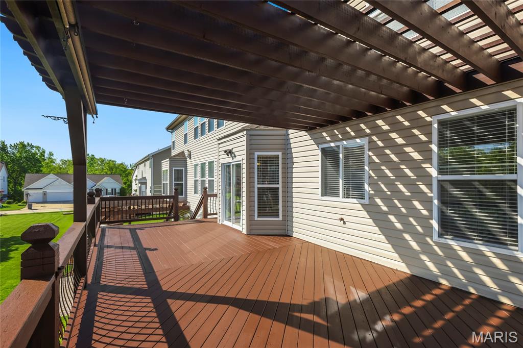 Open Sun, 4/26, 12-2pm. Stunning 1.5 story home located in the sought after Manors of Fieldstone Farms subdivision in O'Fallon! This home boasts over 5,000 square feet of living space with 5 bedrooms, 4.5 bathrooms, and finished lower level. The front door opens to the entry foyer with a coat closet and tile floors. The entry foyer opens to the formal dining room with gleaming hardwood floors, a coffered ceiling, and wainscoting. The living room features a gas fireplace, built-in bookshelves, wall of windows, and opens to the kitchen. The kitchen boasts 42 inch cabinetry with crown molding, granite countertops, soft close drawers, stainless steel appliances, new gas range (2025), new microwave (2026), refrigerator which is included, a tile backsplash, center island, pantry, planning desk, and dining area with a bay window. The primary bedroom features a bay window, walk-in closet with custom shelving, and a luxurious bathroom with a dual vanity, tile floors, soaking tub, and separate shower with a tile surround. The powder room, mud room with a closet, and laundry room with a utility sink complete the main level. The second floor features a huge loft and 4 bedrooms. One bedroom has dual closets and double doors. Another bedroom has a private full bathroom and walk-in closet. The other two bedrooms have walk-in closets and a Jack and Jill bathroom. The finished, walkout lower level boasts a huge recreation room, full bathroom, home theatre, and ample storage space. The recreation room features a gas fireplace, wainscoting, built-in speakers, and a custom wet bar with granite countertops, a tile backsplash, colored LED lights, and beer taps. Other highlights include: 3 car garage, new roof (2025), new humidifier (2024), arched 2 panel doors throughout, wrought iron spindles, crown molding throughout most of the main level, archways throughout most of the main level, irrigation system, zoned HVAC, water softener, and painted neutral colors throughout. Relax outside on the wood back deck with a pergola and retractable shade, or on the stone back patio and enjoy the level yard! The patio boasts a pergola with a fan, TV mount, custom fireplace, firepit area, and speakers. Location could not be better – close to major highways, restaurants, shops, schools, and walking distance to the subdivision pool!
