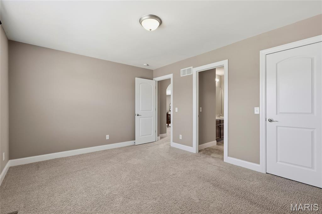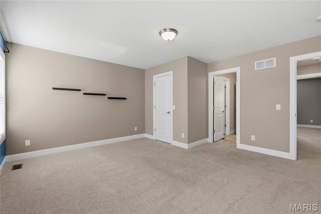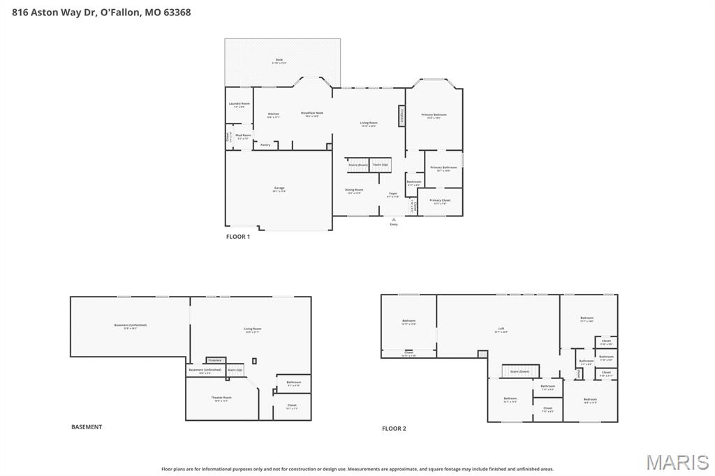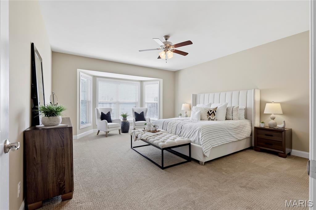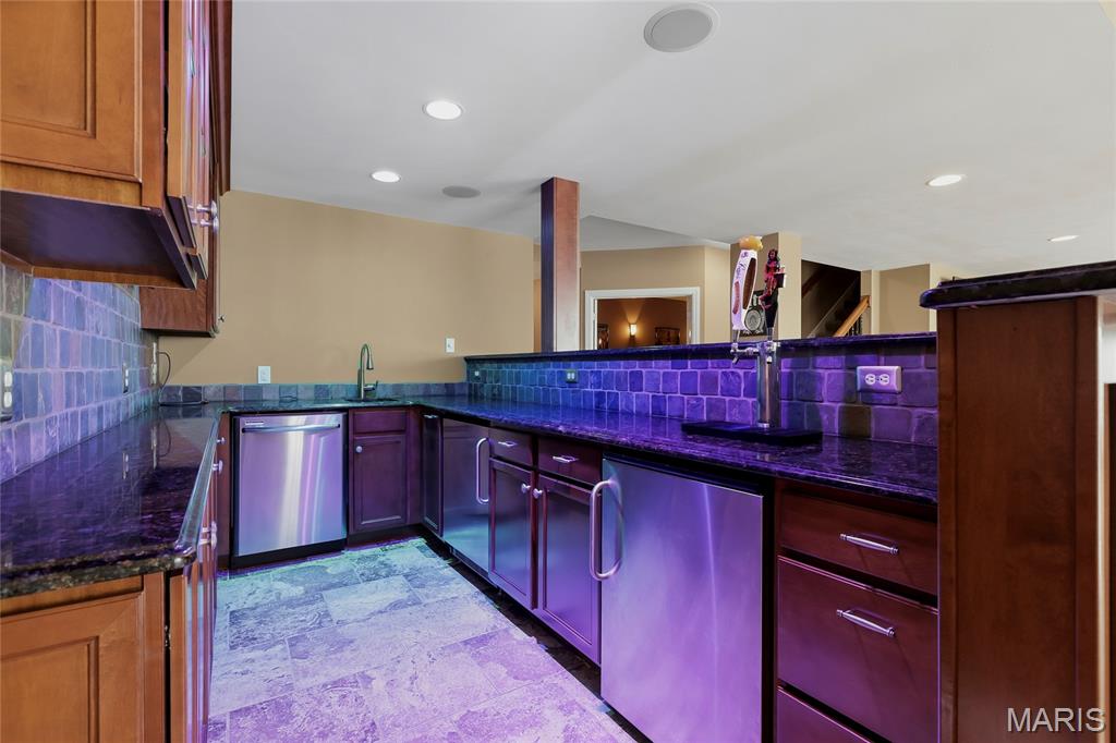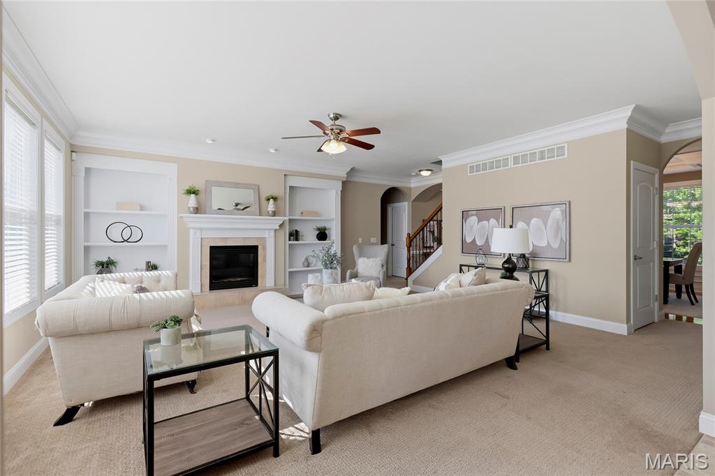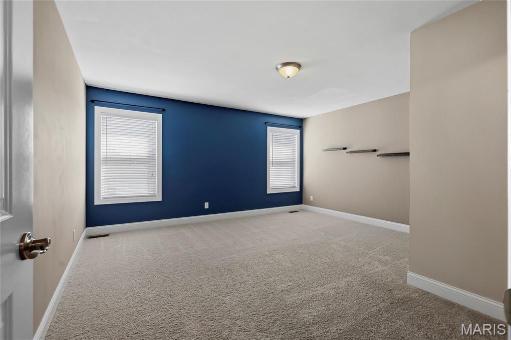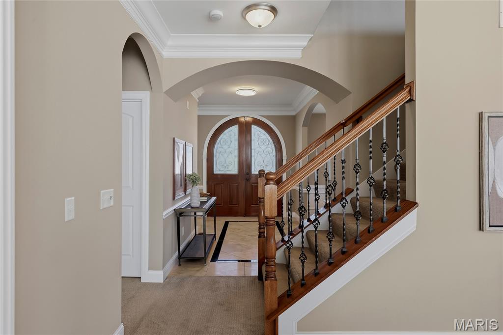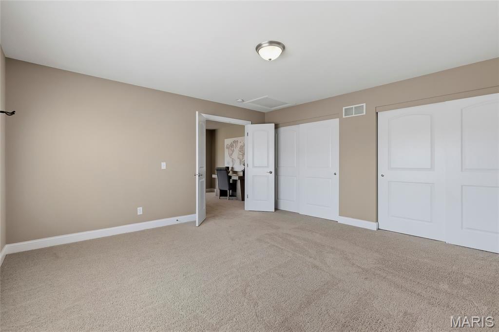Open Sun, 4/26, 12-2pm. Stunning 1.5 story home located in the sought after Manors of Fieldstone Farms subdivision in O'Fallon! This home boasts over 5,000 square feet of living space with 5 bedrooms, 4.5 bathrooms, and finished lower level. The front door opens to the entry foyer with a coat closet and tile floors. The entry foyer opens to the formal dining room with gleaming hardwood floors, a coffered ceiling, and wainscoting. The living room features a gas fireplace, built-in bookshelves, wall of windows, and opens to the kitchen. The kitchen boasts 42 inch cabinetry with crown molding, granite countertops, soft close drawers, stainless steel appliances, new gas range (2025), new microwave (2026), refrigerator which is included, a tile backsplash, center island, pantry, planning desk, and dining area with a bay window. The primary bedroom features a bay window, walk-in closet with custom shelving, and a luxurious bathroom with a dual vanity, tile floors, soaking tub, and separate shower with a tile surround. The powder room, mud room with a closet, and laundry room with a utility sink complete the main level. The second floor features a huge loft and 4 bedrooms. One bedroom has dual closets and double doors. Another bedroom has a private full bathroom and walk-in closet. The other two bedrooms have walk-in closets and a Jack and Jill bathroom. The finished, walkout lower level boasts a huge recreation room, full bathroom, home theatre, and ample storage space. The recreation room features a gas fireplace, wainscoting, built-in speakers, and a custom wet bar with granite countertops, a tile backsplash, colored LED lights, and beer taps. Other highlights include: 3 car garage, new roof (2025), new humidifier (2024), arched 2 panel doors throughout, wrought iron spindles, crown molding throughout most of the main level, archways throughout most of the main level, irrigation system, zoned HVAC, water softener, and painted neutral colors throughout. Relax outside on the wood back deck with a pergola and retractable shade, or on the stone back patio and enjoy the level yard! The patio boasts a pergola with a fan, TV mount, custom fireplace, firepit area, and speakers. Location could not be better – close to major highways, restaurants, shops, schools, and walking distance to the subdivision pool!