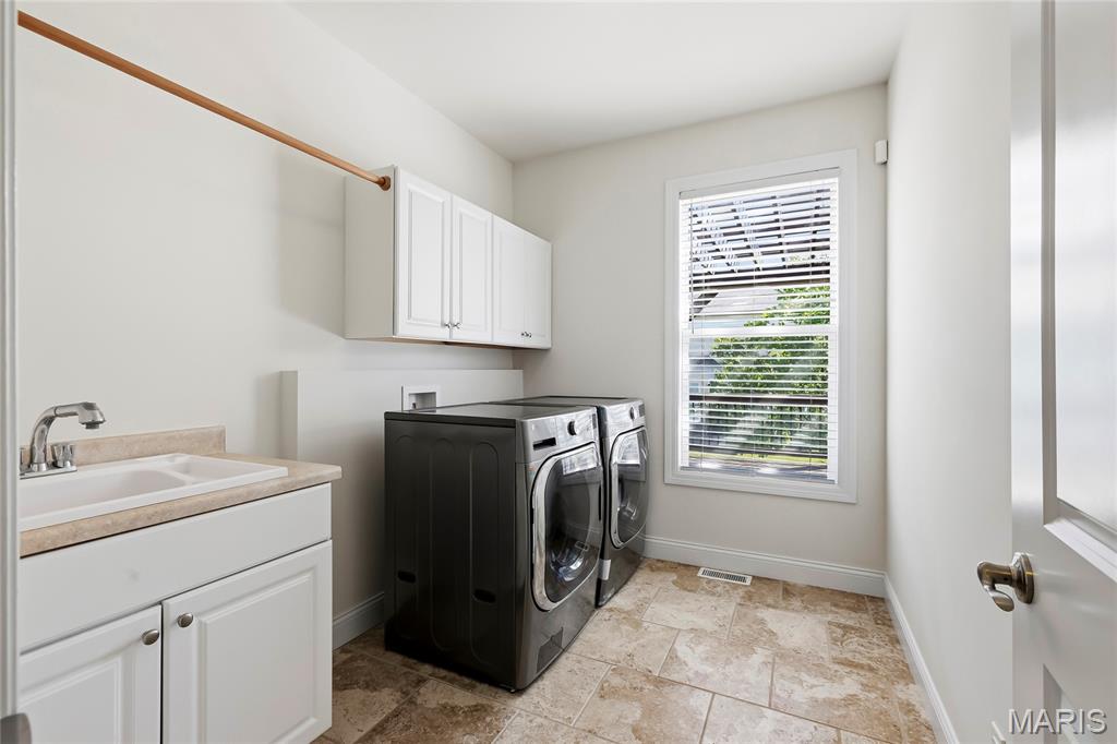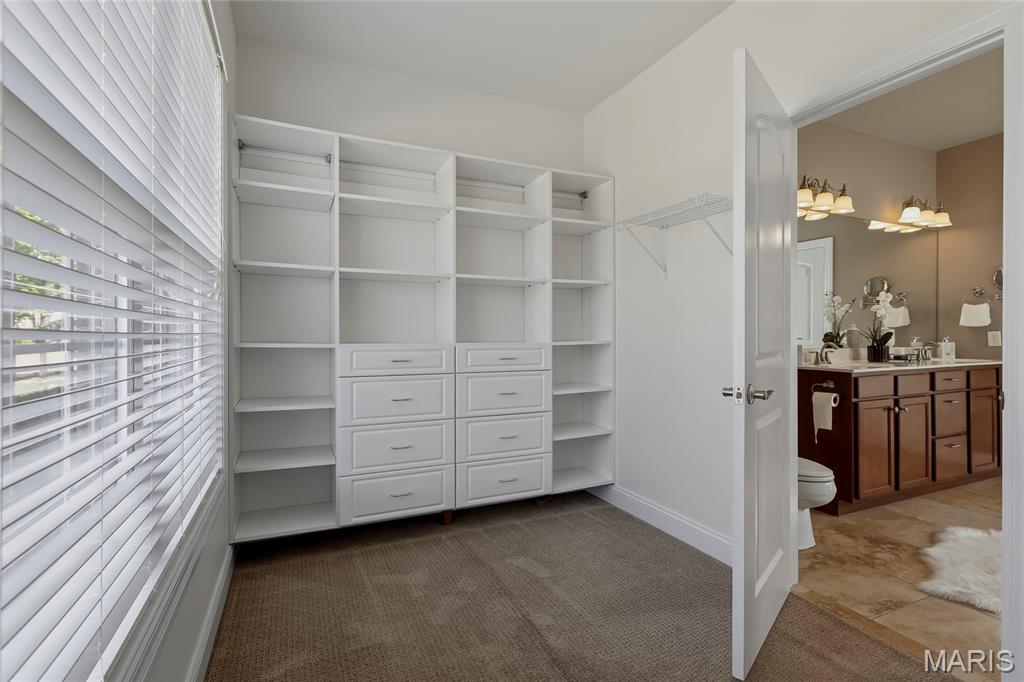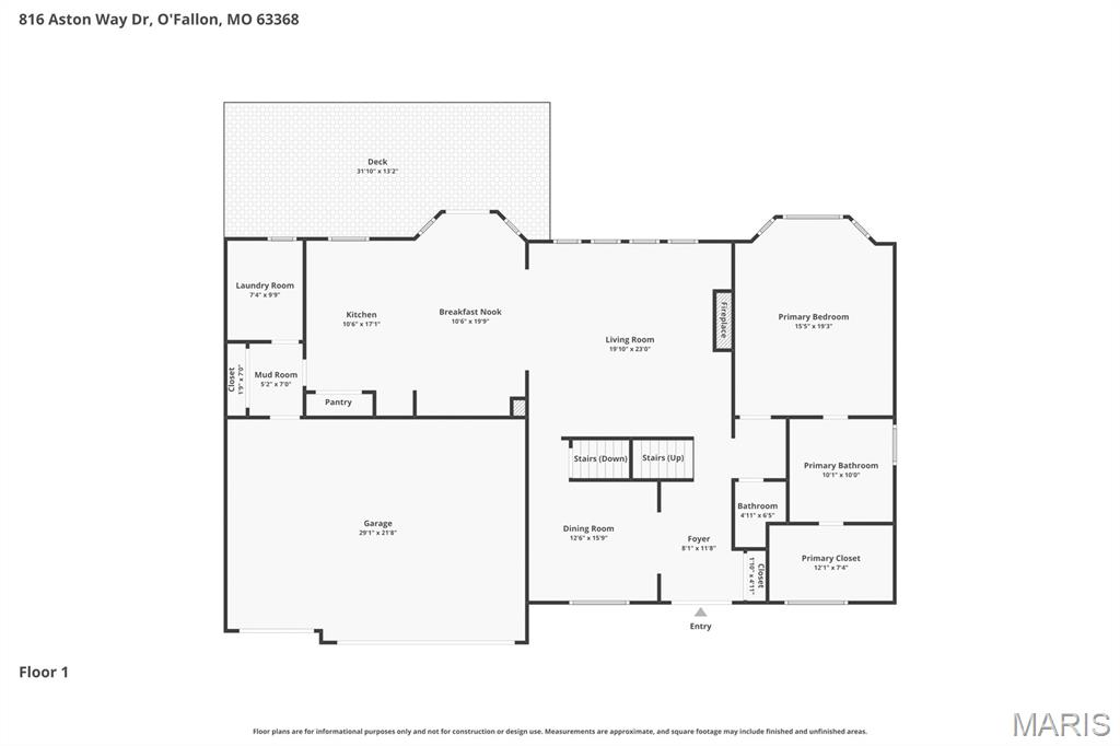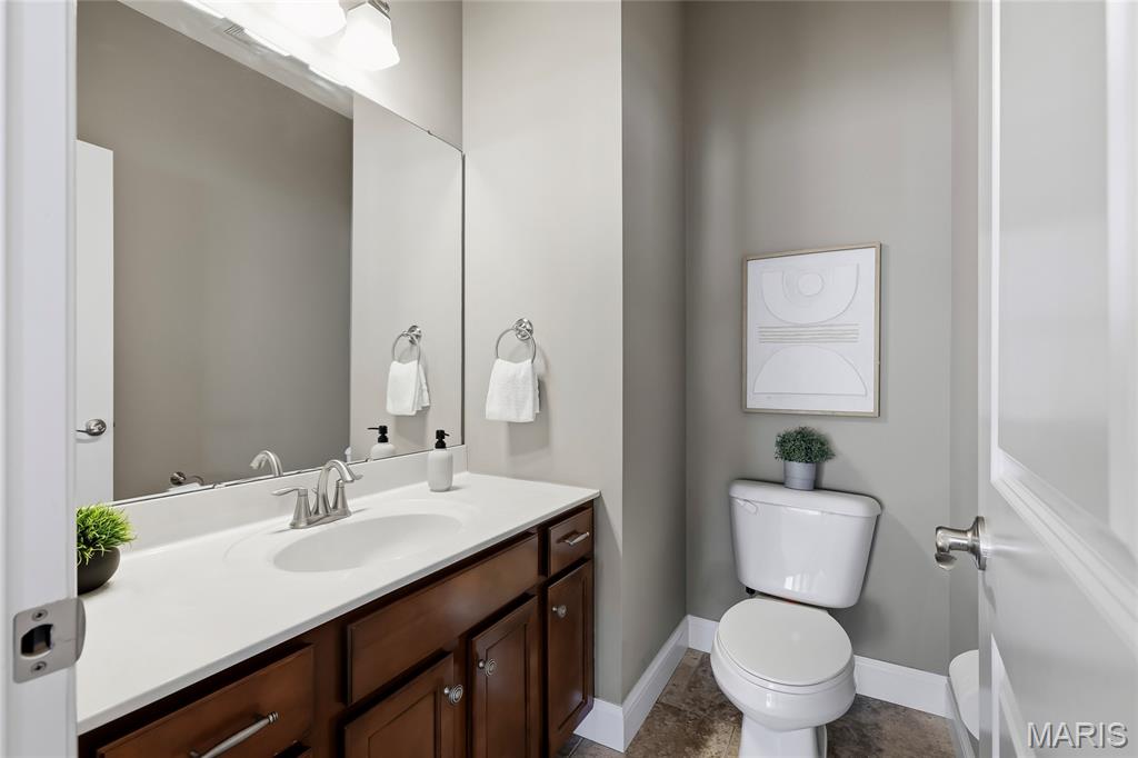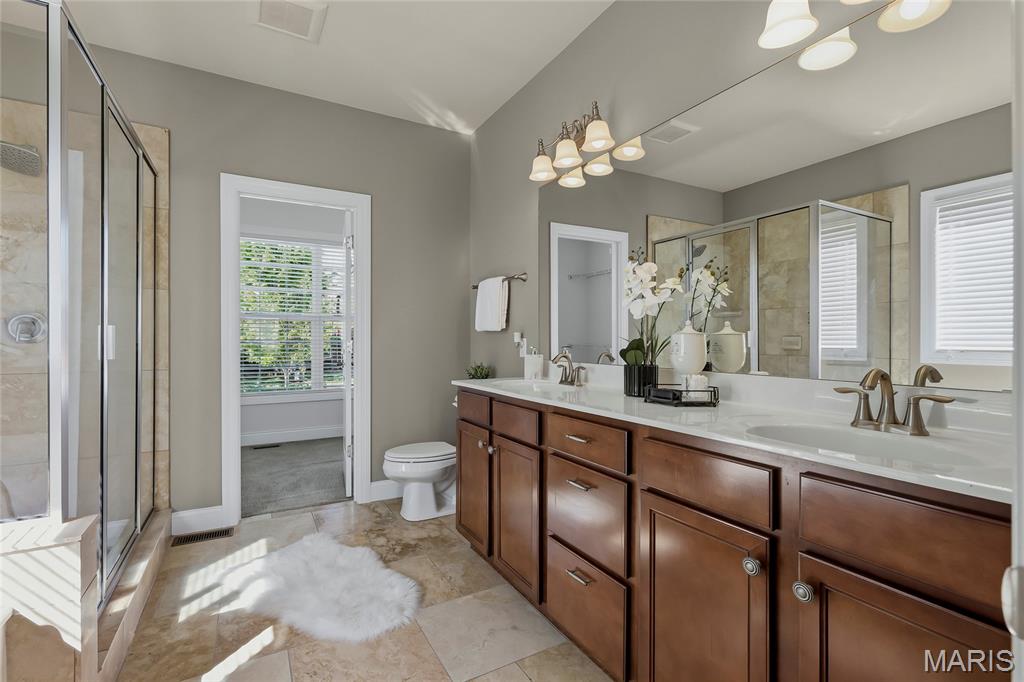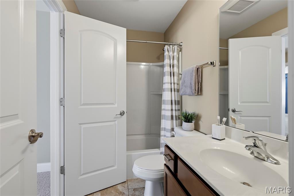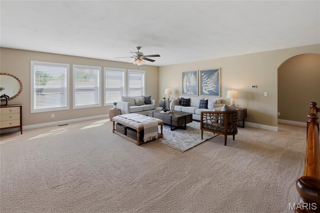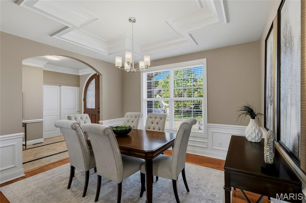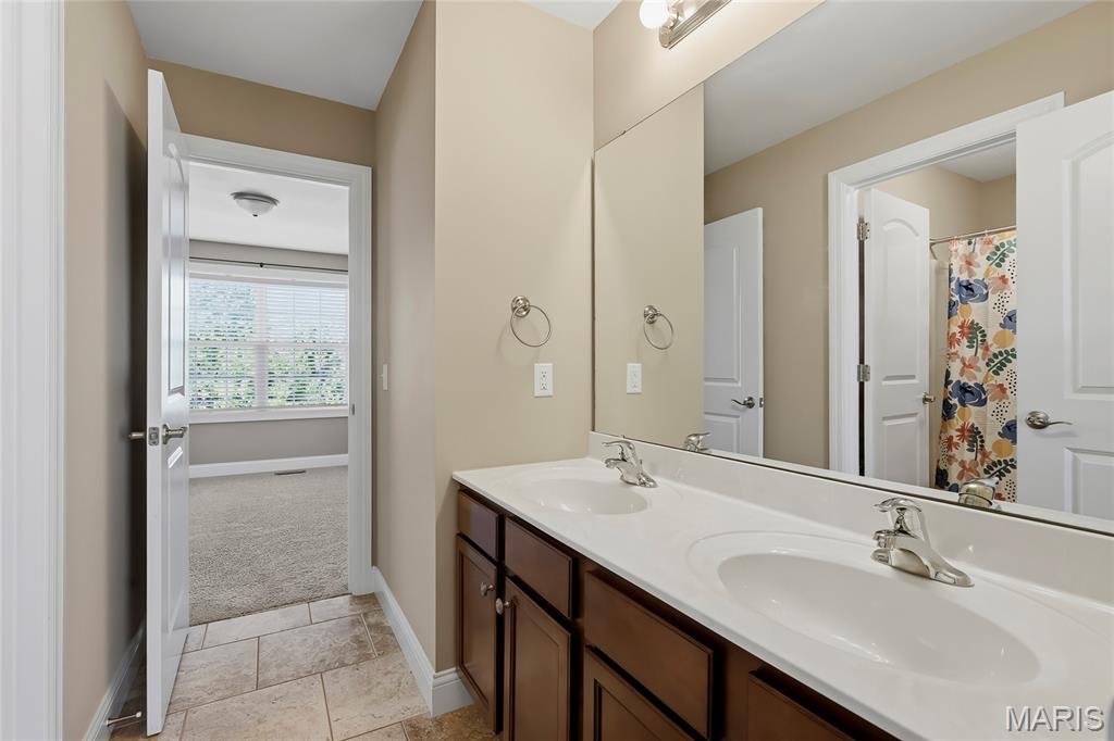 Open Sun, 4/26, 12-2pm. Stunning 1.5 story home located in the sought after Manors of Fieldstone Farms subdivision in O'Fallon! This home boasts over 5,000 square feet of living space with 5 bedrooms, 4.5 bathrooms, and finished lower level. The front door opens to the entry foyer with a coat closet and tile floors. The entry foyer opens to the formal dining room with gleaming hardwood floors, a coffered ceiling, and wainscoting. The living room features a gas fireplace, built-in bookshelves, wall of windows, and opens to the kitchen. The kitchen boasts 42 inch cabinetry with crown molding, granite countertops, soft close drawers, stainless steel appliances, new gas range (2025), new microwave (2026), refrigerator which is included, a tile backsplash, center island, pantry, planning desk, and dining area with a bay window. The primary bedroom features a bay window, walk-in closet with custom shelving, and a luxurious bathroom with a dual vanity, tile floors, soaking tub, and separate shower with a tile surround. The powder room, mud room with a closet, and laundry room with a utility sink complete the main level. The second floor features a huge loft and 4 bedrooms. One bedroom has dual closets and double doors. Another bedroom has a private full bathroom and walk-in closet. The other two bedrooms have walk-in closets and a Jack and Jill bathroom. The finished, walkout lower level boasts a huge recreation room, full bathroom, home theatre, and ample storage space. The recreation room features a gas fireplace, wainscoting, built-in speakers, and a custom wet bar with granite countertops, a tile backsplash, colored LED lights, and beer taps. Other highlights include: 3 car garage, new roof (2025), new humidifier (2024), arched 2 panel doors throughout, wrought iron spindles, crown molding throughout most of the main level, archways throughout most of the main level, irrigation system, zoned HVAC, water softener, and painted neutral colors throughout. Relax outside on the wood back deck with a pergola and retractable shade, or on the stone back patio and enjoy the level yard! The patio boasts a pergola with a fan, TV mount, custom fireplace, firepit area, and speakers. Location could not be better – close to major highways, restaurants, shops, schools, and walking distance to the subdivision pool!
