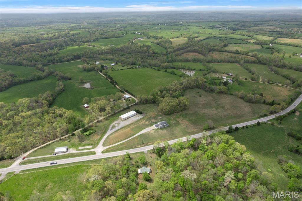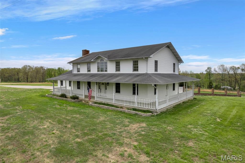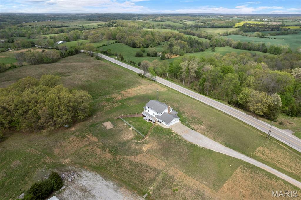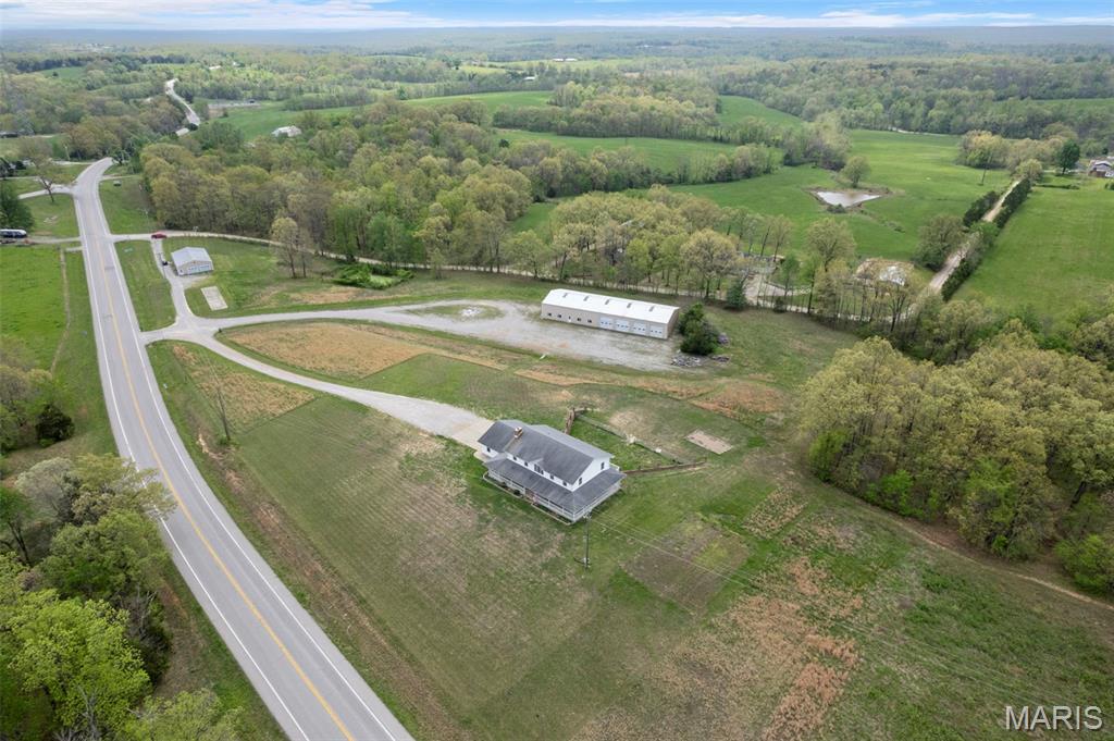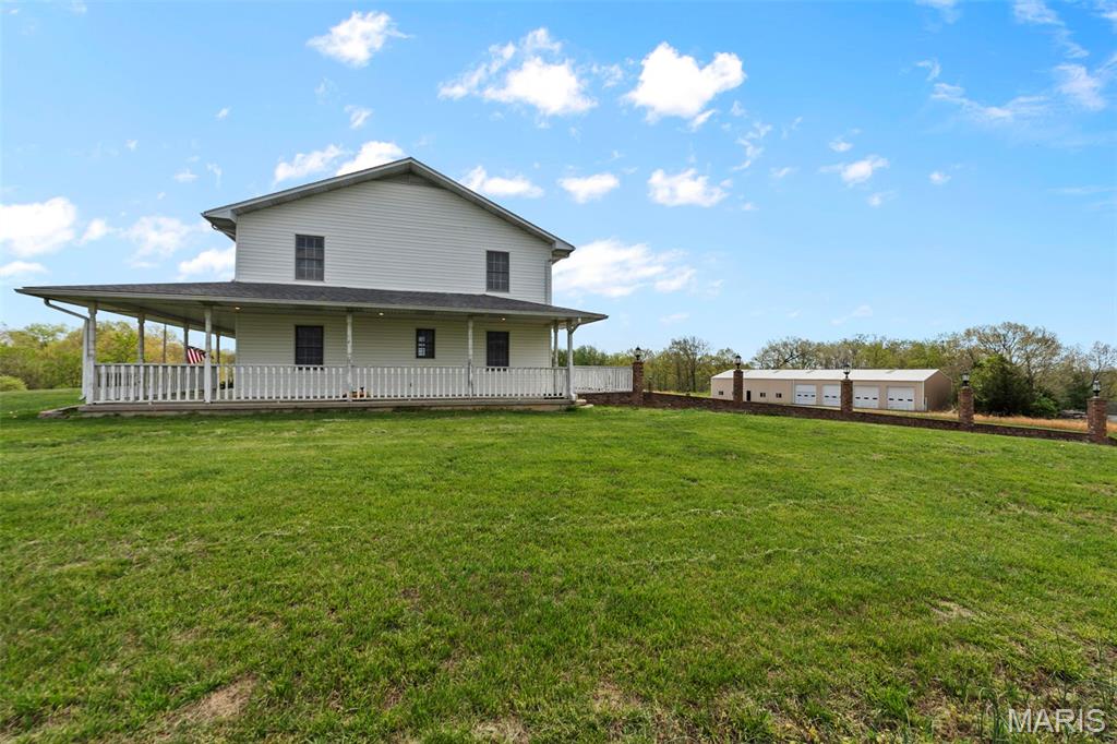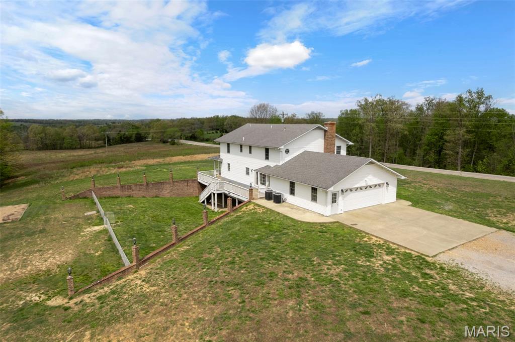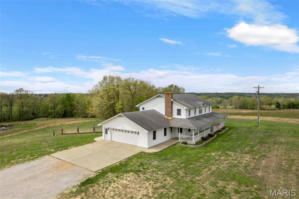 A truly rare and exceptional offering, this one-of-a-kind property features a stunning 5-bedroom, 4.5-bath home with approximately 3,600 square feet of living space, perfectly positioned atop 21.55 acres to capture breathtaking sunset views. A charming wrap-around porch invites you to relax and take in the peaceful surroundings and stunning vista. The property is further enhanced by impressive outbuildings, including a 5,000-square-foot, four-bay shop that has previously generated income as camper/equipment storage, as well as a smaller outbuilding that has been newly remodeled into a one-bedroom efficiency apartment with a two-car garage, offering excellent potential for guest accommodations, rental income, or a private workspace. Inside the home, a welcoming foyer leads to an upper level featuring four spacious bedrooms and two full bathrooms. Entering through the attached heated garage brings you into a beautifully designed kitchen and dining area, complete with a large island and direct access to an expansive deck—perfect for entertaining. The kitchen has been updated with refinished cabinets, adding a fresh and modern touch. The main level also offers a generous living room with a cozy fireplace, a private primary en suite, a dedicated office, and an additional bathroom. The partially finished basement expands the living space with a wood-burning fireplace, hot tub area, bathroom, game room, and ample storage. Recent updates throughout the home include NEW flooring throughout the main and upper levels, along with NEW AC units. Combining scenic acreage, versatile outbuildings, and thoughtfully updated living spaces, this property presents a unique opportunity for both personal enjoyment and potential income.