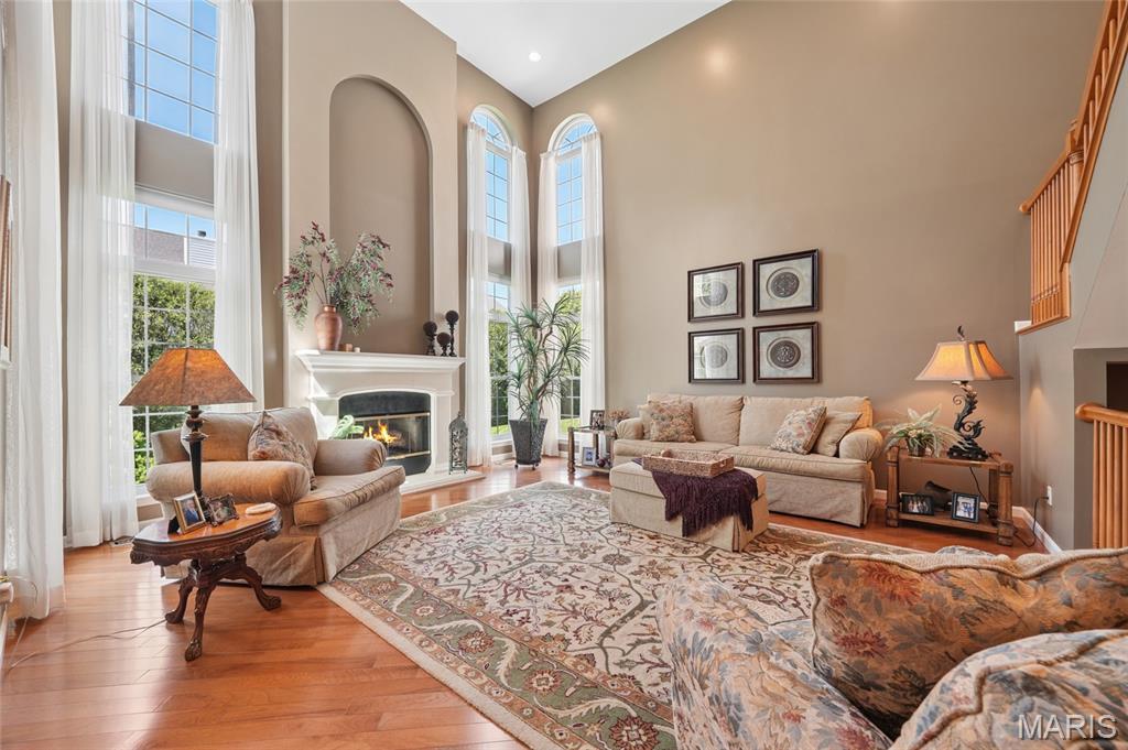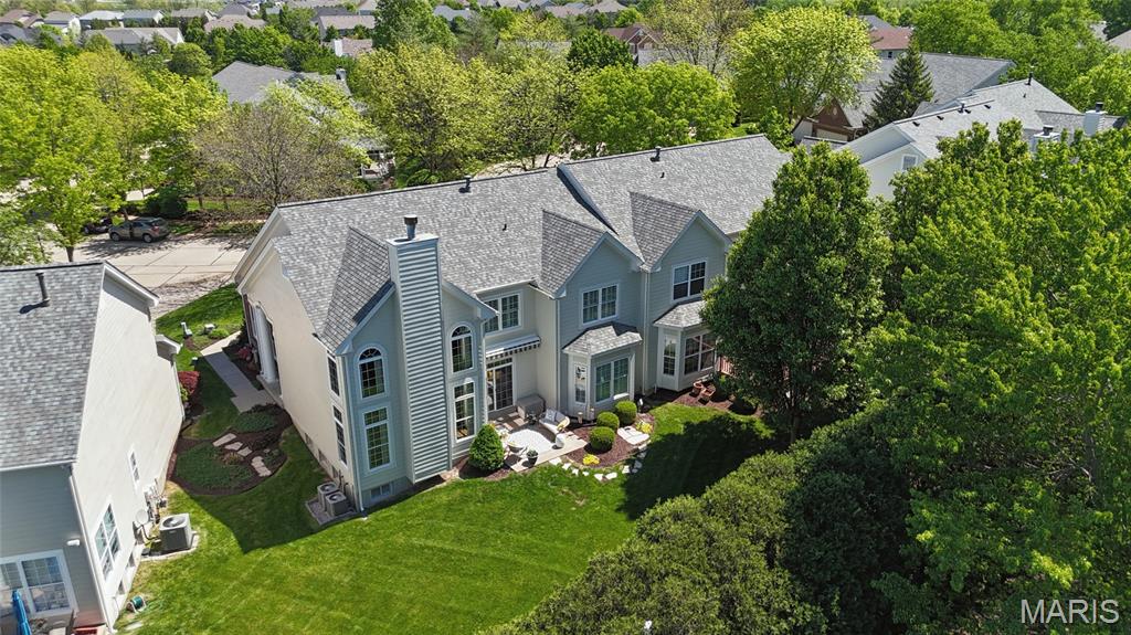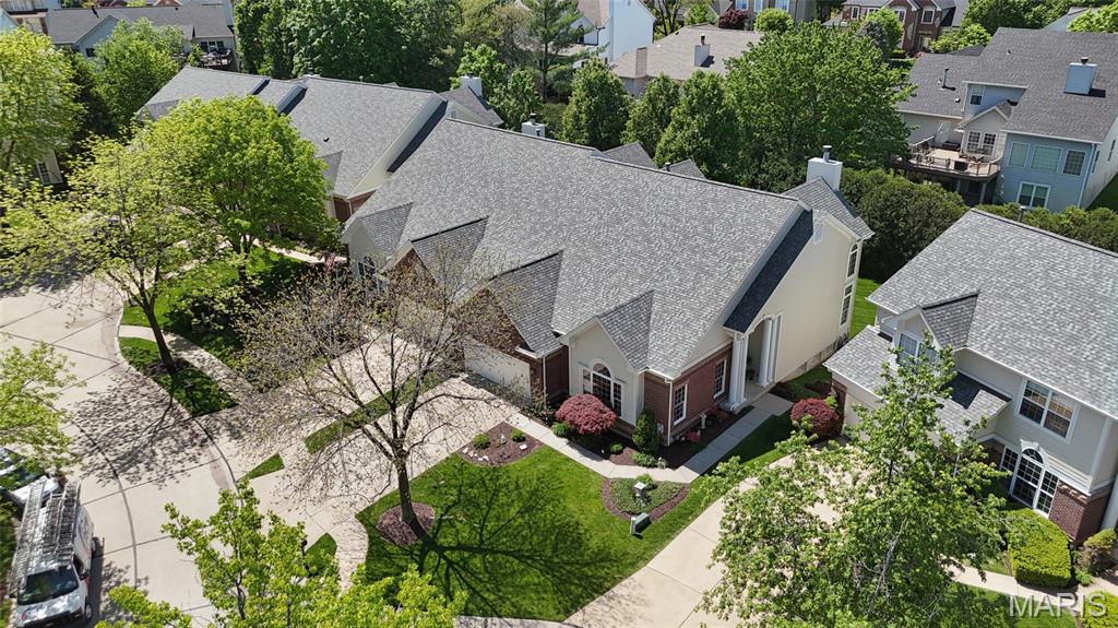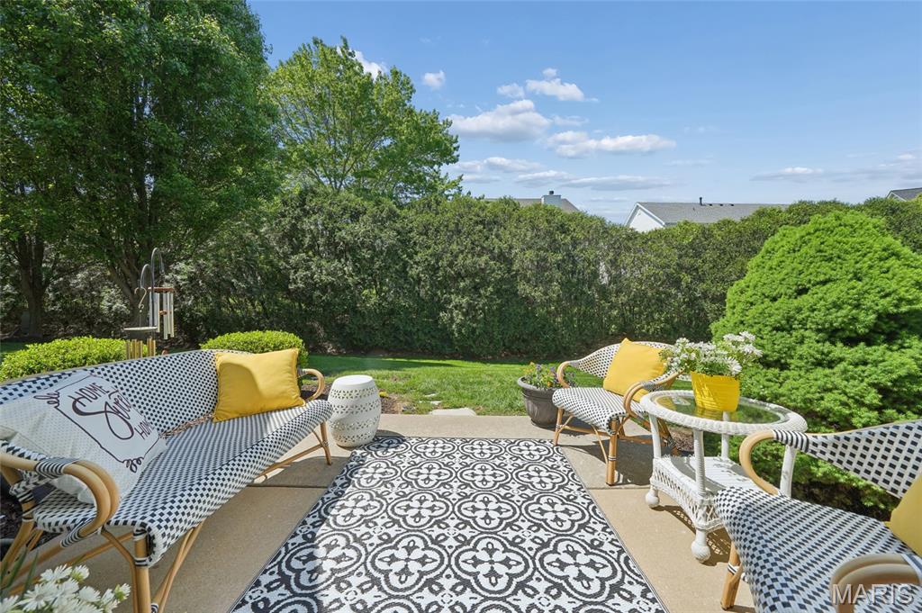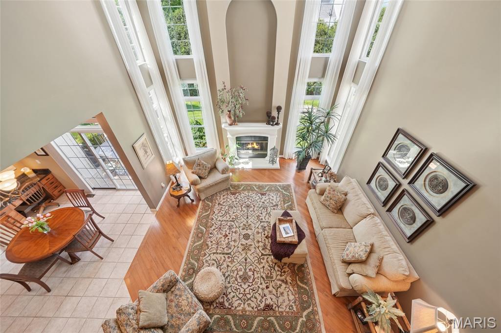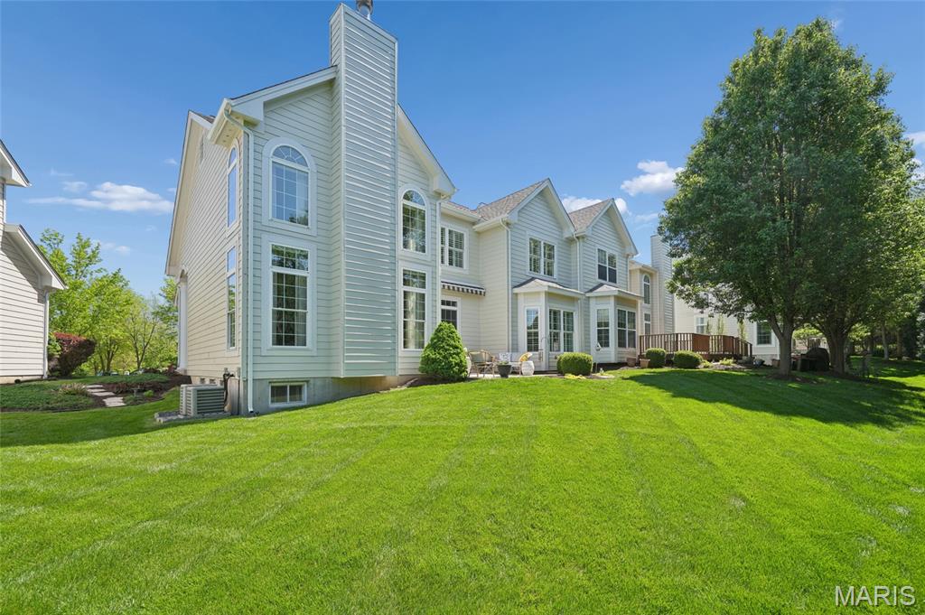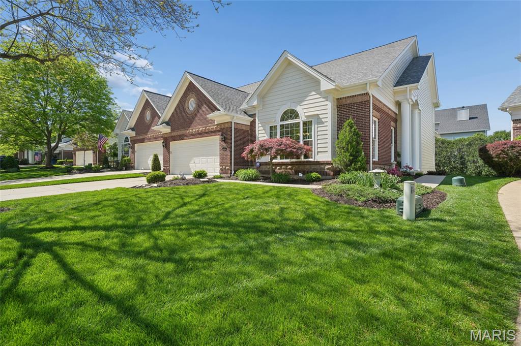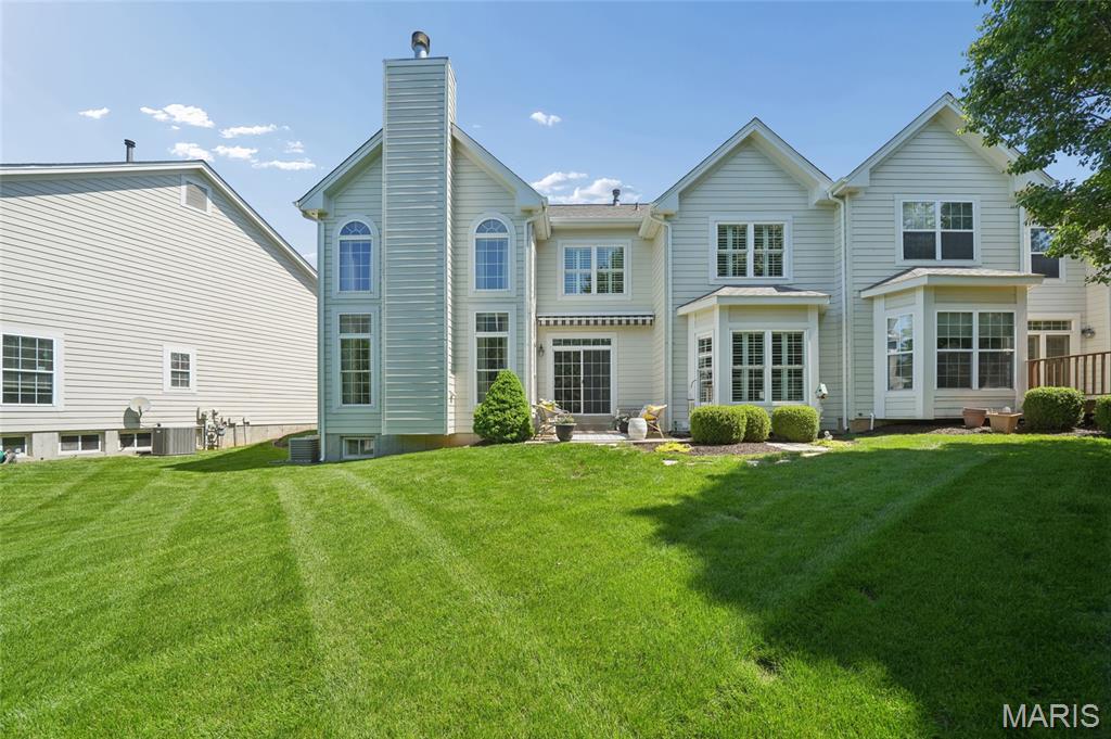 Sophisticated villa living in the heart of Chesterfield! Discover this stunning villa, perfectly situated for a lifestyle of convenience and comfort. Boasting many updates and an open floor plan, this home is designed for both entertaining and effortless daily living. The heart of the home is a magnificent two-story great room, where floor-to-ceiling windows bathe the space in natural light. Rich wood floors flow seamlessly toward a cozy gas fireplace, creating an inviting atmosphere. For formal gatherings, the dining and living room combination impresses with crown molding, soaring ceilings, and expansive windows. The kitchen is as functional as it is beautiful, featuring a center island and sleek smooth cooktop, microwave/convection double oven, tile backsplash and under cabinet lighting. Functional extras include a planning desk and a bright breakfast room that opens directly to your private patio and a tree lined backyard. Retreat to the main floor primary bedroom suite, featuring warm hardwood floors, bay window, plantation shutters and an updated bath. Enjoy dual sinks, a vanity with abundant storage, soaking tub, separate shower and a large walk-in closet. The main level is completed by a half bath and a spacious laundry room with a dedicated closet and extra storage/hanging space. An open staircase leads to the second floor, where a versatile loft overlooks the great room. This space is elevated by a built-in bookcase and entertainment center, perfect for a home library or media hub. Two additional spacious bedrooms—each featuring plantation shutters—share an updated full bath with tiled floor and tub surround. The lower level expands your living space with a family room and a third updated full bath, while still leaving plenty of unfinished area for all your storage needs. Peace of mind comes standard with zoned HVAC, newer windows and a newer roof. Minutes away from shopping and dining, the amphitheater and quick 40/64 access for an easy commute in this convenient Chesterfield location! Welcome home!