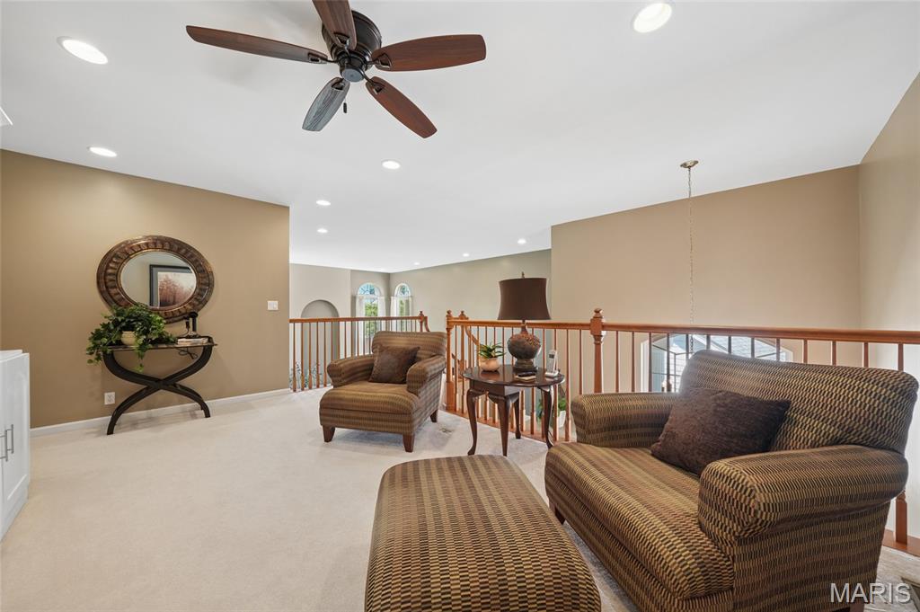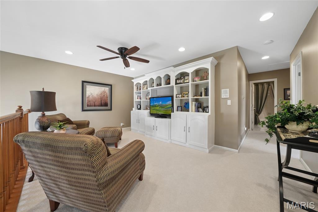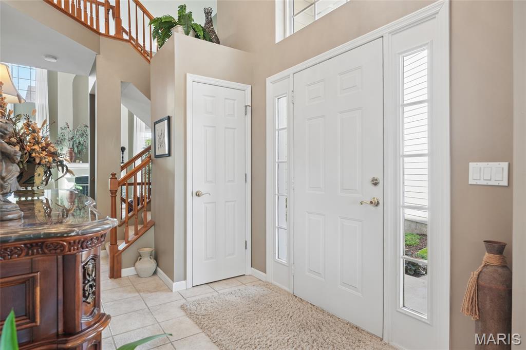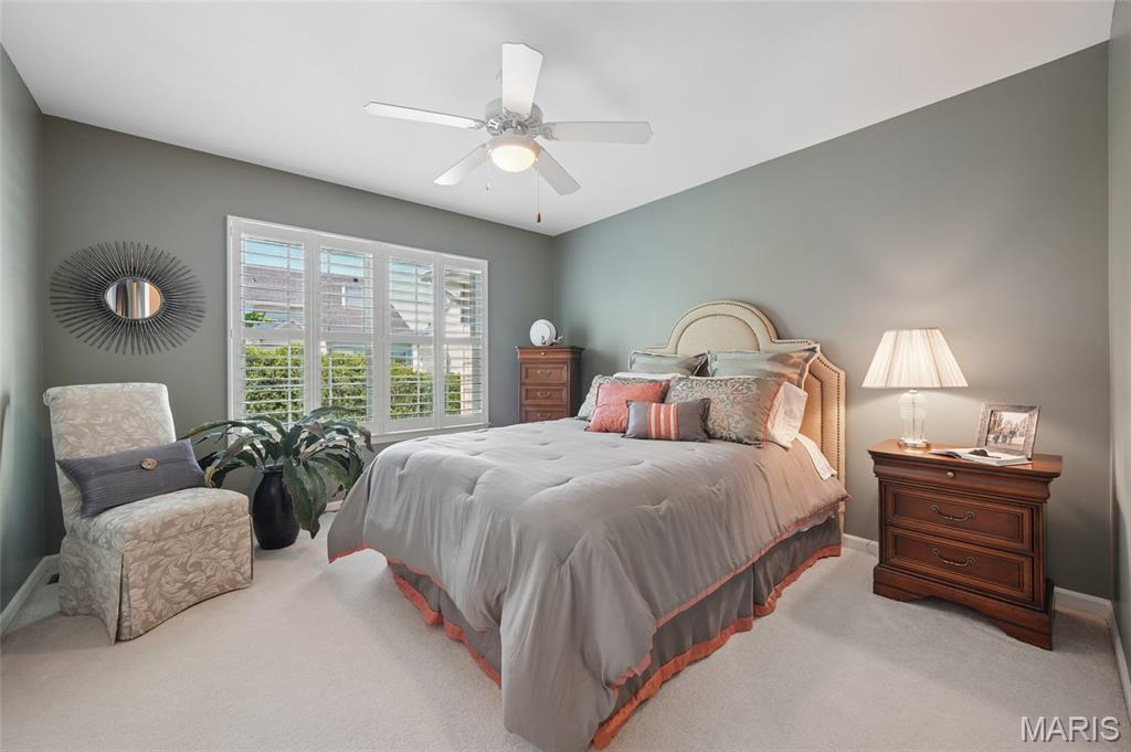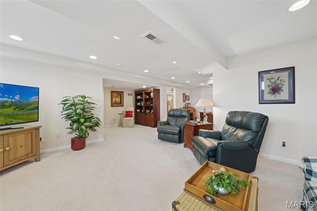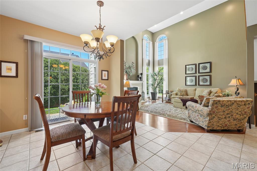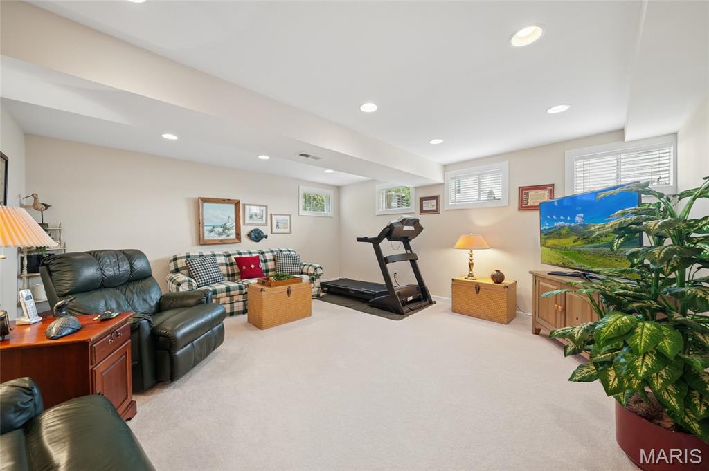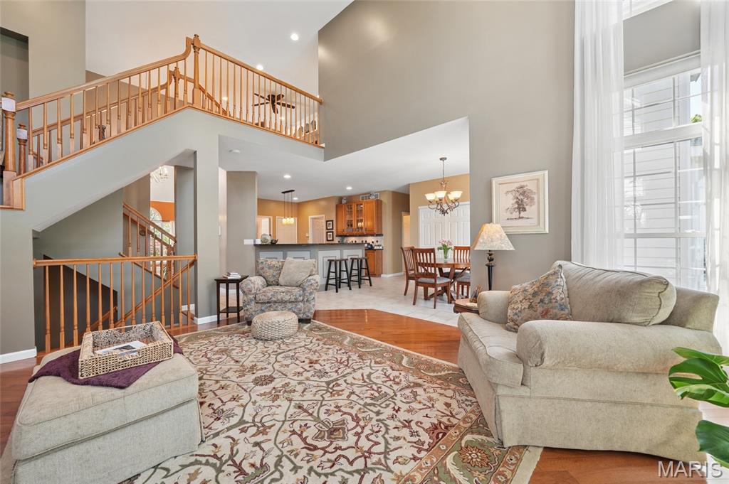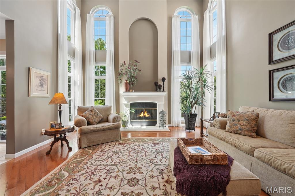 Sophisticated villa living in the heart of Chesterfield! Discover this stunning villa, perfectly situated for a lifestyle of convenience and comfort. Boasting many updates and an open floor plan, this home is designed for both entertaining and effortless daily living. The heart of the home is a magnificent two-story great room, where floor-to-ceiling windows bathe the space in natural light. Rich wood floors flow seamlessly toward a cozy gas fireplace, creating an inviting atmosphere. For formal gatherings, the dining and living room combination impresses with crown molding, soaring ceilings, and expansive windows. The kitchen is as functional as it is beautiful, featuring a center island and sleek smooth cooktop, microwave/convection double oven, tile backsplash and under cabinet lighting. Functional extras include a planning desk and a bright breakfast room that opens directly to your private patio and a tree lined backyard. Retreat to the main floor primary bedroom suite, featuring warm hardwood floors, bay window, plantation shutters and an updated bath. Enjoy dual sinks, a vanity with abundant storage, soaking tub, separate shower and a large walk-in closet. The main level is completed by a half bath and a spacious laundry room with a dedicated closet and extra storage/hanging space. An open staircase leads to the second floor, where a versatile loft overlooks the great room. This space is elevated by a built-in bookcase and entertainment center, perfect for a home library or media hub. Two additional spacious bedrooms—each featuring plantation shutters—share an updated full bath with tiled floor and tub surround. The lower level expands your living space with a family room and a third updated full bath, while still leaving plenty of unfinished area for all your storage needs. Peace of mind comes standard with zoned HVAC, newer windows and a newer roof. Minutes away from shopping and dining, the amphitheater and quick 40/64 access for an easy commute in this convenient Chesterfield location! Welcome home!
