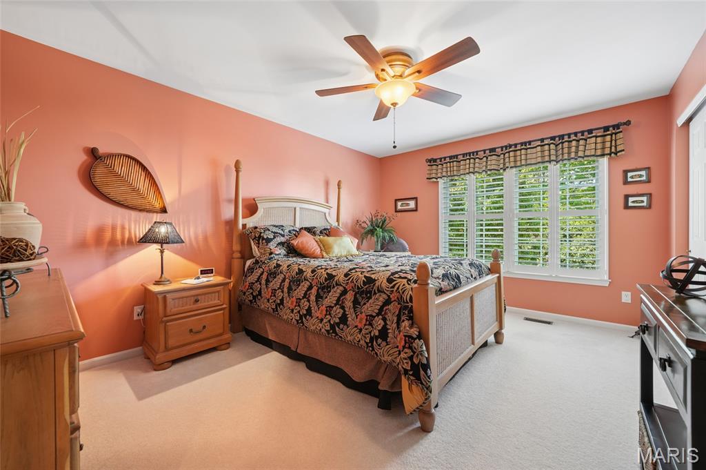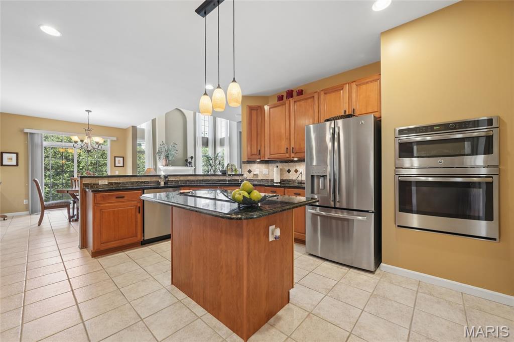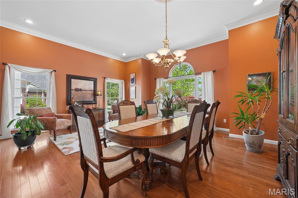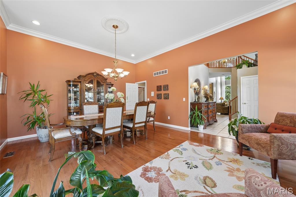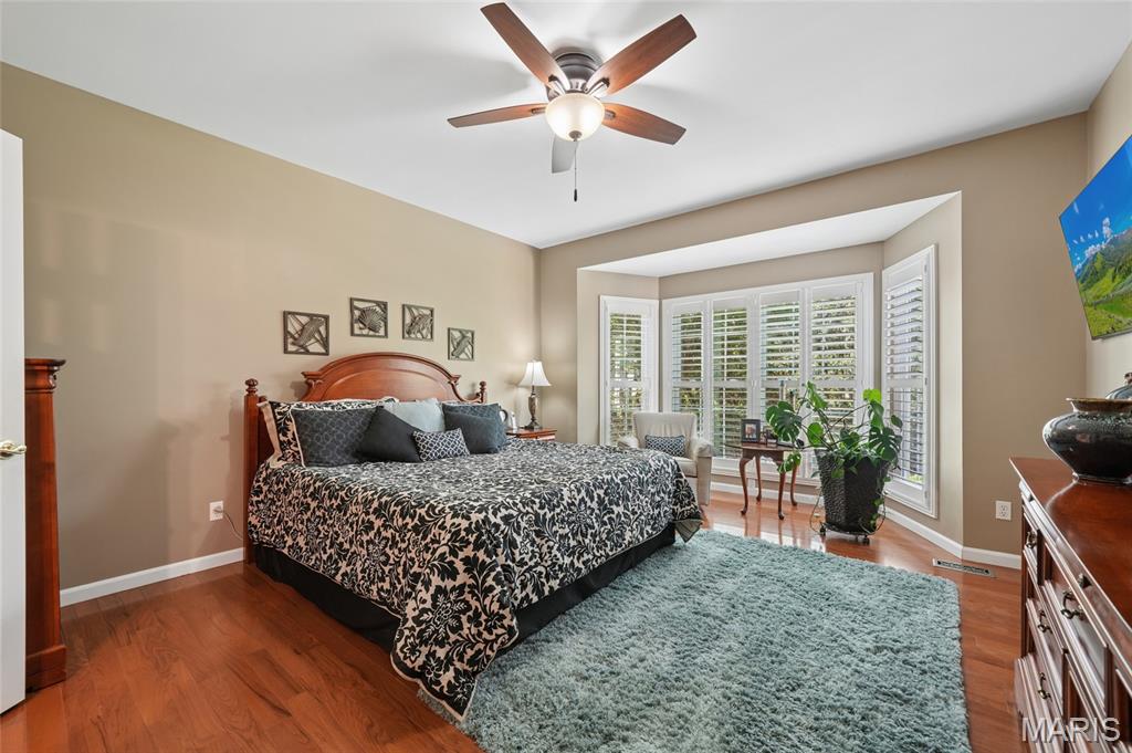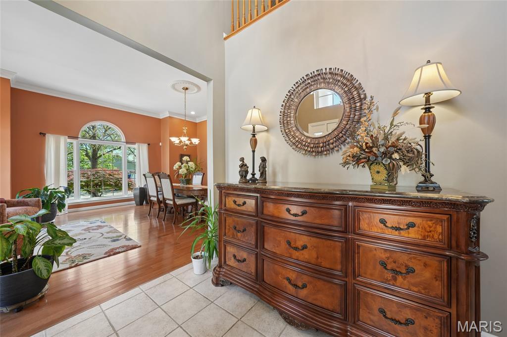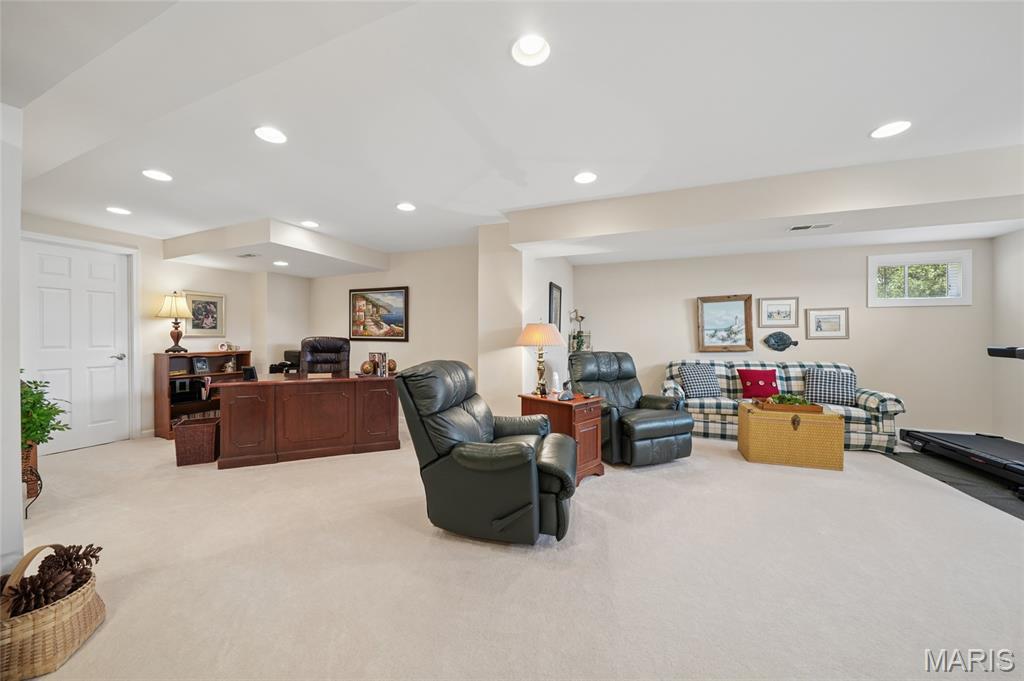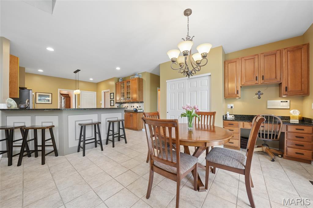 Sophisticated villa living in the heart of Chesterfield! Discover this stunning villa, perfectly situated for a lifestyle of convenience and comfort. Boasting many updates and an open floor plan, this home is designed for both entertaining and effortless daily living. The heart of the home is a magnificent two-story great room, where floor-to-ceiling windows bathe the space in natural light. Rich wood floors flow seamlessly toward a cozy gas fireplace, creating an inviting atmosphere. For formal gatherings, the dining and living room combination impresses with crown molding, soaring ceilings, and expansive windows. The kitchen is as functional as it is beautiful, featuring a center island and sleek smooth cooktop, microwave/convection double oven, tile backsplash and under cabinet lighting. Functional extras include a planning desk and a bright breakfast room that opens directly to your private patio and a tree lined backyard. Retreat to the main floor primary bedroom suite, featuring warm hardwood floors, bay window, plantation shutters and an updated bath. Enjoy dual sinks, a vanity with abundant storage, soaking tub, separate shower and a large walk-in closet. The main level is completed by a half bath and a spacious laundry room with a dedicated closet and extra storage/hanging space. An open staircase leads to the second floor, where a versatile loft overlooks the great room. This space is elevated by a built-in bookcase and entertainment center, perfect for a home library or media hub. Two additional spacious bedrooms—each featuring plantation shutters—share an updated full bath with tiled floor and tub surround. The lower level expands your living space with a family room and a third updated full bath, while still leaving plenty of unfinished area for all your storage needs. Peace of mind comes standard with zoned HVAC, newer windows and a newer roof. Minutes away from shopping and dining, the amphitheater and quick 40/64 access for an easy commute in this convenient Chesterfield location! Welcome home!