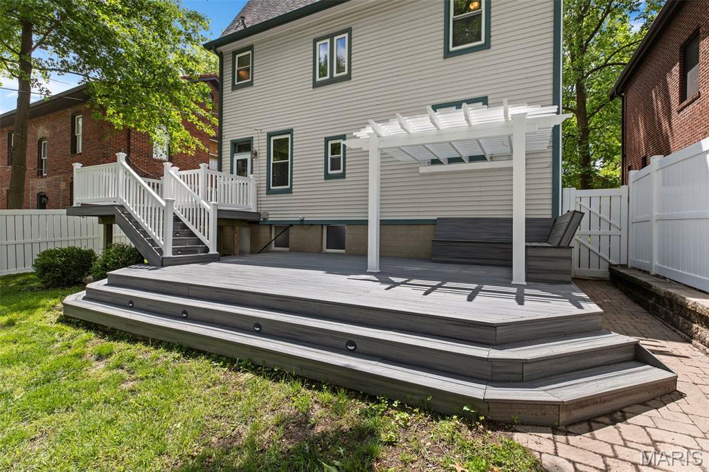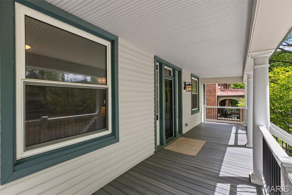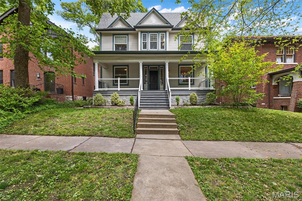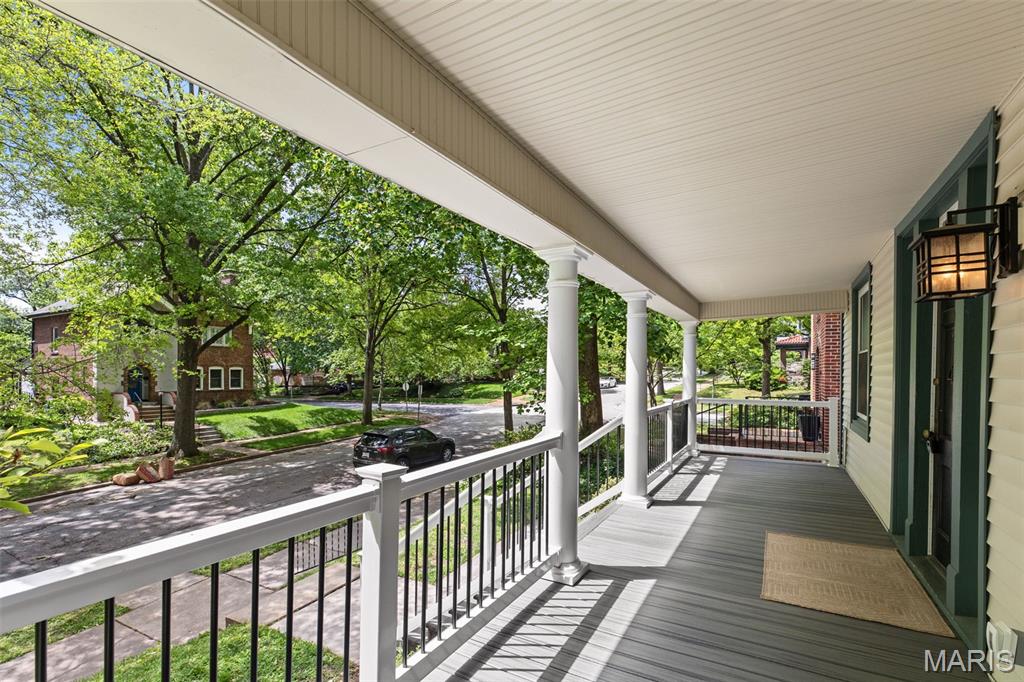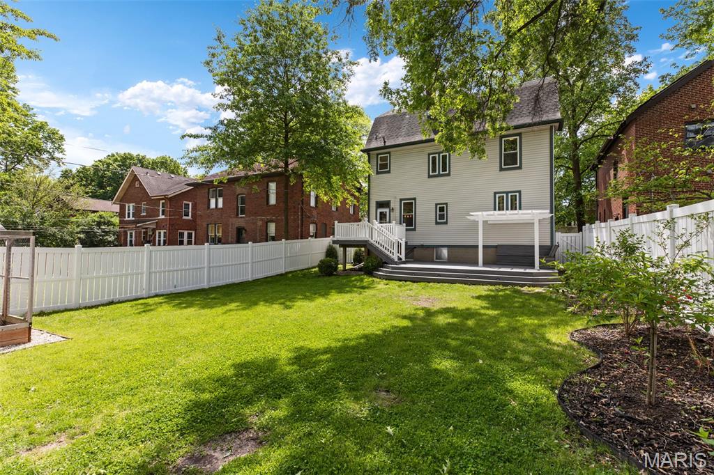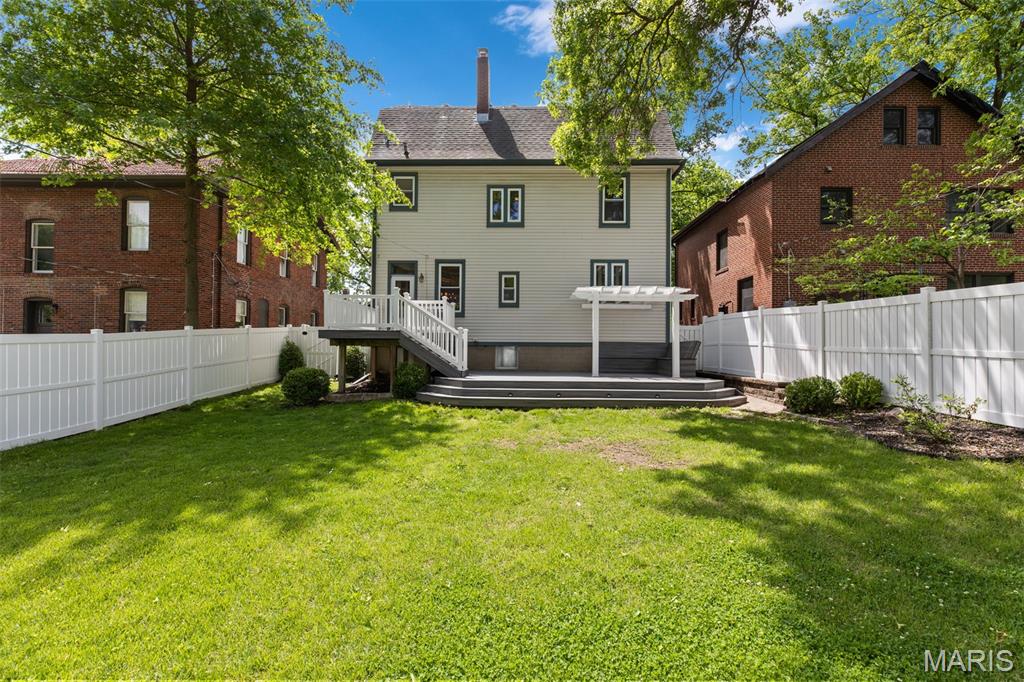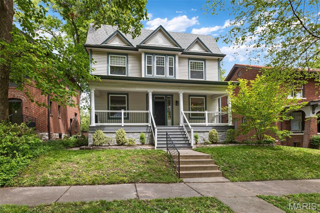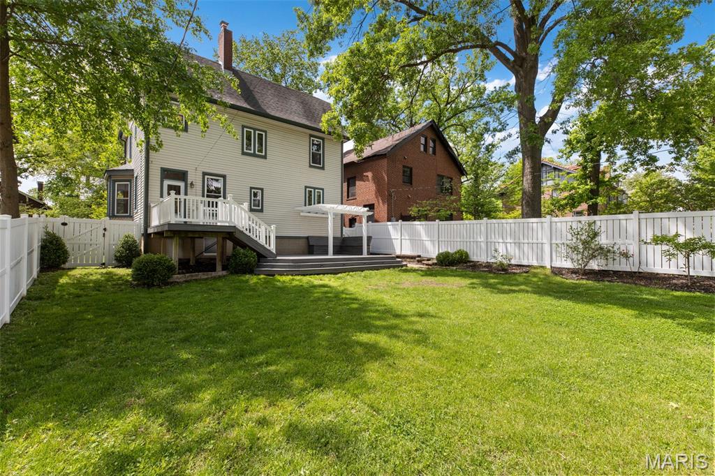 Ideally situated just two blocks from Washington University, this exceptional home has been extensively and tastefully updated throughout while maintaining charming architectural detailing such as original front door sidelights, interior door hardware and gleaming hardwood floors. The newer, generously sized front porch offers ample space, perfect for taking in the tree lined surroundings. The first floor features an open floor plan, living room fireplace and an updated chef’s kitchen with granite countertops, stainless appliances, custom cabinetry, and a decorative glass tile backsplash. The handsome original staircase leads to the spacious second floor master suite that includes plenty of closet space and an updated bathroom with onyx shower walls and vanity tops, plus abundant newer cabinetry. Two additional bedrooms and updated bathroom complete this floor. The third floor includes another full bath and a bedroom with a large adjoining room that could be used as an office, sitting room, or a playroom. This home offers a fresh, light interior. The spacious, fenced backyard with a newer, large deck and built-in seating offers great outdoor space for entertaining family and friends. Conveniently located near downtown Clayton and Forest Park, this home offers an exceptional blend of comfort, character, and convenience.